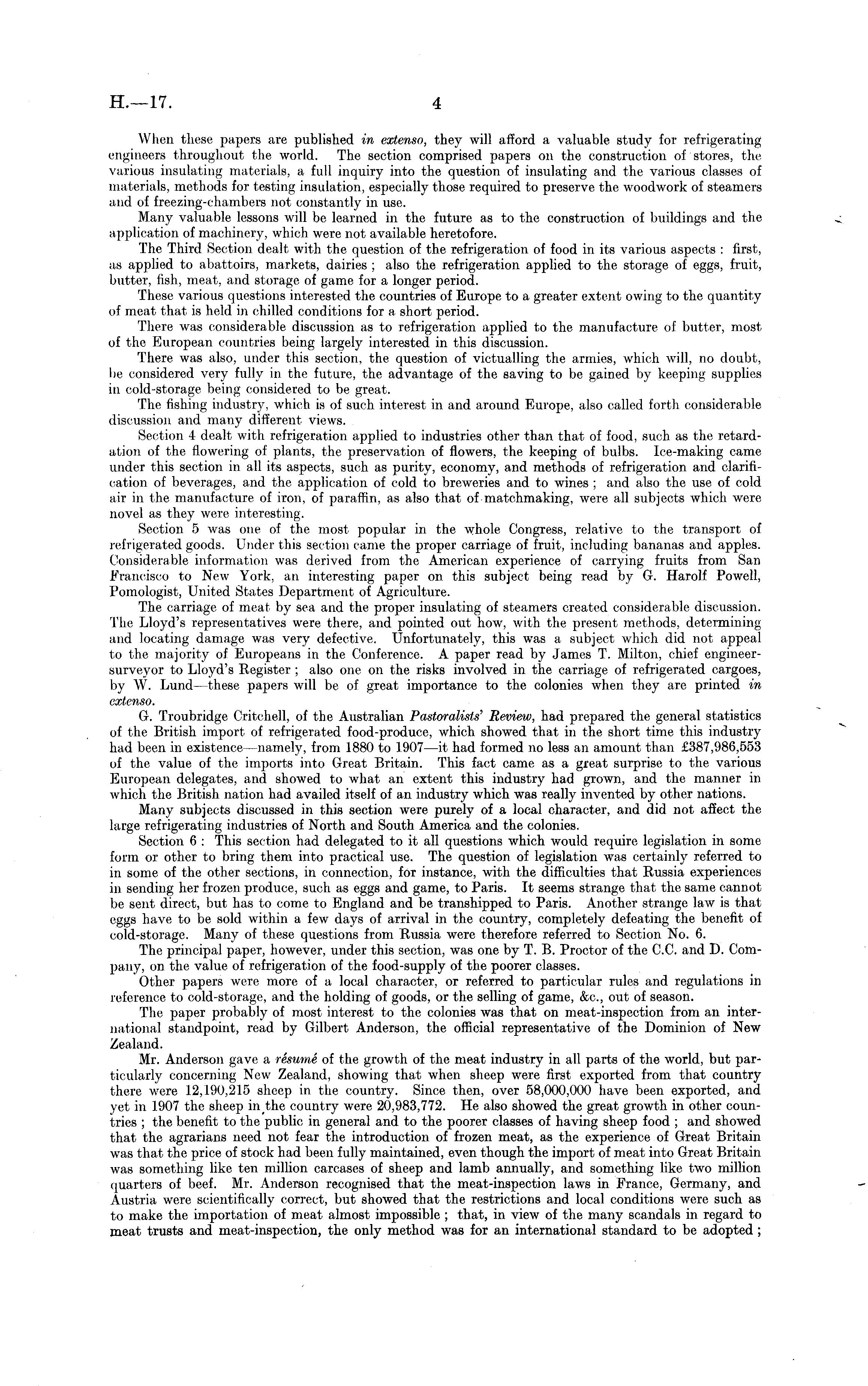 When these papers are published in extenso, they will afford a valuable study for refrigerating engineers throughout the world. The section comprised papers on the construction of stores, the various insulating materials, a full inquiry into the question of insulating and the various classes of materials, methods for testing insulation, especially those required to preserve the woodwork of steamers and of freezing-chambers not constantly in use. Many valuable lessons will be learned in the future as to the construction of buildings and the application of machinery, which were not available heretofore. The Third Section dealt with the question of the refrigeration of food in its various aspects : first, as applied to abattoirs, markets, dairies ; also the refrigeration applied to the storage of eggs, fruit, butter, fish, meat, and storage of game for a longer period. These various questions interested the countries of Europe to a greater extent owing to the quantity of meat that is held in chilled conditions for a short period. There was considerable discussion as to refrigeration applied to the manufacture of butter, most of the European countries being largely interested in this discussion. There was also, under this section, the question of victualling the armies, which will, no doubt, be considered very fully in the future, the advantage of the saving to be gained by keeping supplies in cold-storage being considered to be great. The fishing industry, which is of such interest in and around Europe, also called forth considerable discussion and many different views. Section 4 dealt with refrigeration applied to industries other than that of food, such as the retardation of the flowering of plants, the preservation of flowers, the keeping of bulbs. Ice-making came under this section in all its aspects, such as purity, economy, and methods of refrigeration and clarification of beverages, and the application of cold to breweries and to wines ; and also the use of cold air in the manufacture of iron, of paraffin, as also that of matchmaking, were all subjects which were novel as they were interesting. Section 5 was one of the most popular in the whole Congress, relative to the transport of refrigerated goods. Under this section came the proper carriage of fruit, including bananas and apples. Considerable information was derived from the American experience of carrying fruits from San Francisco to New York, an interesting paper on this subject being read by G. Harolf Powell, Pomologist, United States Department of Agriculture. The carriage of meat by sea and the proper insulating of steamers created considerable discussion. The Lloyd's representatives were there, and pointed out how, with the present methods, determining and locating damage was very defective. Unfortunately, this was a subject which did not appeal to the majority of Europeans in the Conference. A paper read by James T. Milton, chief engineersurveyor to Lloyd's Register ; also one on the risks involved in the carriage of refrigerated cargoes, by W. Lund—these papers will be of great importance to the colonies when they are printed in extenso. G. Troubridge Critchell, of the Australian Pastoralists , Review, had prepared the general statistics of the British import of refrigerated food-produce, which showed that in the short time this industry Lad been in existence—namely, from 1880 to 1907—it had formed no less an amount than £387,986,553 of the value of the imports into Great Britain. This fact came as a great surprise to the various European delegates, and showed to what an extent this industry had grown, and the manner in which the British nation had availed itself of an industry which was really invented by other nations. Many subjects discussed in this section were purely of a local character, and did not affect the large refrigerating industries of North and South America and the colonies. Section 6 : This section had delegated to it all questions which would require legislation in some form or other to bring them into practical use. The question of legislation was certainly referred to in some of the other sections, in connection, for instance, with the difficulties that Russia experiences in sending her frozen produce, such as eggs and game, to Paris. It seems strange that the same cannot be sent direct, but has to come to England and be transhipped to Paris. Another strange law is that eggs have to be sold within a few days of arrival in the country, completely defeating the benefit of cold-storage. Many of these questions from Russia were therefore referred to Section No. 6. The principal paper, however, under this section, was one by T. B. Proctor of the C.C. and D. Company, on the value of refrigeration of the food-supply of the poorer classes. Other papers were more of a local character, or referred to particular rules and regulations in reference to cold-storage, and the holding of goods, or the selling of game, &c, out of season. The paper probably of most interest to the colonies was that on meat-inspection from an international standpoint, read by Gilbert Anderson, the official representative of the Dominion of New Zealand. Mr. Anderson gave a resume of the growth of the meat industry in all parts of the world, but particularly concerning New Zealand, showing that when sheep were first exported from that country there were 12,190,215 sheep in the country. Since then, over 58,000,000 have been exported, and yet in 1907 the sheep in the country were 20,983,772. He also showed the great growth in other countries ; the benefit to the public in general and to the poorer classes of having sheep food ; and showed that the agrarians need not fear the introduction of frozen meat, as the experience of Great Britain was that the price of stock had been fully maintained, even though the import of meat into Great Britain was something like ten million carcases of sheep and lamb annually, and something like two mill