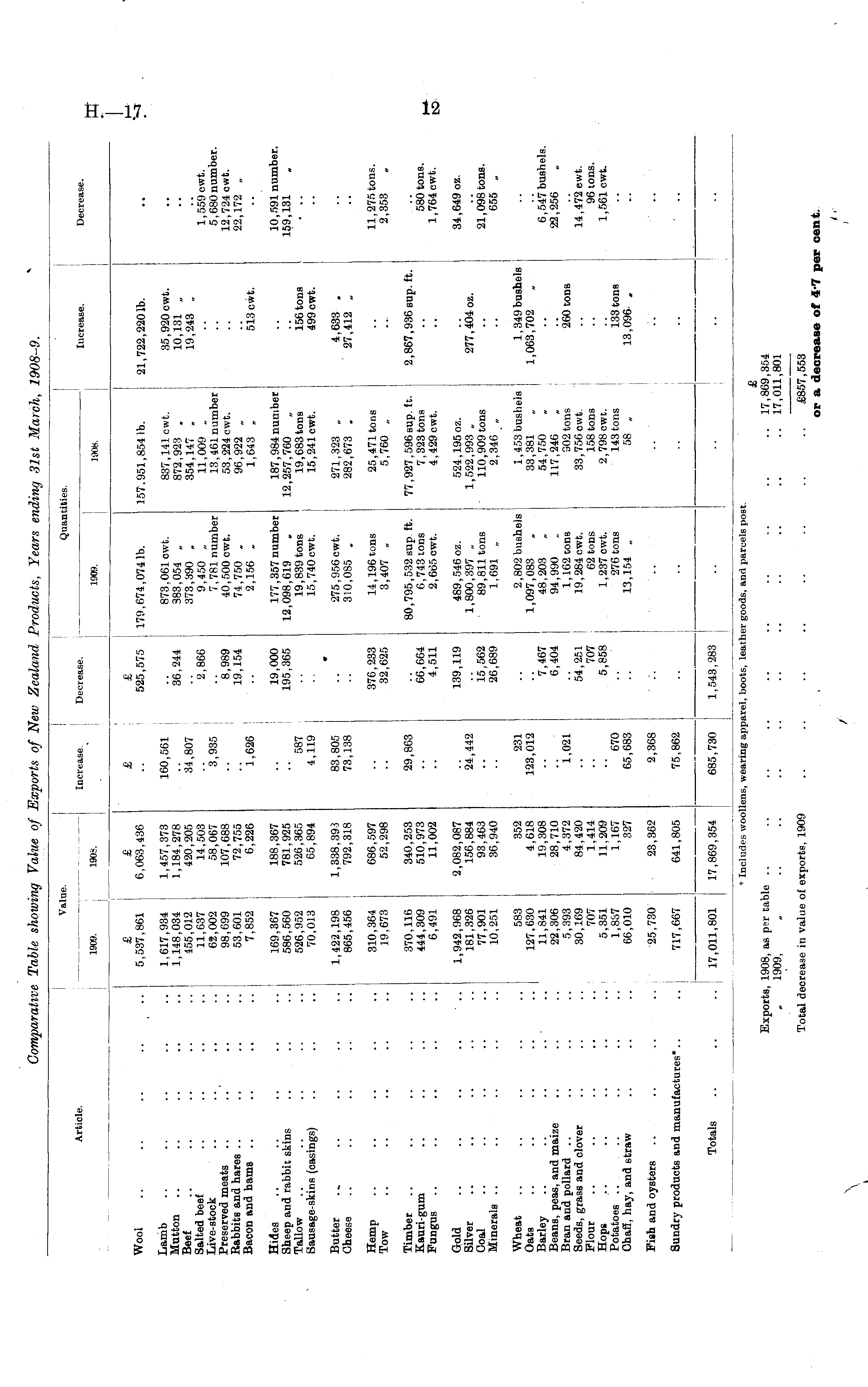 Value. Quantities. 1909. 190S. Increase. Increase. Article. Decrease. 1909. 1908. Wool .. I 5,537,861 £ 6.063,436 £ £ 525,575 179,674,0741b. 157.951,8541b. 21,722,2201b. Lamb Mutton Beef Salted beef Live-stock Preserved meats Rabbits and hares Baeon and hams 1,617,934 1,148,034 155,012 11,637 62,002 98,699 53,601 7,852 1,457,373 1,184,278 420,205 14.503 58,067 107,688 72,755 6,226 160,561 34,807 3,935 1,626 36,244 2,866 8,989 19,154 19,000 195,365 873,061 cwt. 383,054 „ 373,390 „ 9,450 „ 7,781 number 40,500 cwt. 74,750 » 2,156 „ 837,141 cwt. 872,923 . 354,147 „ 11,009 „ 13,461 number 53,224 cwt. 96,922 „ 1,643 „ 35,920 cwt. 10,131 „ 19,243 „ 1,559 cwt. 5,680 number. 12,724 cwt. 22,172 „ 513 cwt. Hides Sheep and rabbit skins Tallow .. .. .. .. Sausage-skins (casings) 169,367 586,560 526,952 70,013 188,367 781,925 526,365 65,894 177, 357 number 12,098,619 19,839 tons 15,740 cwt. 187,984 number 12,257,760 „ 19,683 tons 15,241 cwt. 156 tons 499 cwt. 10,591 number. 159,131 587 4,119 I Butter Cheese 1,422,198 865,456 1,338,393 792,318 83,805 73,138 275. 956 cwt. 310,085 „ 271,323 „ 282,673 , 4,633 . 27,412 „ Hemp Tow 310,364 19,673 686,597 52,298 376,233 32,625 14,196 tons 3,407 „ 25,471 tons 5,760 „ 11,275 tons. 2,353 Timber .. Kauri-gum Fungus 370,116 444,309 6,491 340,253 510,973 11,002 29,863 66,664 4,511 80,795,532 sup. ft. 6,743 tons 2,665 cwt. 77,927,596 sup. ft. 7,323 tons 4,429 cwt. 2,867,936 sup. ft. 580 tons. 1,764 cwt. Gold Silver Coal Minerals 1,942,968 181,326 77,901 10,251 2,082,087 156,884 93,463 36,940 24,442 139,119 15,562 26,689 489,546 oz. 1,800,397 „ 89,811 tons 1.691 „ 524, 195 oz. 1,522,993 „ 110, 909 tons 2,346 „ 277,404 oz. 34,649 oz. 21,098 tons. 655 „ Wheat Oats Barley .. .. .. Beans, peas, and maize Bran and pollard Seeds, grass and clover Flour Hops Potatoes .. ... Chaff, hay, and straw 583 127,630 11,841 22,306 5,393 30,169 707 5,351 1,887 66,010 352 4,618 19,308 28,710 4,372 84,420 1,414 11,209 1,167 327 231 123,012 1,021 7,467 6,404 54,251 707 5,858 2,802 bushels 1,097,083 48.203 „ 94,990 1,162 tons 19,284 cwt. 62 tons 1,237 cwt. 276 tons 13,154 „ 1,453 bushels 33,381 54,750 „ 117,246 302 tons 33,756 cwt. 158 tons 2,798 cwt. 143 tons 58 „ 1,349 bushels 1,063,702 „ 260 tons 6,547 bushels. 22,256 14,472 cwt. 96 tons. 1,561 cwt. i 670 65,683 133 tons 13,096 „ Fish and oysters 25,730 23,362 2,368 Sundry products and manufactures*.. 717,667 641,805 75,862 Totals 17,011,801 17,869,354 685,730 1,543,283 1,543,283 * Includes woollens, wearing appi trel, boots, leather goods, and parcels post.