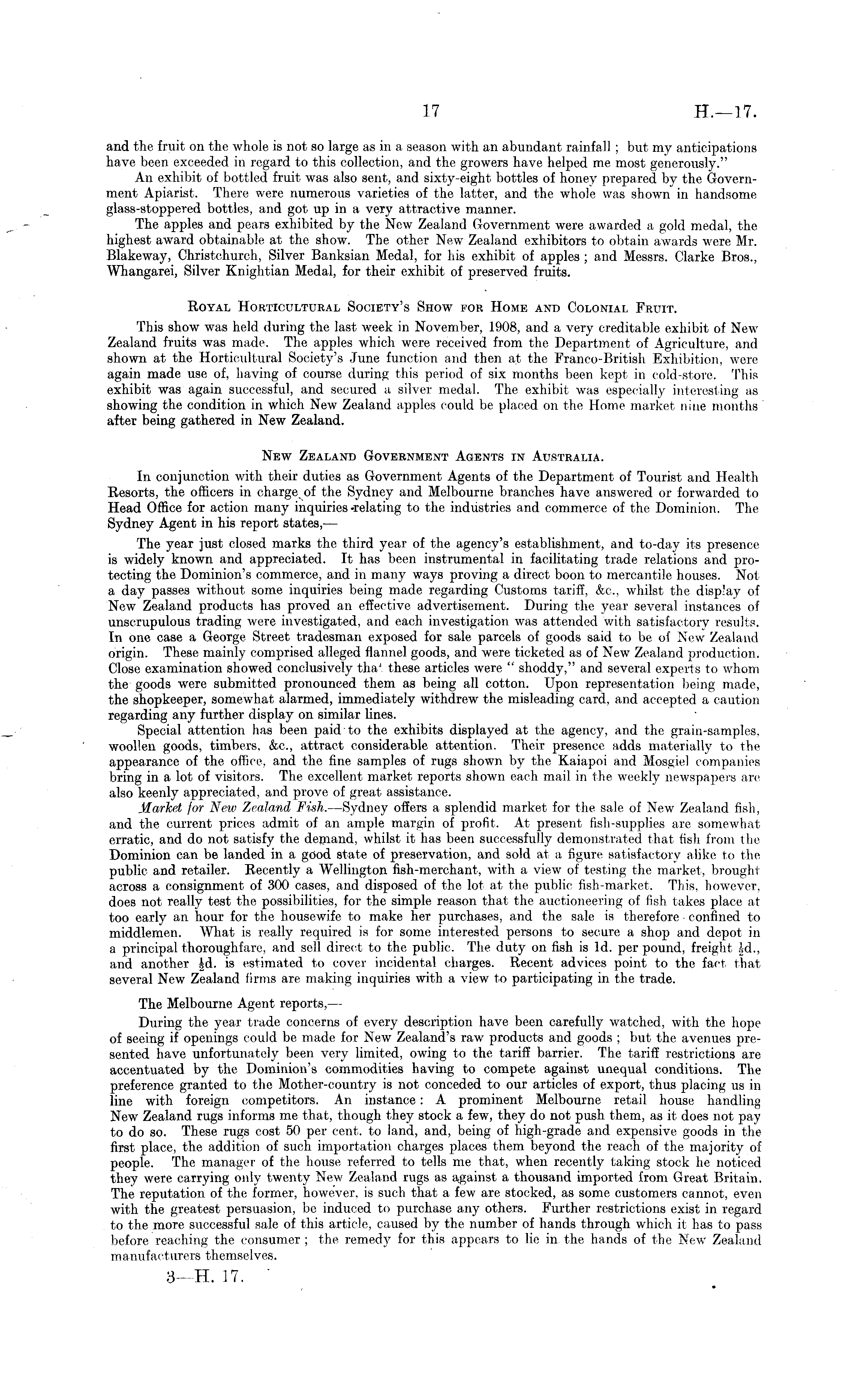 and the fruit on the whole is not so large as in a season with an abundant rainfall ; but my anticipations have been exceeded in regard to this collection, and the growers have helped me most generously." An exhibit of bottled fruit was also sent, and sixty-eight bottles of honey prepared by the Government Apiarist. There were numerous varieties of the latter, and the whole was shown in handsome glass-stoppered bottles, and got up in a very attractive manner. The apples and pears exhibited by the New Zealand Government were awarded a gold medal, the highest award obtainable at the show. The other New Zealand exhibitors to obtain awards were Mr. Blakeway, Christchureh, Silver Banksian Medal, for his exhibit of apples ; and Messrs. Clarke Bros., Whangarei, Silver Knightian Medal, for their exhibit of preserved fruits. Koyal Horticultural Society's Show for Home and Colonial Fruit. This show was held during the last week in November, 1908, and a very creditable exhibit of New Zealand fruits was made. The apples which were received from the Department of Agriculture, and shown at the Horticultural Society's June function and then at the Franco-British Exhibition, were again made use of, having of course during this period of six months been kept in cold-store. This exhibit was again successful, and secured a silver medal. The exhibit was especially interesting as showing the condition in which New Zealand apples could be placed on the Home market nine months after being gathered in New Zealand. New Zealand Government Agents in Australia. In conjunction with their duties as Government Agents of the Department of Tourist and Health Resorts, the officers in charge of the Sydney and Melbourne branches have answered or forwarded to Head Office for action many inquiries-relating to the industries and commerce of the Dominion. The Sydney Agent in his report states, — The year just closed marks the third year of the agency's establishment, and to-day its presence is widely known and appreciated. It has been instrumental in facilitating trade relations and protecting the Dominion's commerce, and in many ways proving a direct boon to mercantile houses. Not a day passes without some inquiries being made regarding Customs tariff, &c, whilst the disp'ay of New Zealand products has proved an effective advertisement. During the year several instances of unscrupulous trading were investigated, and each investigation was attended with satisfactory results. In one case a George Street tradesman exposed for sale parcels of goods said to be of New Zealand origin. These mainly comprised alleged flannel goods, and were ticketed as of New Zealand production. Close examination showed conclusively tha' these articles were " shoddy," and several experts to whom the goods were submitted pronounced them as being all cotton. Upon representation being made, the shopkeeper, somewhat alarmed, immediately withdrew the misleading card, and accepted a caution regarding any further display on similar lines. Special attention has been paid to the exhibits displayed at the agency, and the grain-samples, woollen goods, timbers. &c, attract considerable attention. Their presence adds materially to the appearance of the office, and the fine samples of rugs shown by the Kaiapoi and Mosgiel companies bring in a lot of visitors. The excellent market reports shown each mail in (he weekly newspapers are also keenly appreciated, and prove of great assistance. Market for New Zealand Fish. —Sydney offers a splendid market for the sale of New Zealand fish, and the current prices admit of an ample margin of profit. At present fish-supplies are somewhat erratic, and do not satisfy the demand, whilst it has been successfully demonstrated that fish from the Dominion can be landed in a good state of preservation, and sold at a figure satisfactory alike to the public and retailer. Recently a Wellington fish-merchant, with a view of testing the market, brought across a consignment of 300 cases, and disposed of the lot at the public fish-market. Tins, however, does not really test the possibilities, for the simple reason that the auctioneering of fish takes place at too early an hour for the housewife to make her purchases, and the sale is therefore ■ confined to middlemen. What is really required is for some interested persons to secure a shop and depot in a principal thoroughfare, and sell direct to the public. The duty on fish is Id. per pound, freight Id.. and another Jd. is estimated to cover incidental charges. Recent advices point to the fact that several New Zealand firms sue making inquiries with a view to participating in the trade. The Melbourne Agent reports, — During the year tiade concerns of every description have been carefully watched, with the hope of seeing if openings could be made for New Zealand's raw products and goods ; but the avenues presented have unfortunately been very limited, owing to the tariff barrier. The tariff restrictions are accentuated by the Dominion's commodities having to compete against unequal conditions. The preference granted to the Mother-country is not conceded to our articles of export, thus placing us in line with foreign competitors. An instance : A prominent Melbourne retail house handling New Zealand rugs informs me that, though they stock a few, they do not push them, as it does not pay to do so. These rugs cost 50 per cent, to land, and, being of high-grade and expensive goods in the first place, the addition of such importation charges places them beyond the reach of the majority of people. The manager of the house referred to tells me that, when recently taking stock he noticed they were carrying only twenty New Zealand rugs as against a thousand imported from Great Britain. The reputation of the, former, however, is such that a few are stocked, as some customers cannot, even with the greatest persuasion, bo induced to purchase any others. Further restrictions exist in regard to the m