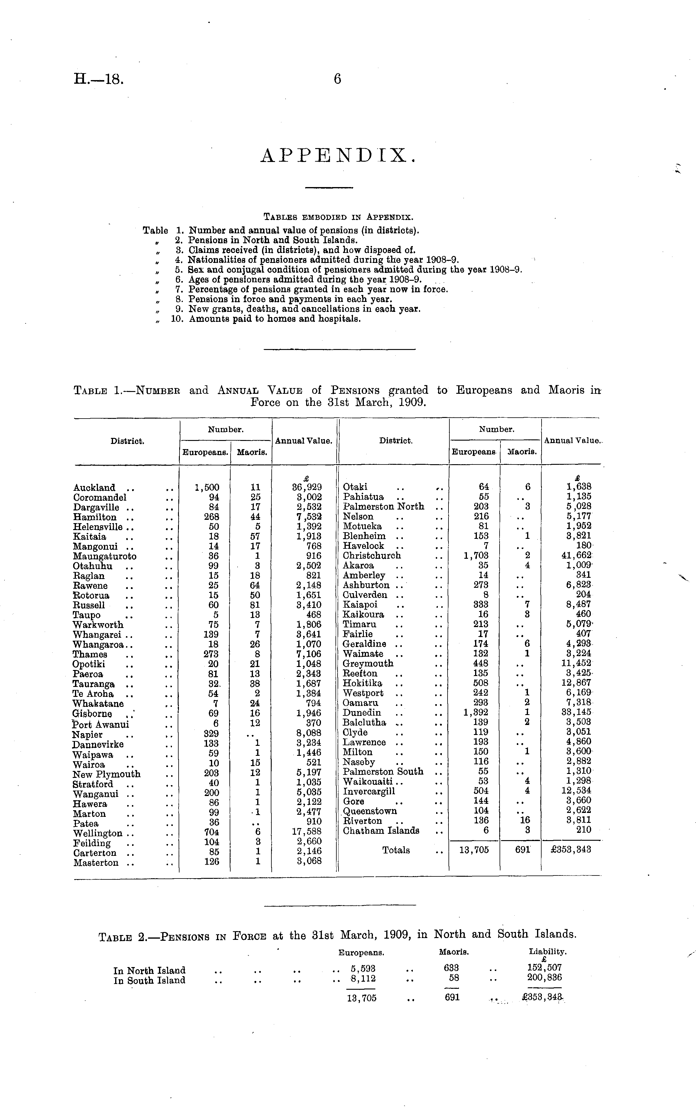Table 2. Pensions in Fobce at the 31st March, 1909, in North and South Islands. Europeans. Maoris. Liability. In North Island 5,593 .. 633 .. 152,507 In South Island 8,112 .. 58 .. 200,836 13,705 .. 691 .. £353,343