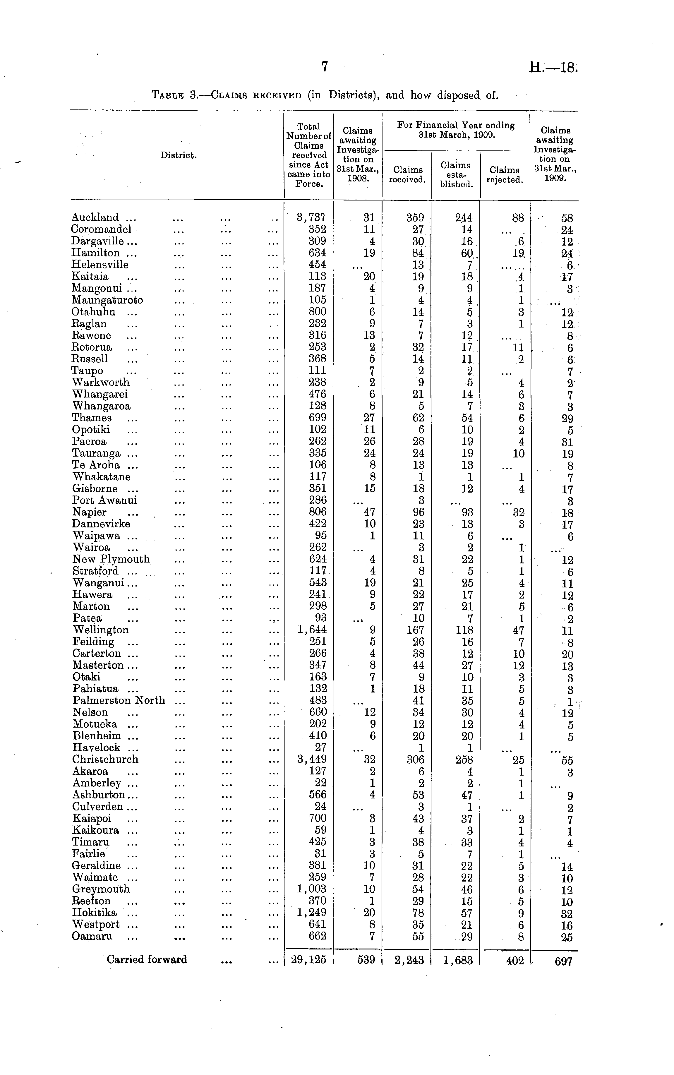 District. Total Number of Claims received since Act came into Force. Claims awaiting Investigation on 31st Mar., 1908. For Fim 31s ancial Year ending it March, 1909. bliehed. re J eoted - Claims awaiting Investigation on 31st Mar., 1909. Claims received. Auckland ... Coromandel Dargaville ... Hamilton ... Helensville Kaitaia Mangonui ... Maungaturoto Otahuhu ... Eaglan Rawene Eotorua Eussell Taupo Warkworth Whangarei Whangaroa Thames Opotiki Paeroa Tauranga ... Te Aroha ... Whakatane Gisborne ... Port Awanui Napier Dannevirke Waipawa ... Wairoa New Plymouth Stratford ... Wanganui... Hawera ... Marton Patea Wellington Feilding ... Carterton ... Masterton ... Otaki Pahiatua ... Palmerston North ... Nelson Motueka ... Blenheim ... Havelock ... Christchurch Akaroa Amberley ... Ashburton... Gulverden ... Kaiapoi Kaikoura ... Timaru Fairlie Geraldine ... Waimate ... Greymouth Beefton Hokitika ... Westport ... Oamaru 3,73? 352 309 634 454 113 187 105 800 232 316 253 368 111 238 476 128 699 102 262 335 106 117 351 286 806 422 95 262 624 117 543 241 298 93 1,644 251 266 347 163 132 483 660 202 410 27 3,449 127 22 566 24 700 59 425 31 381 259 1,003 370 1,249 641 662 31 11 4 19 20 4 1 6 9 13 2 5 7 2 6 8 27 11 26 24 8 8 15 359 27 30 84 13 19 9 4 14 7 7 32 14 2 9 21 5 62 6 28 24 13 1 18 3 96 23 11 3 31 8 21 22 27 10 167 26 38 44 9 18 41 34 12 20 1 306 6 2 53 3 43 4 38 5 31 28 54 29 78 35 55 244 14 16 60 7 18 9 4 5 3 12 17 11 2 5 14 7 54 10 19 19 13 1 12 88 6 19 4 1 1 3 1 ' 11 2 58 24 12 24 6 17 3 12 12 8 6 6 2 7 3 29 5 31 19 8 7 17 3 18 17 6 4 6 3 6 2 4 10 1 4 47 10 1 4 4 19 9 5 9 5 4 8 7 1 12 9 6 93 13 6 2 22 5 25 17 21 7 118 16 12 27 10 11 35 30 12 20 1 258 4 2 47 1 37 3 33 7 22 22 46 15 57 21 29 "32 3 1 1 1 4 2 5 1 47 7 10 12 3 5 5 4 4 1 12 6 11 12 6 2 11 8 20 13 3 3 1 12 5 5 32 2 1 4 25 1 1 1 "55 3 3 1 3 3 10 7 10 1 20 8 7 2 1 4 1 5 3 6 5 9 6 8 9 2 7 1 4 14 10 12 10 32 16 25 Carried forward 29,125 402 539 2,243 1,683 697