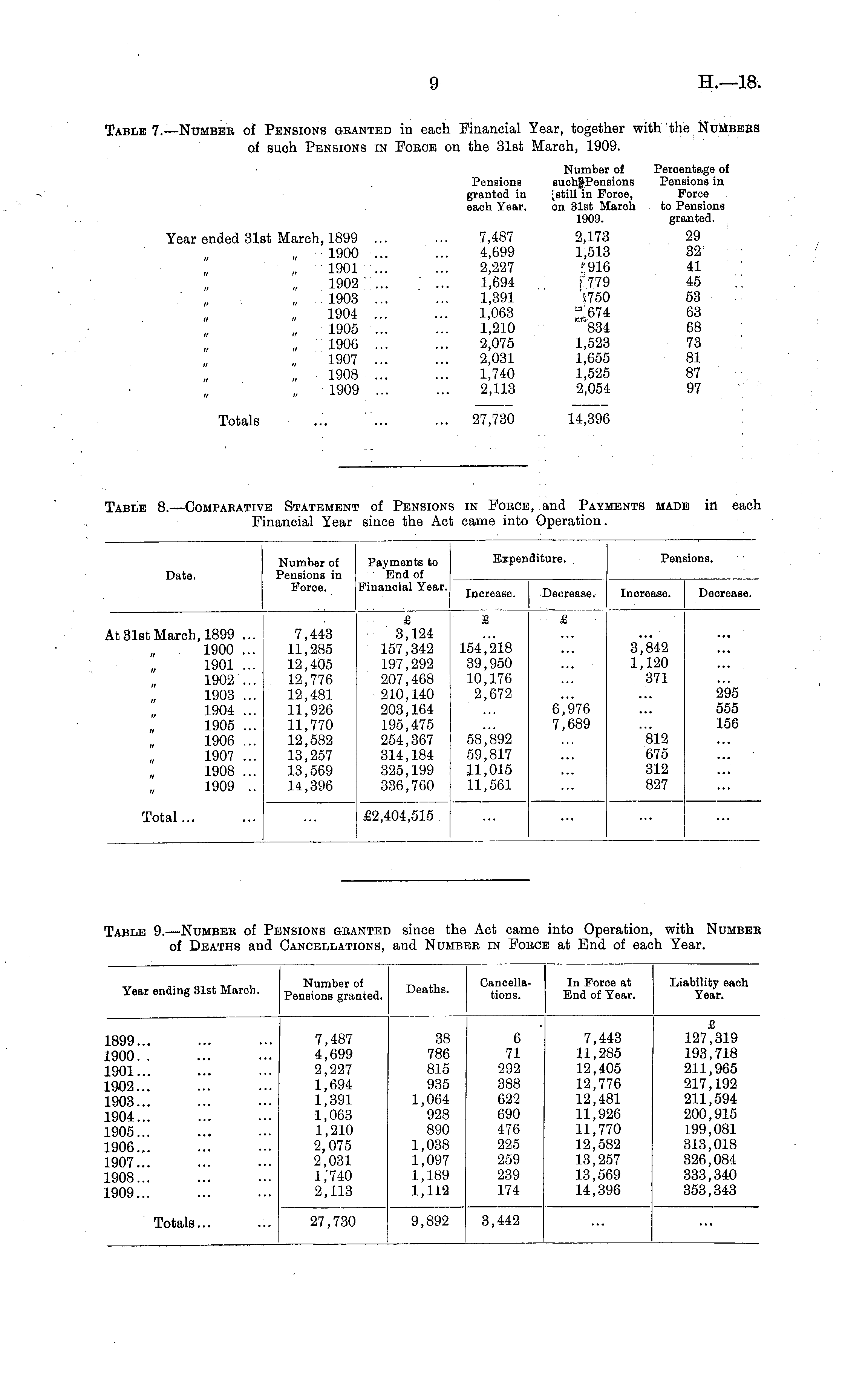 Year ending 31st March. Number of Pensions granted. Deaths. Cancellations. In Force at End of Year. Liability each Year. .899 .900 .901 .902 .903... .904... .905... .906 .907 .908 .909... 7,487 4,699 2,227 1,694 1,391 1,063 1,210 2,075 2,031 i;740 2,113 38 786 815 935 1,064 928 890 1,038 1,097 1,189 1,112 6 71 292 388 622 690 476 225 259 239 174 7,443 11,285 12,405 12,776 12,481 11,926 11,770 12,582 13,257 13,569 14,396 £ 127,319 193,718 211,965 217,192 211,594 200,915 199,081 313,018 326,084 333,340 353,343 Totals... 27,730 9,892 3,442