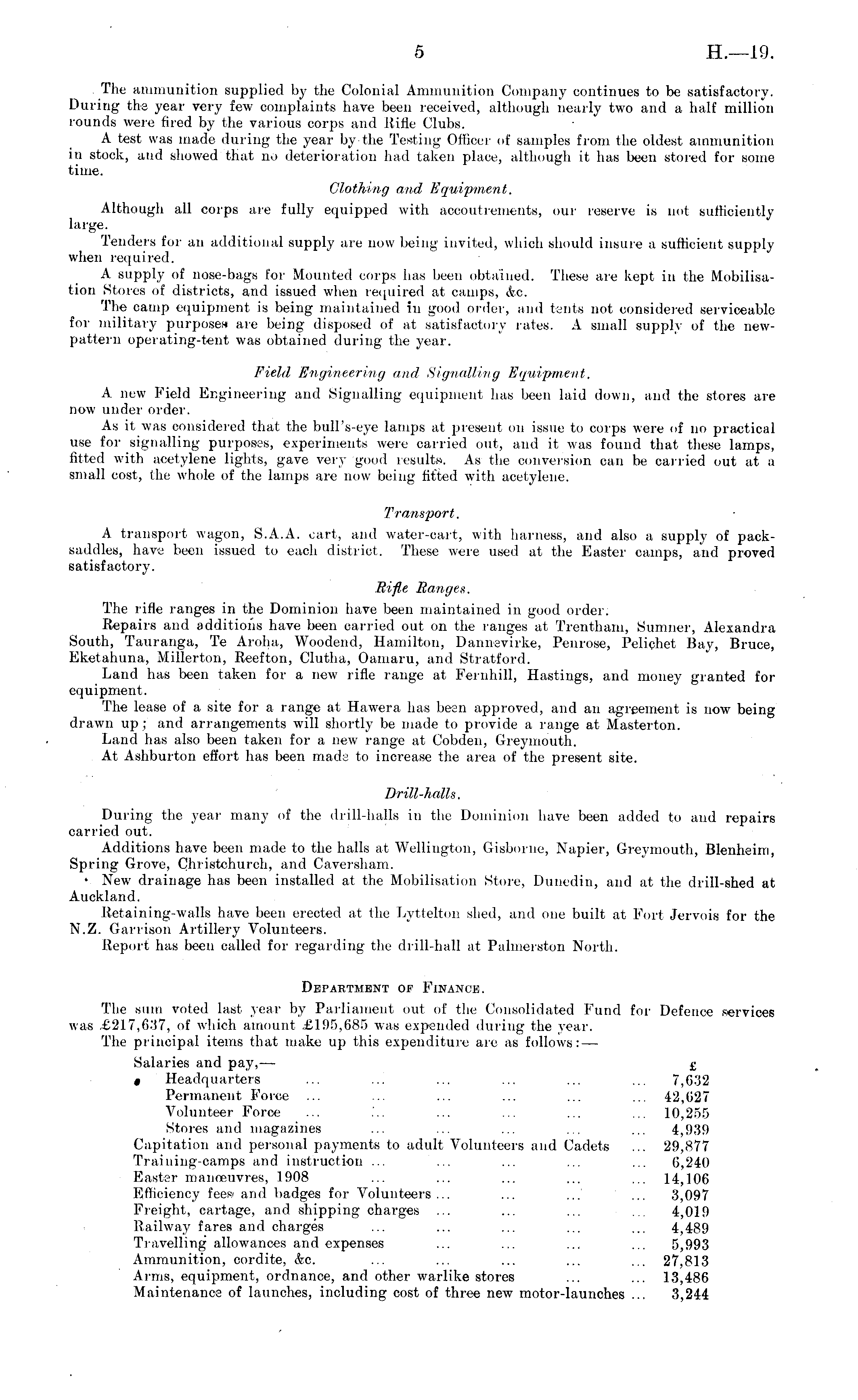 The ammunition supplied 1)3- the Colonial Ammunition Company continues to be satisfactory. During the year very few complaints have been received, although nearly two and a half million rounds were fired by the various corps and Rifle Clubs. A test was made during the year by the Testing Officer of samples from the oldest ammunition in stock, and showed that no deterioration had taken place, although it has been stored for some time. Clothing and Equipment. Although all corps are fully equipped with accoutrements, our reserve is not sufficiently large. Tenders for an additional supply are now being invited, which should insure a sufficient supply when required. A supply of nose-bags for Mounted corps has been obtained. These are kept in the Mobilisation Stores of districts, and issued when required at camps, &c. The camp equipment is being maintained in good order, and tents not considered serviceable for military purposes are being disposed of at satisfactory rates. A small supply of the newpattern operating-tent was obtained during the year. Field Engineering and Signalling Equipment. A new Field Engineering and Signalling equipment has been laid down, and the stores are now under order. As it was considered that the bull's-eye lamps at present on issue to corps were of no practical use for signalling purposes, experiments were carried out, and it was found that these lamps, fitted witli acetylene lights, gave very good results. As the conversion can be carried out at a small cost, the whole of the lamps are now being fitted with acetylene. Transport. A transport wagon, S.A.A. oart, and water-cart, with harness, and also a supply of packsaddles, have been issued to each district. These were used at the Easter camps, and proved satisfactory. Rifle Ranges. The rifle ranges in the Dominion have been maintained in good order; Repairs and additions have been carried out on the ranges at Trentham, Simmer, Alexandra South, Tauranga, Te Aroh,a, Woodend, Hamilton, Daunevirke, Penrose, Pelichet Bay, Bruce, Kketahuna, Millerton, Reefton, Clutha, Oamaru, and Stratford. Land has been taken for a new rifle range at Fernhill, Hastings, and money granted for equipment. The lease of a site for a range at Hawera has been approved, and an agreement is now being drawn up ; and arrangements will shortly be made to provide a range at Masterton. Land lias also been taken for a new range at Cobden, GreymoutF. At Ashburton effort has been made , to increase the area of the present site. Drill-halls. During the year many of the drill-halls in the Dominion have been added to and repairs carried out. Additions have been made to the halls at Wellington, Gisborne, Napier, Greymouth, Blenheim, Spring Grove, Christchurch, and Caversham. • New drainage has been installed at the Mobilisation Store, Dunedin, and at the drill-shed at Auckland. Retainirig-walls have been erected at the Lyttelton shed, and one built at Fort Jervois for the N.Z. Garrison Artillery Volunteers. Report has been called for regarding the drill-hall at Palmerston North. Department of Finance. The sum voted last veai by Parliament out of the Consolidated Fund for Defence services was .£217,(537, of which amount £195,685 was expended during the year. The principal items that make up this expenditure are as follows: — Salaries and pay,— £ < Headquarters ... ... ... ... ... ... 7, (> -j 2 Permanent Force ... ... ... ... ... ... 42,027 Volunteer Force ... .'.. ... ... ... ... 10,255 Stores and magazines ... ... ... ... ... 4,939 Capitation and personal payments to adult Volunteers and Cadets ... 29,877 Training-camps and instruction ... ... ... ... ... G,240 Easter manoeuvres, 1908 ... ... ... ... ... 14,106 Efficiency fee.* and badges for Volunteers... ... ... ... 8,097 Freight, cartage, and shipping charges ... ... ... ... 4,019 Railway fares and charges ... ... ... ... ... 4,489 Travelling allowances and expenses ... ... ... ... 5,993 Ammunition, cordite, &c. ... ... ... ... ... 27,813 Arms, equipment, ordnance, and other warlike stores ... ... 13,486 Maintenance of launches, including cost of three new motor-launches ... 3,244