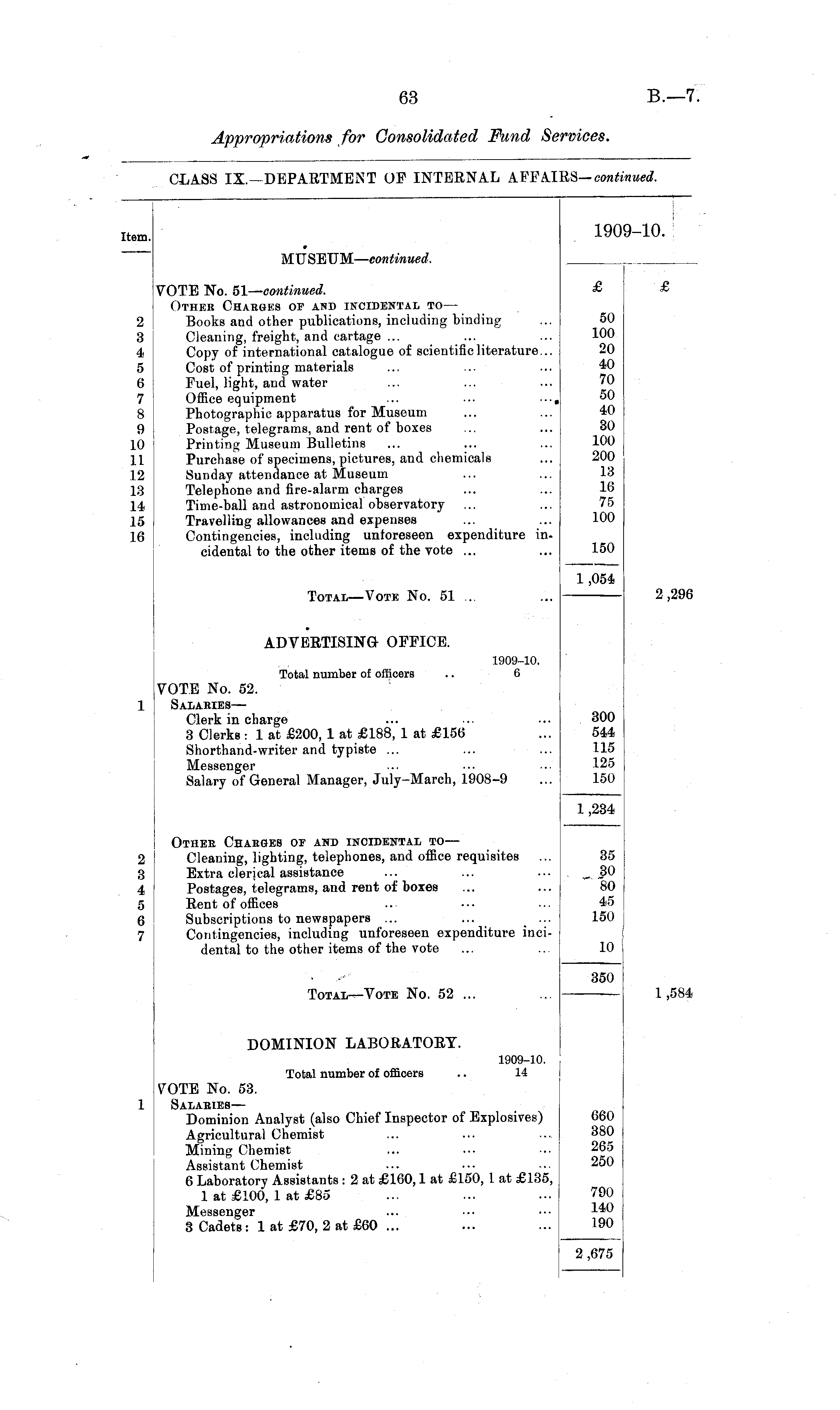 i-io. ! 190 item. • MUSEUM— continued. 2 3 4 5 6 7 8 9 10 11 12 13 14 15 16 VOTE No. 51— continued. Other Chaeges op and incidental to — Books and other publications, including binding Cleaning, freight, and cartage ... Copy of international catalogue of scientific literature... Cost of printing materials Fuel, light, and water Office equipment ... ... .... Photographic apparatus for Museum Postage, telegrams, and rent of boxes Printing Museum Bulletins Purchase of specimens, pictures, and chemicals Sunday attendance at Museum Telephone and fire-alarm charges Time-ball and astronomical observatory Travelling allowances and expenses Contingencies, including unforeseen expenditure incidental to the other items of the vote ... £ 50 100 20 40 70 50 40 30 100 200 13 16 75 100 150 Total—Vote No. 51 ... 1,054 ADVERTISING OFFICE. 2,296 1909-10. Total number of officers .. 6 VOTE No. 52. Salabies — Clerk in charge 3 Clerks: 1 at £200, 1 at £188, 1 at £156 Shorthand-writer and typiste ... Messenger Salary of General Manager, July-March, 1908-9 300 544 115 125 150 1,234 2 3 4 5 6 7 Otheb Chaeges of and incidental to — Cleaning, lighting, telephones, and office requisites Extra clerical assistance Postages, telegrams, and rent of boxes Rent of offices Subscriptions to newspapers ... Contingencies, including unforeseen expenditure incidental to the other items of the vote 35 30 " 80 45 150 i 10 1,584 350 Total—Vote No. 52 ... DOMINION LABORATORY. 1909-10. Total number of officers .. 14 VOTE No. 53. Salabies — Dominion Analyst (also Chief Inspector of Explosives) Agricultural Chemist Mining Chemist Assistant Chemist 6 Laboratory Assistants : 2 at £160,1 at £150, 1 at £135, 1 at £100, 1 at £85 Messenger 3 Cadets: 1 at £70, 2 at £60 ... 660 380 265 250 790 140 190 2,675