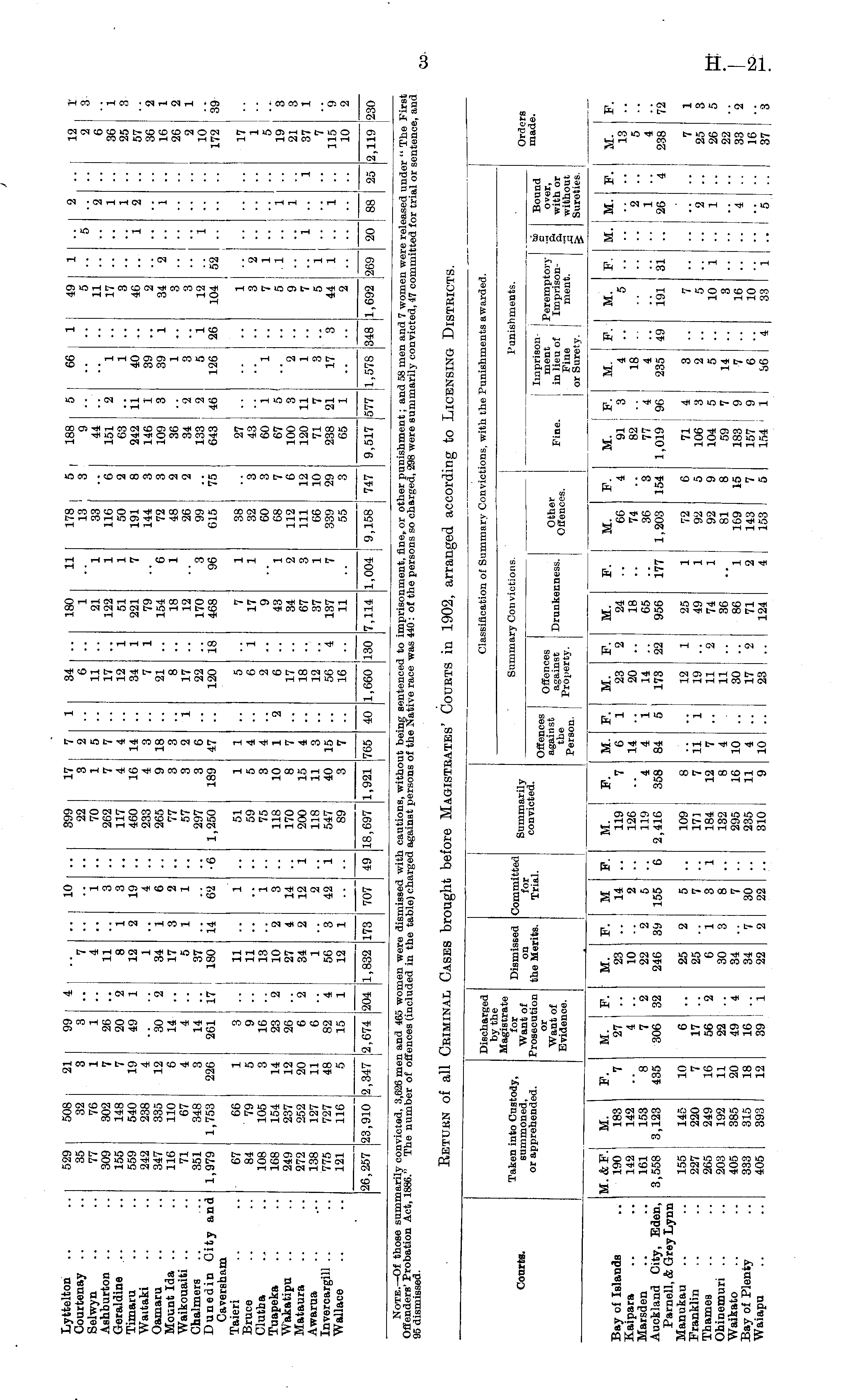 Classification of Summary Conviel ;ions, with the Punishments awarded. Courts. Taken into Custody, summoned, or apprehended. Discharged by the Magistrate lor Want of Prosecution or Want ol Evidence. Dismissed on the Merits. Committed lor Trial. Summarily convicted. Summary Convictions. Punishments. Orders made. °S?t s I oflenees f),H ' against Drunkenness. Person. J Property. Other Offences. Fine. Imprison- g> Bound ment Peremptory -g over, i in lieu of Imprison- § "with or Fine nient. £ without ! or Surety. Sureties. Bay of Islands Kaipara Marsden Auckland City, Eden, Parnell, & Grey Lynn Manukau Franklin Thames Ohinemuri Waikato Bay of Plenty Waiapu M. &P. 190 142 161 3,558 155 227 265 203 405 333 405 M. 183 142 153 3,123 145 220 249 192 385 315 393 P. 7 '*8 435 10 7 16 11 20 18 12 M. 27 4 7 306 6 17 56 22 49 16 39 F. 2 32 M. 23 10 22 246 25 25 6 30 34 34 22 F. 2 3'J 2 M 14 2 5 155 5 7 3 8 7 30 22 P. *6 M. 119 126 119 ' 2,416 109 171 184 132 295 235 310 : P. "4 358 8 7 12 16 11 9 M. 6 14 4 11 7 4 10 4 10 F. 1 1 5 1 M. 23 20 14 173 12 19 11 11 30 17 23 F. 2 22 1 M. 24 18 65 956 25 49 74 36 86 71 124 P. 177 1 1 1 M. 66 74 36 1,203 72 92 92 81 169 143 153 P. 4 3 154 6 5 9 8 15 7 5 M. P. 91 3 82 .. 77 4 1,019 96 71 4 106 3 104 I 5 59 7 183 9 157 9 154 ; 1 M. 4 18 4 235 3 2 5 14 7 6 86 F. 49 M. 5 191 7 5 10 3 16 10 33 P. 31 M. M. 2 1 26 P. 4 M. 13 5 4 238 7 25 26 22 33 16 37 P. 72 1 3 5 '2 3 1 2 1 2 1 4 1 2 4 4 2 1 7 2 '2 4 1 5 3