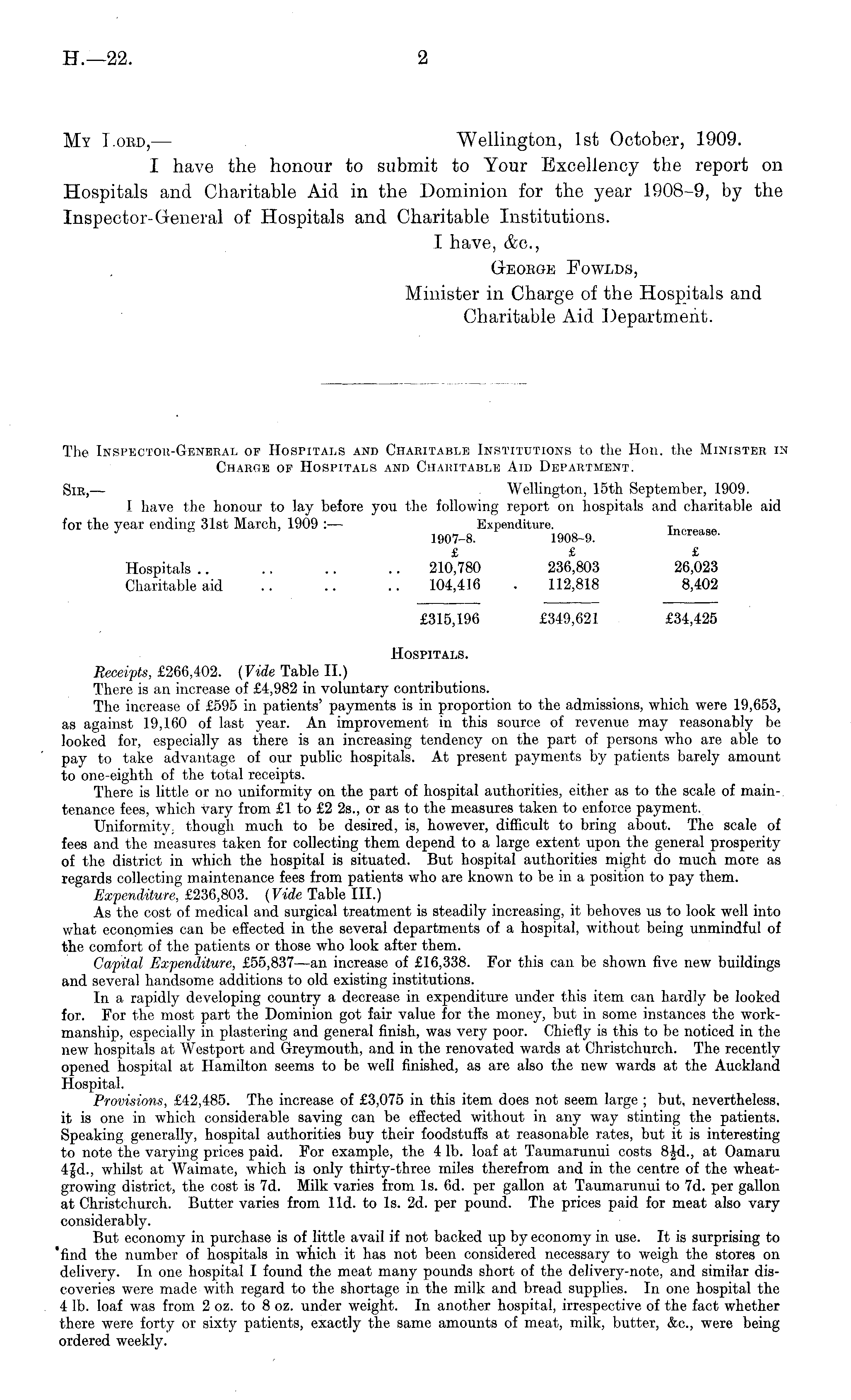 My T.ord, — Wellington, Ist October, 1909. I have the honour to submit to Your Excellency the report on Hospitals and Charitable Aid in the Dominion for the year 1908-9, by the Inspector-General of Hospitals and Charitable Institutions. I have, &c, GrEORGE FoWLDS, Minister in Charge of the Hospitals and Charitable Aid Department. Tbe Inspector-General of Hospitals and Charitable Institutions to the Hon. the Minister in Charge op Hospitals and Charitable Aid Department. Sir,— Wellington, 15th September, 1909. I have the honour to lay before you the following report on hospitals and charitable aid for the year ending 31st March, 1909 : — Expenditure. T 1907-8. 1908-9. Increase. £ £ £ Hospitals .. .. .. .. 210,780 236,803 26,023 Charitable aid .. .. .. 104,416 . 112,818 8,402 £315,196 £349,621 £34,425 Hospitals. Receipts, £266,402. {Vide Table II.) There is an increase of £4,982 in voluntary contributions. The increase of £595 in patients' payments is in proportion to the admissions, which were 19,653, as against 19,160 of last year. An improvement in this source of revenue may reasonably be looked for, especially as there is an increasing tendency on the part of persons who are able to pay to take advantage of our public hospitals. At present payments by patients barely amount to one-eighth of the total receipts. There is little or no uniformity on the part of hospital authorities, either as to the scale of maintenance fees, which vary from £1 to £2 25., or as to the measures taken to enforce payment. Uniformity; though much to be desired, is, however, difficult to bring about. The scale of fees and the measures taken for collecting them depend to a large extent upon the general prosperity of the district in which the hospital is situated. But hospital authorities might do much more as regards collecting maintenance fees from patients who are known to be in a position to pay them. Expenditure, £236,803. (Vide Table III.) As the cost of medical and surgical treatment is steadily increasing, it behoves us to look well into what economies can be effected in the several departments of a hospital, without being unmindful of the comfort of the patients or those who look after them. Capital Expenditure, £55,837 —an increase of £16,338. For this can be shown five new buildings and several handsome additions to old existing institutions. In a rapidly developing country a decrease in expenditure under this item can hardly be looked for. For the most part the Dominion got fair value for the money, but in some instances the workmanship, especially in plastering and general finish, was very poor. Chiefly is this to be noticed in the new hospitals at Wcstport and Greymouth, and in the renovated wards at Christchurch. The recently opened hospital at Hamilton seems to be well finished, as are also the new wards at the Auckland Hospital. Provisions, £42,485. The increase of £3,075 in this item does not seem large ; but, nevertheless, it is one in which considerable saving can be effected without in any way stinting the patients. Speaking generally, hospital authorities buy their foodstuffs at reasonable rates, but it is interesting to note the varying prices paid. For example, the 41b. loaf at Taumarunui costs BJd., at Oamaru 4|d., whilst at Waimate, which is only thirty-three miles therefrom and in the centre of the wheatgrowing district, the cost is 7d. Milk varies from Is. 6d. per gallon at Taumarunui to 7d. per gallon at Christchurch. Butter varies from lid. to Is. 2d. per pound. The prices paid for meat also vary considerably. But economy in purchase is of little avail if not backed up by economy in use. It is surprising to "find the number of hospitals in which it has not been considered necessary to weigh the stores on delivery. In one hospital I found the meat many pounds short of the delivery-note, and similar discoveries were made with regard to the shortage in the milk and bread supplies. In one hospital the 4 lb. loaf was from 2 oz. to 8 oz. under weight. In another hospital, irrespective of the fact whether there were forty or sixty patients, exactly the same amounts of meat, milk, butter, &c, were being ordered weekly.