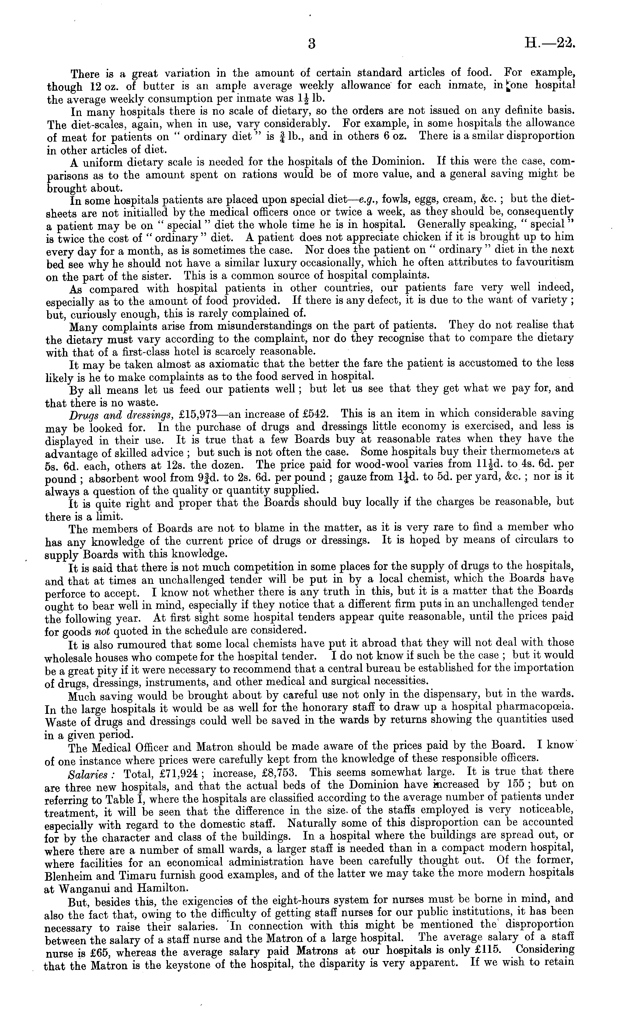 There is a great variation in the amount of certain standard articles of food. For example, though 12 oz. of butter is an ample average weekly allowance for each inmate, in £one hospital the average weekly consumption per inmate was 1| lb. In many hospitals there is no scale of dietary, so the orders are not issued on any definite basis. The diet-scales, again, when in use, vary considerably. For example, in some hospitals the allowance of meat for patients on " ordinary diet "is f lb., and in others 6 oz. There is a smilar disproportion in other articles of diet. A uniform dietary scale is needed for the hospitals of the Dominion. If this were the case, comparisons as to the amount spent on rations would be of more value, and a general saving might be brought about. In some hospitals patients are placed upon special diet — e.g., fowls, eggs, cream, &c. ; but the dietsheets are not initialled by the medical officers once or twice a week, as they should be, consequently a patient may be on " special " diet the whole time he is in hospital. Generally speaking, " special" is twice the cost of " ordinary " diet. A patient does not appreciate chicken if it is brought up to him every day for a month, as is sometimes the case. Nor does the patient on " ordinary " diet in the next bed see why he should not have a similar luxury occasionally, which he often attributes to favouritism on the part of the sister. This is a common source of hospital complaints. As compared with hospital patients in other countries, our patients fare very well indeed, especially as to the amount of food provided. If there is any defect, it is due to the want of variety ; but, curiously enough, this is rarely complained of. Many complaints arise from misunderstandings on the part of patients. They do not realise that the dietary must vary according to the complaint, nor do they recognise that to compare the dietary with that of a first-class hotel is scarcely reasonable. It may be taken almost as axiomatic that the better the fare the patient is accustomed to the less likely is he to make complaints as to the food served in hospital. By all means let us feed our patients well; but let us see that they get what we pay for, and that there is no waste. Drugs and dressings, £15,973 —an increase of £542. This is an item in which considerable saving may be looked for. In the purchase of drugs and dressings little economy is exercised, and less is displayed in their use. It is true that a few Boards buy at reasonable rates when they have the advantage of skilled advice ; but such is not often the case. Some hospitals buy their thermometers at ss. 6d. each, others at 12s. the dozen. The price paid for wood-wool varies from 11 Jd. to 4s. 6d. per pound ; absorbent wool from 9|d. to 2s. 6d. per pound ; gauze from 1 Jd. to sd. per yard, &c. ; nor is it always a question of the quality or quantity supplied. It is quite right and proper that the Boards should buy locally if the charges be reasonable, but there is a limit. The members of Boards are not to blame in the matter, as it is very rare to find a member who has any knowledge of the current price of drugs or dressings. It is hoped by means of circulars to supply Boards with this knowledge. It is said that there is not much competition in some places for the supply of drugs to the hospitals, and that at times an unchallenged tender will be put in by a local chemist, which the Boards have perforce to accept. I know not whether there is any truth in this, but it is a matter that the Boards ought to bear well in mind, especially if they notice that a different firm puts in an unchallenged tender the following year. At first sight some hospital tenders appear quite reasonable, until the prices paid for goods not quoted in the schedule are considered. It is also rumoured that some local chemists have put it abroad that they will not deal with those wholesale houses who compete for the hospital tender. Ido not know if such be the case ; but it would be a great pity if it were necessary to recommend that a central bureau be established for the importation of drugs, dressings, instruments, and other medical and surgical necessities. Much saving would be brought about by careful use not only in the dispensary, but in the wards. In the large hospitals it would be as well for the honorary staff to draw up a hospital pharmacopoeia. Waste of drugs and dressings could well be saved in the wards by returns showing the quantities used in a given period. The Medical Officer and Matron should be made aware of the prices paid by the Board. I know of one instance where prices were carefully kept from the knowledge of these responsible officers. Salaries : Total, £71,924 ; increase, £8,753. This seems somewhat large. It is true that there are three new hospitals, and that the actual beds of the Dominion have increased by 155 ; but on referring to Table I, where the hospitals are classified according to the average number of patients under treatment, it will be seen that the difference in the size, of the staffs employed is very noticeable, especially with regard to the domestic staff. Naturally some of this disproportion can be accounted for by the character and class of the buildings. In a hospital where the buildings are spread out, or where there are a number of small wards, a larger staff is needed than in a compact modern hospital, where facilities for an economical administration have been carefully thought out. Of the former, Blenheim and Timaru furnish good examples, and of the latter we may take the more modern hospitals at Wanganui and Hamilton. But, besides this, the exigencies of the eight-hours system for nurses must be borne in mind, and also the fact that, owing to the difficulty of getting staff nurses for our public institutions, it has been necessary to raise their salaries. 'In connection with this might be mentioned the disproportion between the salary of a staff nurse a