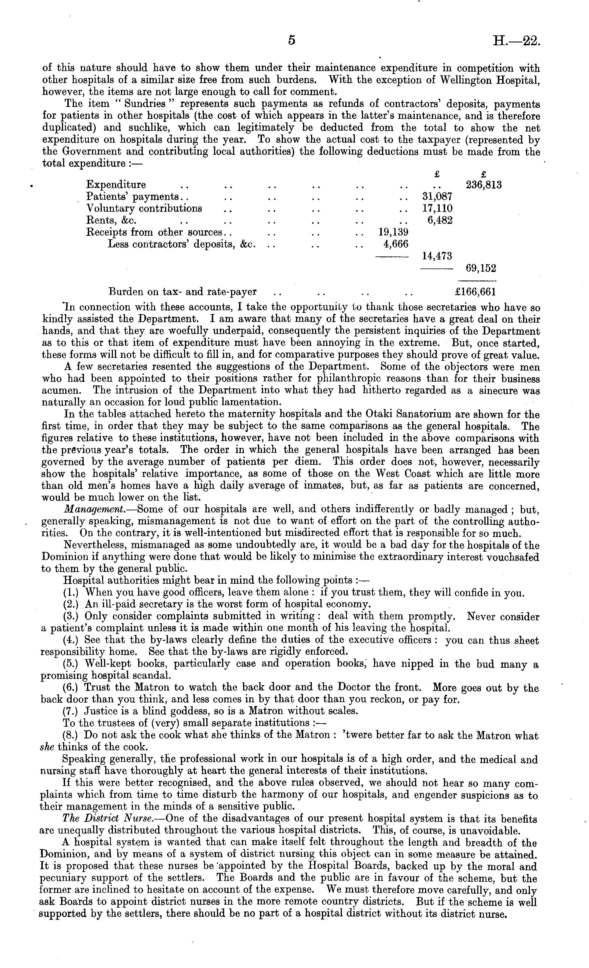 of this nature should have to show them under their maintenance expenditure in competition with other hospitals of a similar size free from such burdens. With the exception of Wellington Hospital, however, the items are not large enough to call for comment. The item " Sundries " represents such payments as refunds of contractors' deposits, payments for patients in other hospitals (the cost of which appears in the latter's maintenance, and is therefore duplicated) and suchlike, which can legitimately be deducted from the total to show the net expenditure on hospitals during the year. To show the actual cost to the taxpayer (represented by the Government and contributing local authorities) the following deductions must be made from the total expenditure : — £ £ Expenditure .. .. .. .. .. .. .. 236,813 Patients'payments.. .. .. .. .. .. 31,087 Voluntary contributions .. .. .. .. .. 17,110 Rents, &c. .. .. .. .. .. .. 6,482 Receipts from other sources. . .. .. . . 19,139 Less contractors' deposits, &c. .. .. .. 4,666 14,473 69,152 Burden on tax- and rate-payer .. .. .. .. £166,661 Tn connection with these accounts, I take the opportunity to thank those secretaries who have so kindly assisted the Department. lam aware that many of the secretaries have a great deal on their hands, and that they are woefully underpaid, consequently the persistent inquiries of the Department as to this or that item of expenditure must have been annoying in the extreme. But, once started, these forms will not be difficult to fill in, and for comparative purposes they should prove of great value. A few secretaries resented the suggestions of the Department. Some of the objectors were men who had been appointed to their positions rather for philanthropic reasons than for their business acumen. The intrusion of the Department into what they had hitherto regarded as a sinecure was naturally an occasion for loud public lamentation. In the tables attached hereto the maternity hospitals and the Otaki Sanatorium are shown for the first time, in order that they may be subject to the same comparisons as the general hospitals. The figures relative to these institutions, however, have not been included in the above comparisons with the previous year's totals. The order in which the general hospitals have been arranged has been governed by the average number of patients per diem. This order does not, however, necessarily show the hospitals' relative importance, as some of those on the West Coast which are little more than old men's homes have a high daily average of inmates, but, as far as patients are concerned, would be much lower on the list. Management. —Some of our hospitals are well, and others indifferently or badly managed ; but, generally speaking, mismanagement is not due to want of effort on the part of the controlling authorities. On the contrary, it is well-intentioned but misdirected effort that is responsible for so much. Nevertheless, mismanaged as some undoubtedly are, it would be a bad day for the hospitals of the Dominion if anything were done that would be likely to minimise the extraordinary interest vouchsafed to them by the general public. Hospital authorities might bear in mind the following points : — (1.) When you have good officers, leave them alone : if you trust them, they will confide in you. (2.) An ill-paid secretary is the worst form of hospital economy. (3.) Only consider complaints submitted in writing : deal with them promptly. Never consider a patient's complaint unless it is made within one month of his leaving the hospital. (4.) See that the by-laws clearly define the duties of the executive officers : you can thus sheet responsibility home. See that the by-laws are rigidly enforced. (5.) Well-kept books, particularly case and operation books, have nipped in the bud many a promising hospital scandal. (6.) Trust the Matron to watch the back door and the Doctor the front. More goes out by the back door than you think, and less comes in by that door than you reckon, or pay for. (7.) Justice is a blind goddess, so is a Matron without scales. To the trustees of (very) small separate institutions : — (8.) Do not ask the cook what she thinks of the Matron : 'twere better far to ask the Matron what she thinks of the cook. Speaking generally, the professional work in our hospitals is of a high order, and the medical and nursing staff have thoroughly at heart the general interests of their institutions. If this were better recognised, and the above rules observed, we should not hear so many complaints which from time to time disturb the harmony of our hospitals, and engender suspicions as to their management in the minds of a sensitive public. The District Nurse. —One of the disadvantages of our present hospital system is that its benefits are unequally distributed throughout the various hospital districts. This, of course, is unavoidable. A hospital system is wanted that can make itself felt throughout the length and breadth of the Dominion, and by means of a system of district nursing this object can in some measure be attained. It is proposed that these nurses be 'appointed by the Hospital Boards, backed up by the moral and pecuniary support of the settlers. The Boards and the public are in favour of the scheme, but the former are inclined to hesitate on account of the expense. We must therefore move carefully, and only ask Boards to appoint district nurses in the more remote country districts. But if the scheme is well supported by the settlers, there should be no part of a hospital district without its district nurse.