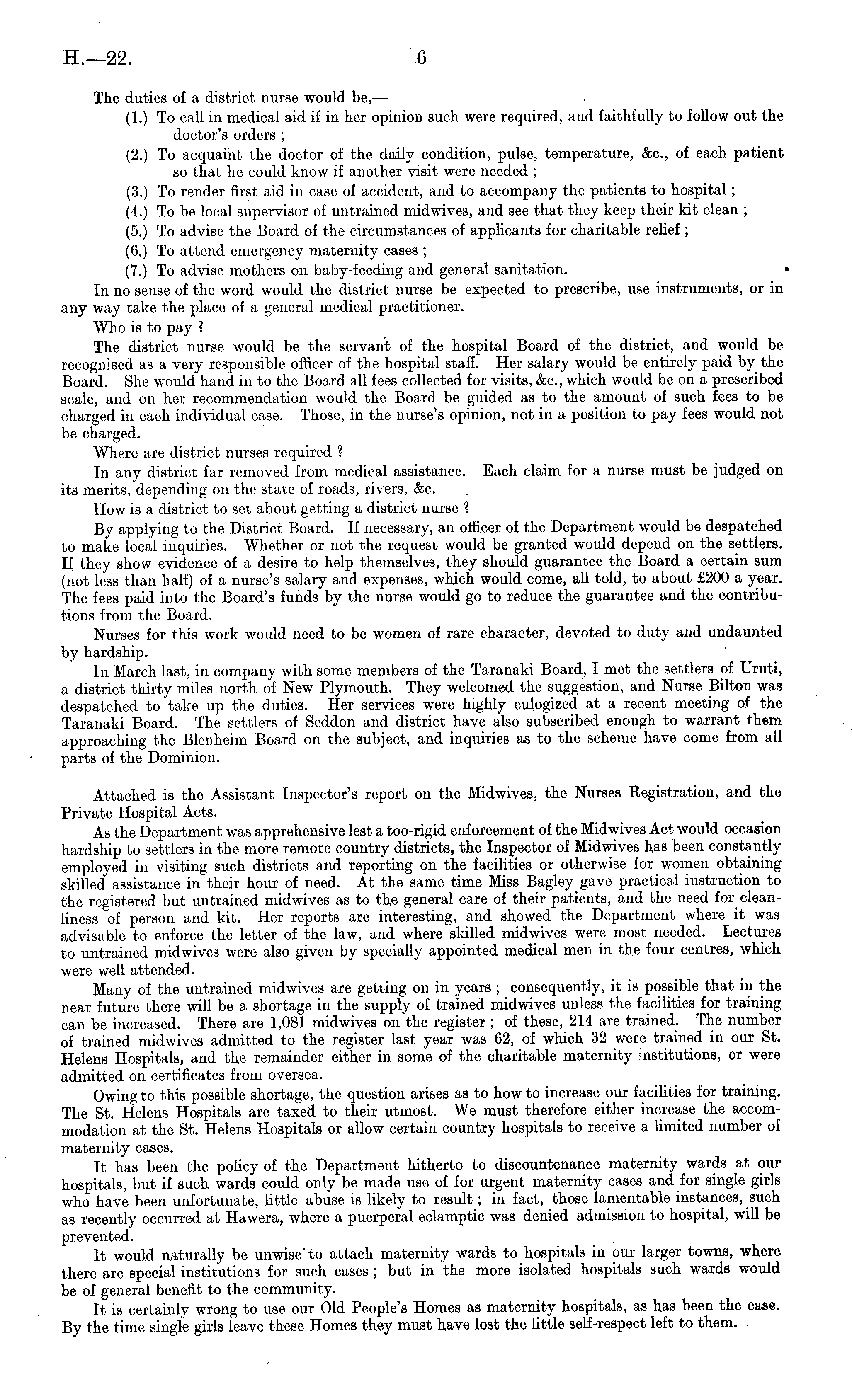 The duties of a district nurse would be, — (1.) To call in medical aid if in her opinion such were required, and faithfully to follow out the doctor's orders ; (2.) To acquaint the doctor of the daily condition, pulse, temperature, &c, of each patient so that he could know if another visit were needed ; (3.) To render first aid in case of accident, and to accompany the patients to hospital; (4.) To be local supervisor of untrained midwives, and see that they keep their kit clean ; (5.) To advise the Board of the circumstances of applicants for charitable relief ; (6.) To attend emergency maternity cases ; (7.) To advise mothers on baby-feeding and general sanitation. In no sense of the word would the district nurse be expected to prescribe, use instruments, or in any way take the place of a general medical practitioner. Who is to pay ? The district nurse would be the servant of the hospital Board of the district, and would be recognised as a very responsible officer of the hospital staff. Her salary would be entirely paid by the Board. She would hand in to the Board all fees collected for visits, &c, which would be on a prescribed scale, and on her recommendation would the Board be guided as to the amount of such fees to be charged in each individual case. Those, in the nurse's opinion, not in a position to pay fees would not be charged. Where are district nurses required ? In any district far removed from medical assistance. Each claim for a nurse must be judged on its merits, depending on the state of roads, rivers, &c. How is a district to set about getting a district nurse ? By applying to the District Board. If necessary, an officer of the Department would be despatched to make local inquiries. Whether or not the request would be granted would depend on the settlers. If they show evidence of a desire to help themselves, they should guarantee the Board a certain sum (not less than half) of a nurse's salary and expenses, which would come, all told, to about £200 a year. The fees paid into the Board's funds by the nurse would go to reduce the guarantee and the contributions from the Board. Nurses for this work would need to be women of rare character, devoted to duty and undaunted by hardship. In March last, in company with some members of the Taranaki Board, I met the settlers of Uruti, a district thirty miles north of New Plymouth. They welcomed the suggestion, and Nurse Bilton was despatched to take up the duties. Her services were highly eulogized at a recent meeting of the Taranaki Board. The settlers of Seddon and district have also subscribed enough to warrant them approaching the Blenheim Board on the subject, and inquiries as to the scheme have come from all parts of the Dominion. Attached is the Assistant Inspector's report on the Midwives, the Nurses Registration, and the Private Hospital Acts. As the Department was apprehensive lest a too-rigid enforcement of the Midwives Act would occasion hardship to settlers in the more remote country districts, the Inspector of Midwives has been constantly employed in visiting such districts and reporting on the facilities or otherwise for women obtaining skilled assistance in their hour of need. At the same time Miss Bagley gave practical instruction to the registered but untrained midwives as to the general care of their patients, and the need for cleanliness of person and kit. Her reports are interesting, and showed the Department where it was advisable to enforce the letter of the law, and where skilled midwives were most needed. Lectures to untrained midwives were also given by specially appointed medical men in the four centres, which were well attended. Many of the untrained midwives are getting on in years ; consequently, it is possible that in the near future there will be a shortage in the supply of trained midwives unless the facilities for training can be increased. There are 1,081 midwives on the register ; of these, 214 are trained. The number of trained midwives admitted to the register last year was 62, of which 32 were trained in our St. Helens Hospitals, and the remainder either in some of the charitable maternity institutions, or were admitted on certificates from oversea. Owing to this possible shortage, the question arises as to how to increase our facilities for training. The St. Helens Hospitals are taxed to their utmost. We must therefore either increase the accommodation at the St. Helens Hospitals or allow certain country hospitals to receive a limited number of maternity cases. It has been the policy of the Department hitherto to discountenance maternity wards at our hospitals, but if such wards could only be made use of for urgent maternity cases and for single girls who have been unfortunate, little abuse is likely to result; in fact, those lamentable instances, such as recently occurred at Hawera, where a puerperal eclamptic was denied admission to hospital, will be prevented. It would naturally be unwise'to attach maternity wards to hospitals in our larger towns, where there are special institutions for such cases ; but in the more isolated hospitals such wards would be of general benefit to the community. It is certainly wrong to use our Old People's Homes as maternity hospitals, as has been the case. By the time single girls leave these Homes they must have lost the little self-respect left to them.