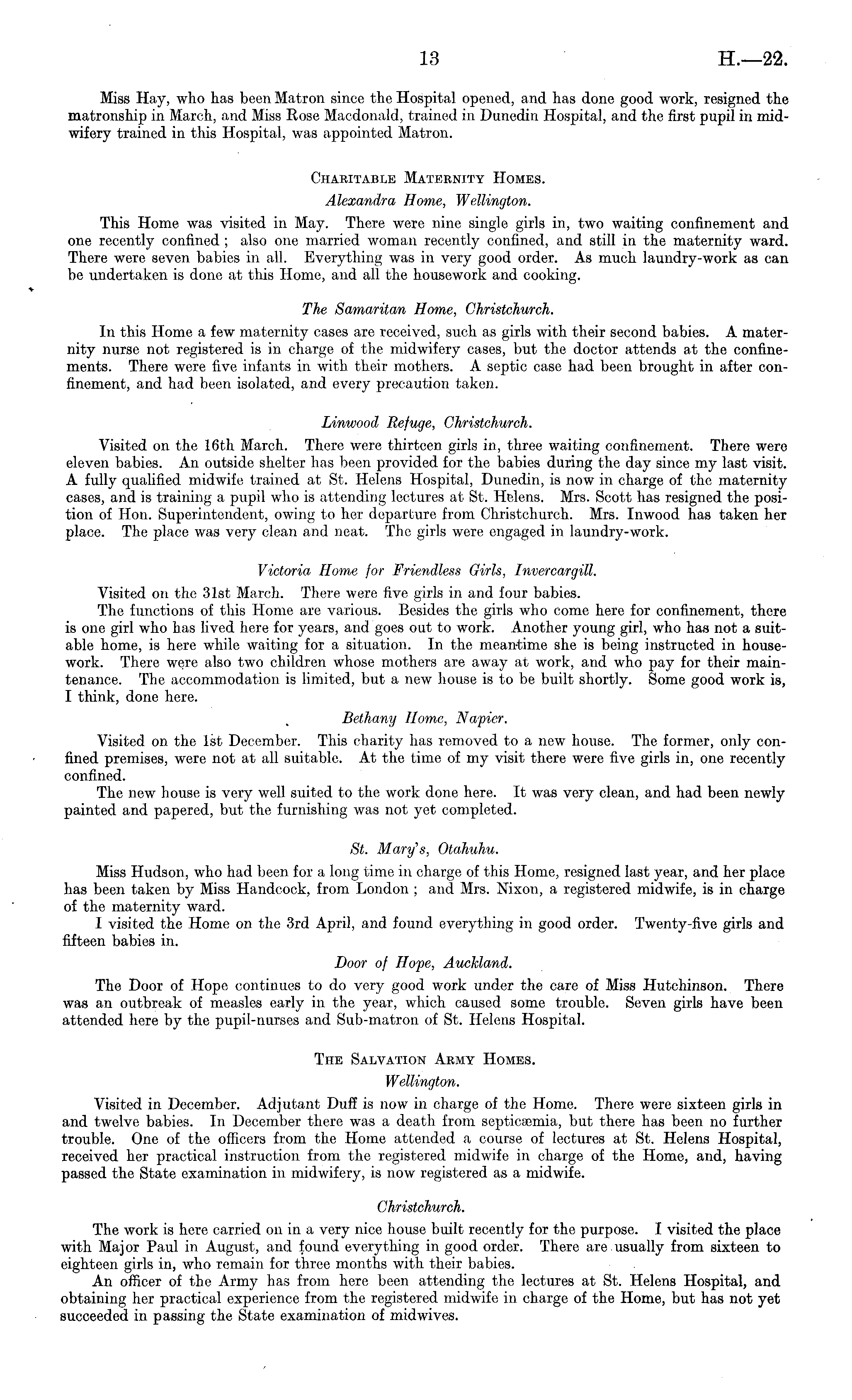 Miss Hay, who has been Matron since the Hospital opened, and has done good work, resigned the matronship in March, and Miss Rose Macdonald, trained in Dunedin Hospital, and the first pupil in midwifery trained in this Hospital, was appointed Matron. Charitable Maternity Homes. Alexandra Home, Wellington. This Home was visited in May. There were nine single girls in, two waiting confinement and one recently confined ; also one married woman recently confined, and still in the maternity ward. There were seven babies in all. Everything was in very good order. As much laundry-work as can be undertaken is done at this Home, and all the housework and cooking. The Samaritan Home, Christchurch. In this Home a few maternity cases are received, such as girls with their second babies. A maternity nurse not registered is in charge of the midwifery cases, but the doctor attends at the confinements. There were five infants in with their mothers. A septic case had been brought in after confinement, and had been isolated, and every precaution taken. Linwood Refuge, Christchurch. Visited on the 16th March. There were thirteen girls in, three waiting confinement. There were eleven babies. An outside shelter has been provided for the babies during the day since my last visit. A fully qualified midwife trained at St. Helens Hospital, Dunedin, is now in charge of the maternity cases, and is training a pupil who is attending lectures at St. Helens. Mrs. Scott has resigned the position of Hon. Superintendent, owing to her departure from Christchurch. Mrs. Inwood has taken her place. The place was very clean and neat. The girls were engaged in laundry-work. Victoria Home for Friendless Girls, Invercargill. Visited on the 31st March. There were five girls in and four babies. The functions of this Home are various. Besides the girls who come here for confinement, there is one girl who has lived here for years, and goes out to work. Another young girl, who has not a suitable home, is here while waiting for a situation. In the meantime she is being instructed in housework. There were also two children whose mothers are away at work, and who pay for their maintenance. The accommodation is limited, but a new house is to be built shortly. Some good work is, I think, done here. Bethany Home, Napier. Visited on the Ist December. This charity has removed to a new house. The former, only confined premises, were not at all suitable. At the time of my visit there were five girls in, one recently confined. The new house is very well suited to the work done here. It was very clean, and had been newly painted and papered, but the furnishing was not yet completed. St. Mary's, Otahuhu. Miss Hudson, who had been for a long time in charge of this Home, resigned last year, and her place has been taken by Miss Handcock, from London ; and Mrs. Nixon, a registered midwife, is in charge of the maternity ward. I visited the Home on the 3rd April, and found everything in good order. Twenty-five girls and fifteen babies in. Door of Hope, Auckland. The Door of Hope continues to do very good work under the care of Miss Hutchinson. There was an outbreak of measles early in the year, which caused some trouble. Seven girls have been attended here by the pupil-nurses and Sub-matron of St. Helens Hospital. The Salvation Army Homes. Wellington. Visited in December. Adjutant Duff is now in charge of the Home. There were sixteen girls in and twelve babies. In December there was a death from septicaemia, but there has been no further trouble. One of the officers from the Home attended a course of lectures at St. Helens Hospital, received her practical instruction from the registered midwife in charge of the Home, and, having passed the State examination in midwifery, is now registered as a midwife. Christchurch. The work is here carried on in a very nice house built recently for the purpose. I visited the place with Maj or Paul in August, and found everything in good order. There are usually from sixteen to eighteen girls in, who remain for three months with their babies. An officer of the Army has from here been attending the lectures at St. Helens Hospital, and obtaining her practical experience from the registered midwife in charge of the Home, but has not yet succeeded in passing the State examination of midwives.