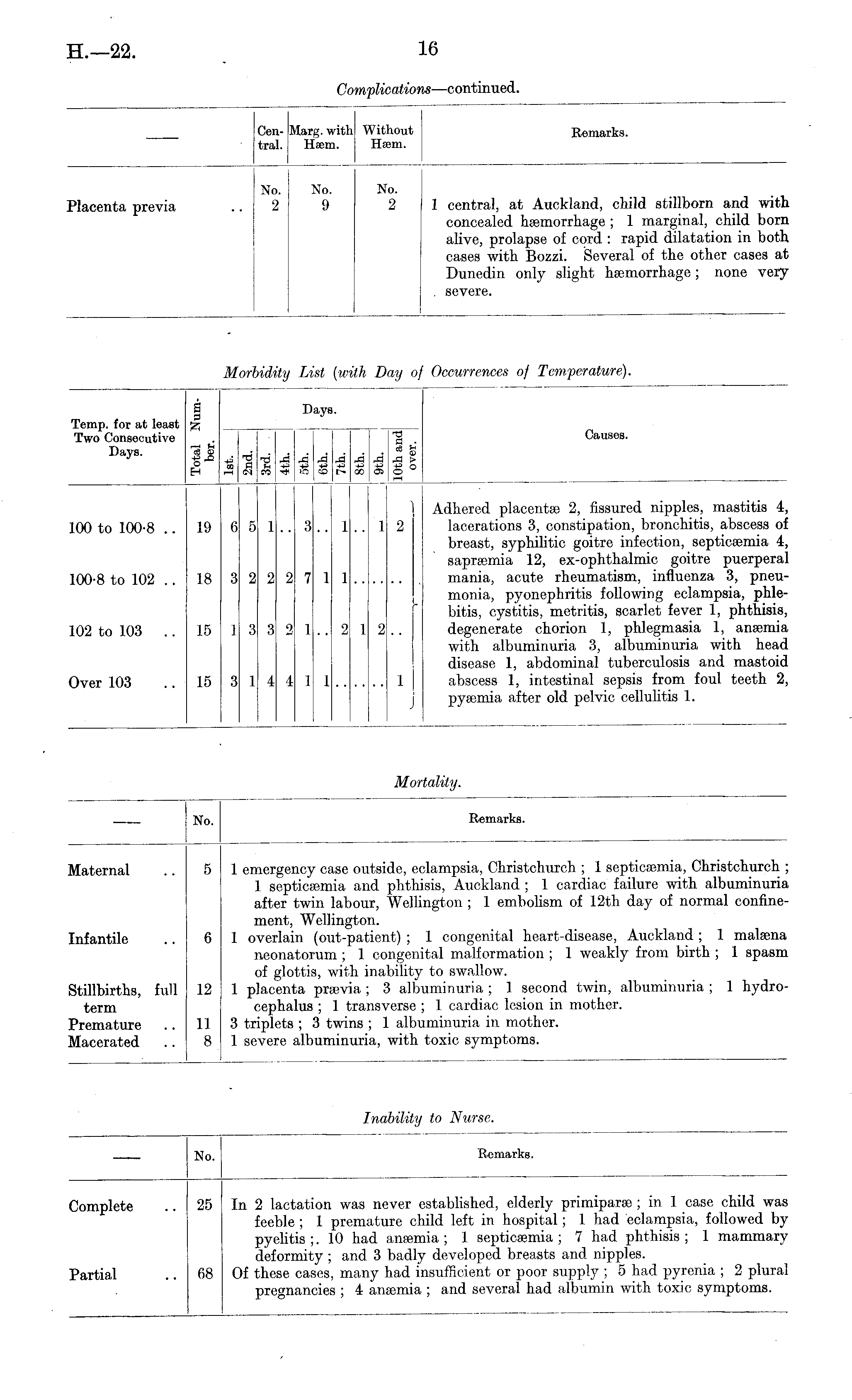 No. Remarks. Maternal Infantile 1 emergency case outside, eclampsia, Christchurch ; 1 septicaemia, Christchurch ; 1 septicaemia and phthisis, Auckland ; 1 cardiac failure with albuminuria after twin labour, Wellington ; 1 embolism of 12th day of normal confinement, Wellington. 1 overlain (out-patient) ; 1 congenital heart-disease, Auckland ; 1 malaena neonatorum ; 1 congenital malformation ; 1 weakly from birth ; 1 spasm of glottis, with inability to swallow. 1 placenta praevia ; 3 albuminuria ; 1 second twin, albuminuria ; 1 hydrocephalus ; 1 transverse ; 1 cardiac lesion in mother. 3 triplets ; 3 twins ; 1 albuminuria in mother. 1 severe albuminuria, with toxic symptoms. Stillbirths, full 12 term Premature Macerated 11 8