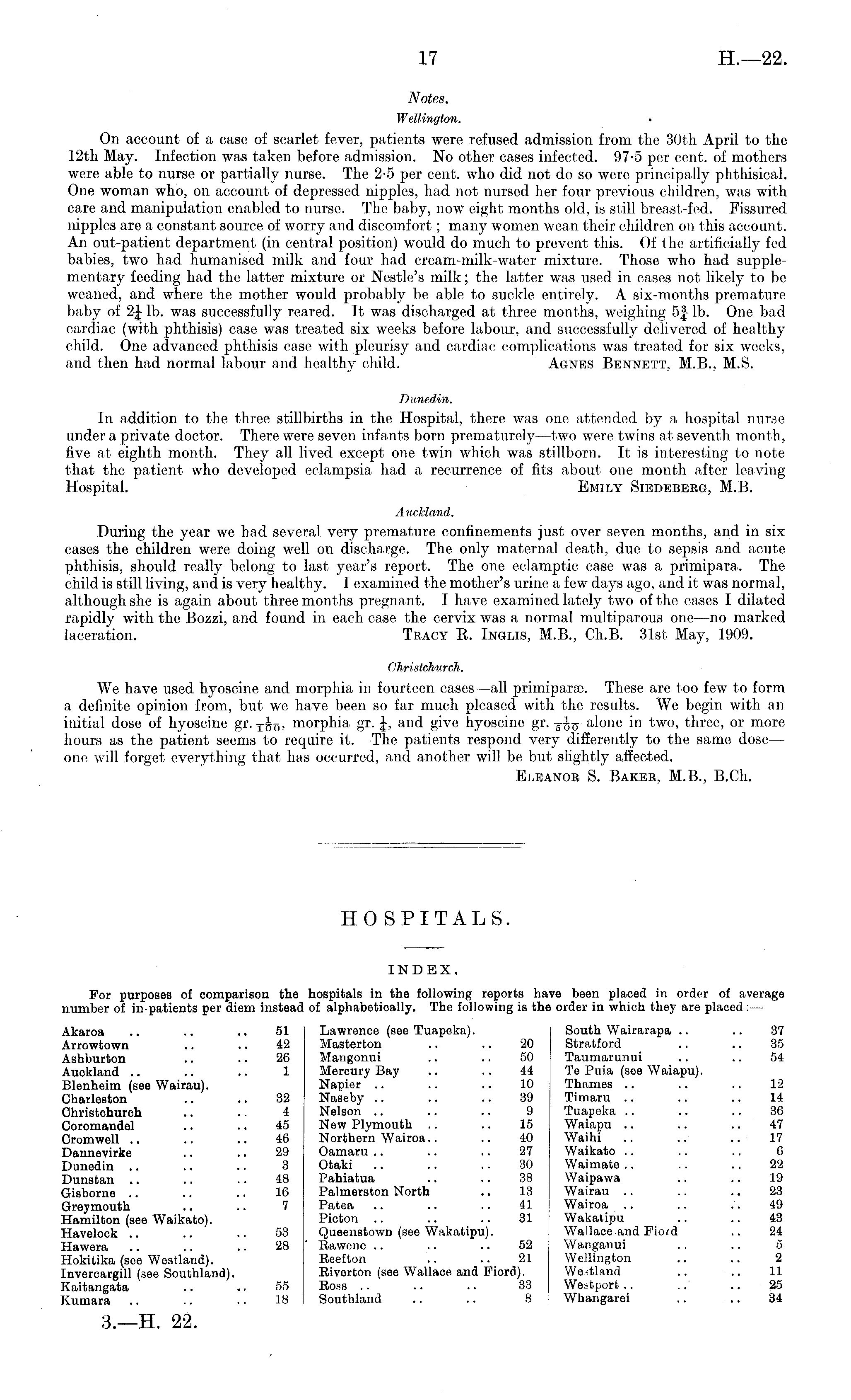 Notes. Wellington. On account of a case of scarlet fever, patients were refused admission from the 30th April to the 12th May. Infection was taken before admission. No other cases infected. 97-5 per cent, of mothers were able to nurse or partially nurse. The 2-5 per cent, who did not do so were principally phthisical. One woman who, on account of depressed nipples, had not nursed her four previous children, was with care and manipulation enabled to nurse. The baby, now eight months old, is still breast-fed. Fissured nipples are a constant source of worry and discomfort; many women wean their children on this account. An out-patient department (in central position) would do much to prevent this. Of the artificially fed babies, two had humanised milk and four had cream-milk-water mixture. Those who had supplementary feeding had the latter mixture or Ncstle's milk; the latter was used in cases not likely to be weaned, and where the mother would probably be able to suckle entirely. A six-months premature baby of 2J lb. was successfully reared. It was discharged at three months, weighing 5| lb. One bad cardiac (with phthisis) case was treated six weeks before labour, and successfully delivered of healthy child. One advanced phthisis case with pleurisy and cardiac complications was treated for six weeks, and then had normal labour and healthy child. Agnes Bennett, M.8., M.S. Dunedin. In addition to the three stillbirths in the Hospital, there was one attended by a hospital nurse under a private doctor. There were seven infants born prematurely—two were twins at seventh month, five at eighth month. They all lived except one twin which was stillborn. It is interesting to note that the patient who developed eclampsia had a recurrence of fits about one month after leaving Hospital. • Emily Siedeberg, M.B. Auckland. During the year we had several very premature confinements just over seven months, and in six cases the children were doing well on discharge. The only maternal death, due to sepsis and acute phthisis, should really belong to last year's report. The one eclamptic case was a primipara. The child is still living, and is very healthy. I examined the mother's urine a few days ago, and it was normal, although she is again about three months pregnant. I have examined lately two of the cases I dilated rapidly with the Bozzi, and found in each case the cervix was a normal multiparous one —no marked laceration. Tracy R. Inglis, M.8., Ch.B. 31st May, 1909. Christchurch. We have used hyoscine and morphia in fourteen cases —all primiparae. These are too few to form a definite opinion from, but we have been so far much pleased with the results. We begin with an initial dose of hyoscine gr. T J O , morphia gr. £, and give hyoscine gr. T £ w alone in two, three, or more hours as the patient seems to require it. The patients respond very differently to the same, dose— one will forget everything that has occurred, and another will be but slightly affected. Eleanor S. Baker, M.8., B.Ch.