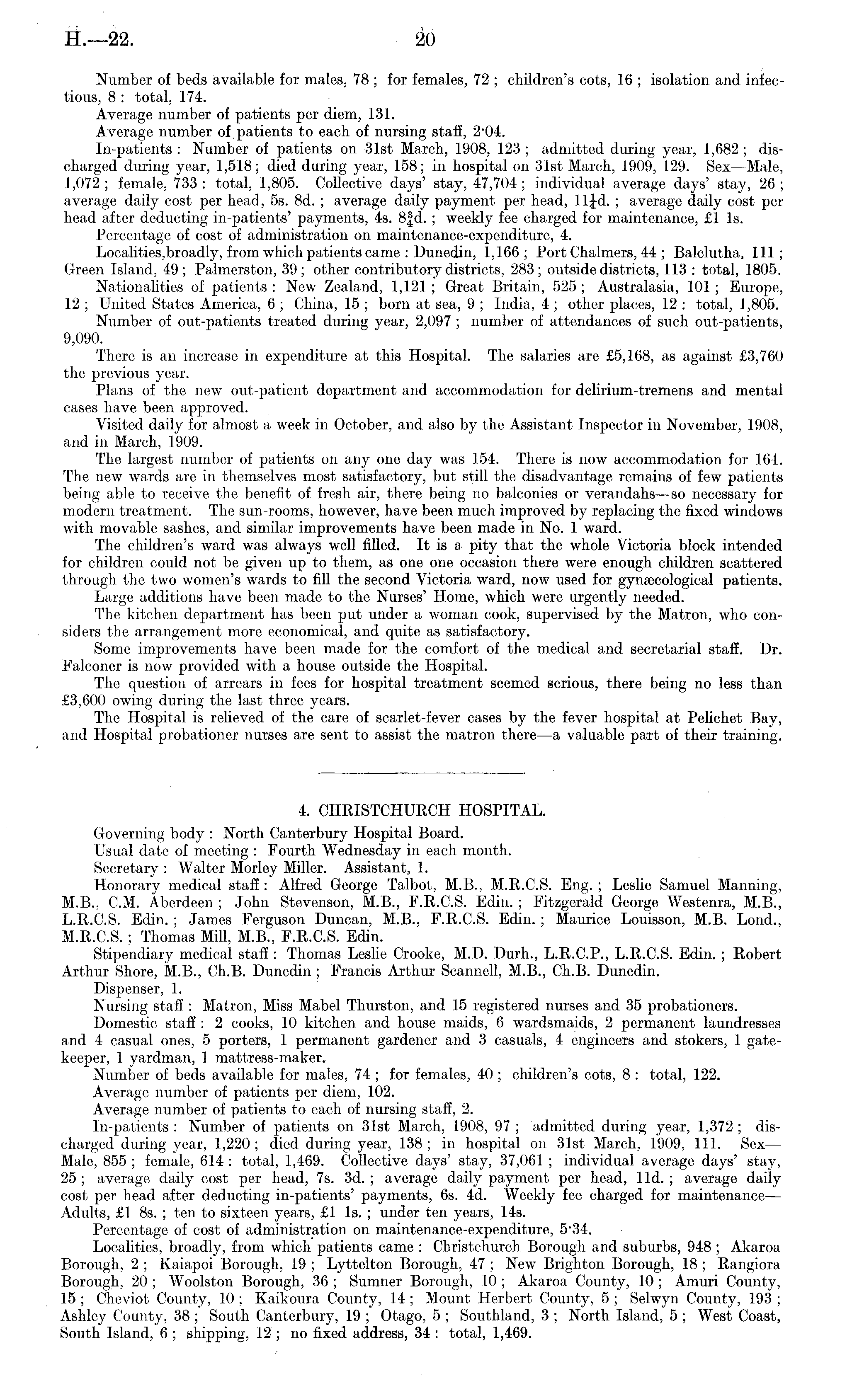Number of beds available for males, 78 ; for females, 72 ; children's cots, 16 ; isolation and infectious, 8 : total, 174. Average number of patients per diem, 131. Average number of patients to each of nursing staff, 204. In-patients : Number of patients on 31st March, 1908, 123 ; admitted during year, 1,682 ; discharged during year, 1,518; died during year, 158; in hospital on 31st March, 1909, 129. Sex —Male, 1,072 ; female, 733 : total, 1,805. Collective days' stay, 47,704 ; individual average days' stay, 26 ; average daily cost per head, ss. Bd. ; average daily payment per head, llj-d. ; average daily cost per head after deducting in-patients' payments, 4s. B|d. ; weekly fee charged for maintenance, £1 Is. Percentage of cost of administration on maintenance-expenditure, 4. Localities,broadly, from which patients came : Dunedin, 1,166; Port Chalmers, 44 ; Balclutha, 111; Green Island, 49; Palmerston, 39; other contributory districts, 283; outside districts, 113 : total, 1805. Nationalities of patients : New Zealand, 1,121 ; Great Britain, 525 ; Australasia, 101 ; Europe, 12 ; United States America, 6 ; China, 15 ; born at sea, 9 ; India, 4 ; other places, 12 : total, 1,805. Number of out-patients treated during year, 2,097 ; number of attendances of such out-patients, 9,090. There is an increase in expenditure at this Hospital. The salaries are £5,168, as against £3,760 the previous year. Plans of the new out-patient department and accommodation for delirium-tremens and mental cases have been approved. Visited daily for almost a week in October, and also by the Assistant Inspector in November, 1908, and in March, 1909. The largest number of patients on any one day was 154. There is now accommodation for 164. The new wards are in themselves most satisfactory, but still the disadvantage remains of few patients being able to receive the benefit of fresh air, there being no balconies or verandahs—so necessary for modern treatment. The sun-rooms, however, have been much improved by replacing the fixed windows with movable sashes, and similar improvements have been made in No. 1 ward. The children's ward was always well filled. It is a pity that the whole Victoria block intended for children could not be given up to them, as one one occasion there were enough children scattered through the two women's wards to fill the second Victoria ward, now used for gynaecological patients. Large additions have been made to the Nurses' Home, which were urgently needed. The kitchen department has been put under a woman cook, supervised by the Matron, who considers the arrangement more economical, and quite as satisfactory. Some improvements have been made for the comfort of the medical and secretarial staff. Dr. Falconer is now provided with a house outside the Hospital. The question of arrears in fees for hospital treatment seemed serious, there being no less than £3,600 owing during the last three years. The Hospital is relieved of the care of scarlet-fever cases by the fever hospital at Pelichet Bay, and Hospital probationer nurses are sent to assist the matron there—a valuable part of their training. 4. CHRISTCHURCH HOSPITAL. Governing body : North Canterbury Hospital Board. Usual date of meeting : Fourth Wednesday in each month. Secretary : Walter Morley Miller. Assistant, 1. Honorary medical staff : Alfred George Talbot, M.8., M.R.C.S. Eng. ; Leslie Samuel Manning, M.8., CM. Aberdeen ; John Stevenson, M.8., F.R.C.S. Edin. ; Fitzgerald George Westenra, M.8., L.R.CS. Edin. ; James Ferguson Duncan, M.8., F.R.C.S. Edin. ; Maurice Louisson, M.B. Lond., M.R.C.S. ; Thomas Mill, M.8., F.R.C.S. Edin. Stipendiary medical staff : Thomas Leslie Crooke, M.D. Durh., L.R.C.P., L.R.CS. Edin. ; Robert Arthur Shore, M.8., Ch.B. Dunedin ; Francis Arthur Scannell, M.8., Ch.B. Dunedin. Dispenser, 1. Nursing staff : Matron, Miss Mabel Thurston, and 15 registered nurses and 35 probationers. Domestic staff : 2 cooks, 10 kitchen and house maids, 6 wardsmaids, 2 permanent laundresses and 4 casual ones, 5 porters, 1 permanent gardener and 3 casuals, 4 engineers and stokers, 1 gatekeeper, 1 yardman, 1 mattress-maker. Number of beds available for males, 74 ; for females, 40 ; children's cots, 8 : total, 122. Average number of patients per diem, 102. Average number of patients to each of nursing staff, 2. In-patients : Number of patients on 31st March, 1908, 97 ; admitted during year, 1,372 ; discharged during year, 1,220 ; died during year, 138 ;in hospital on 31st March, 1909, 111. Sex— Male, 855 ; female, 614 : total, 1,469. Collective days' stay, 37,061 ; individual average days' stay, 25 ; average daily cost per head, 7s. 3d. ; average daily payment per head, lid. ; average daily cost per head after deducting in-patients' payments, 6s. 4d. Weekly fee charged for maintenance— Adults, £1 Bs. ; ten to sixteen years, £1 Is. ; under ten years, 14s. Percentage of cost of administration on maintenance-expenditure, 534. Localities, broadly, from which patients came : Christchurch Borough and suburbs, 948 ; Akaroa Borough, 2 ; Kaiapoi Borough, 19 ; Lyttelton Borough, 47 ; New Brighton Borough, 18 ; Rangiora Borough, 20 ; Woolston Borough, 36 ; Sumner Borough, 10 ; Akaroa County, 10 ; Amuri County, 15 ; Cheviot County, 10 ; Kaikoura County, 14 ; Mount Herbert County, 5 ; Selwyn County, 193 ; Ashley County, 38 ; South Canterbury, 19 ; Otago, 5 ; Southland, 3 ; North Island, 5 ; West Coast, South Island, 6 ; shipping, 12 ; no fixed address, 34 : total, 1,469.