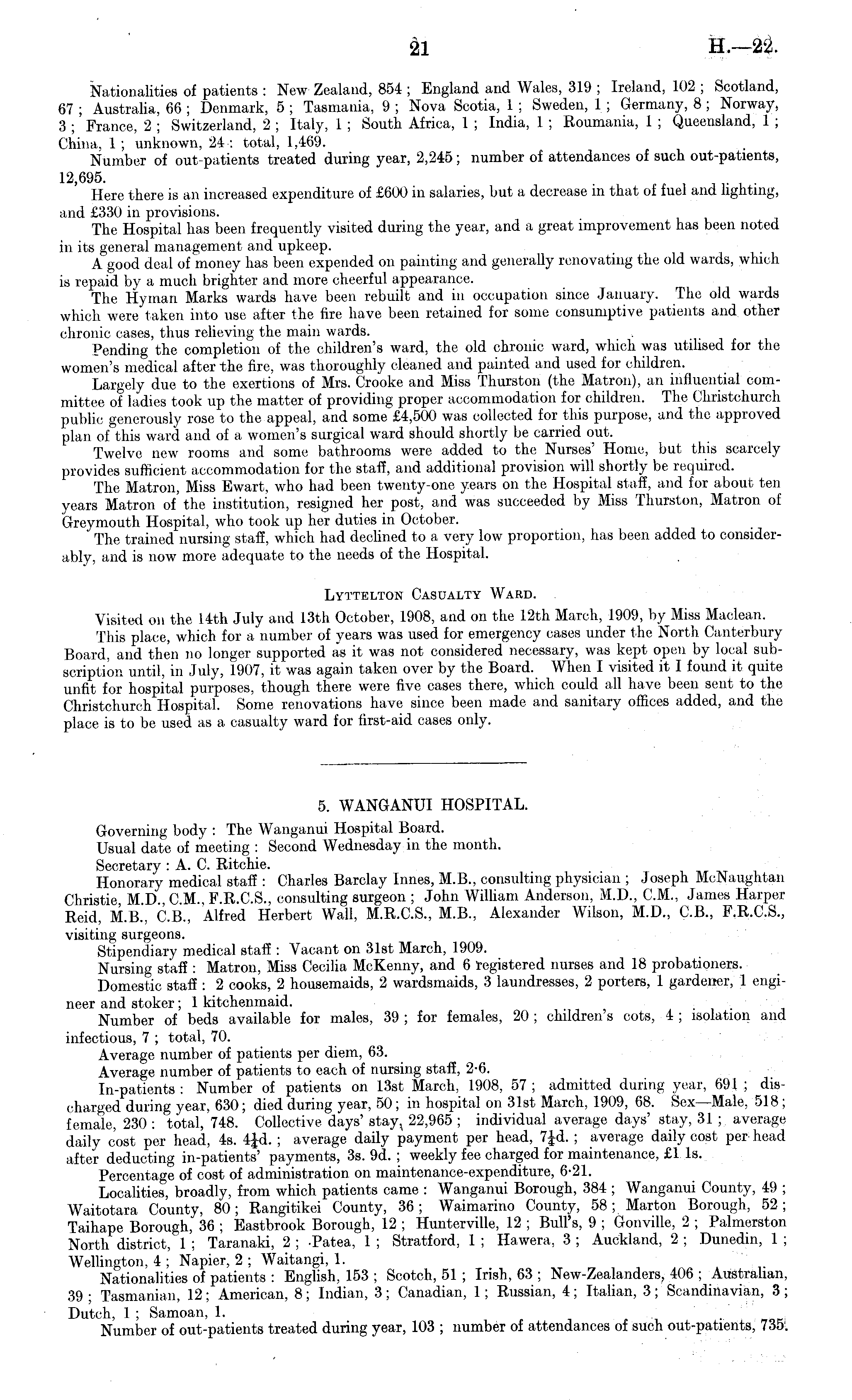 Nationalities of patients : New Zealand, 854 ; England and Wales, 319 ; Ireland, 102 ; Scotland, 67 ; Australia, 66 ; Denmark, 5 ; Tasmania, 9 ; Nova Scotia, 1 ; Sweden, 1 ; Germany, 8 ; Norway, 3 ; France, 2 ; Switzerland, 2 ; Italy, 1 ; South Africa, 1 ; India, 1 ; Roumania, 1 ; Queensland, 1 ; China, 1 ; unknown, 24 : total, 1,469. Number of out-patients treated during year, 2,245; number of attendances of such out-patients, 12,695. , Here there is an increased expenditure of £600 in salaries, but a decrease m that of fuel and lighting, and £330 in provisions. The Hospital has been frequently visited during the year, and a great improvement has been noted in its general management and upkeep. A good deal of money has been expended on painting and generally renovating the old wards, which is repaid by a much brighter and more cheerful appearance. The Hyman Marks wards have been rebuilt and in occupation since January. The old wards which were taken into use after the fire have been retained for some consumptive patients and other chronic cases, thus relieving the main wards. Pending the completion of the children's ward, the old chronic ward, which was utilised for the women's medical after the fire, was thoroughly cleaned and painted and used for children. Largely due to the exertions of Mrs. Crooke and Miss Thurston (the Matron), an influential committee of ladies took up the matter of providing proper accommodation for children. The Christchurch public generously rose to the appeal, and some £4,500 was collected for this purpose, and the approved plan of this ward and of a women's surgical ward should shortly be carried out. Twelve new rooms and some, bathrooms were added to the Nurses' Home, but this scarcely provides sufficient accommodation for the staff, and additional provision will shortly be required. The Matron, Miss Ewart, who had been twenty-one years on the Hospital staff, and for about ten years Matron of the institution, resigned her post, and was succeeded by Miss Thurston, Matron of Greymouth Hospital, who took up her duties in October. The trained nursing staff, which had declined to a very low proportion, has been added to considerably, and is now more adequate to the needs of the Hospital. Lyttelton Casualty Waed. Visited on the 14th July and L3th October, 1908, and on the 12th March, 1909, by Miss Maclean. This place, which for a number of years was used for emergency eases under the North Canterbury Board, and then no longer supported as it was not considered necessary, was kept open by local subscription until, in July, 1907, it was again taken over by the Board. When I visited it 1 found it quite unfit for hospital purposes, though there were five cases there, which could all have been sent to the Christchurch Hospital. Some renovations have since been made and sanitary offices added, and the place is to be used as a casualty ward for first-aid eases only. 5. WANGANUI HOSPITAL. Governing body : The Wanganui Hospital Board. Usual date of meeting : Second Wednesday in the month. Secretary : A. C Ritchie. Honorary medical staff : Charles Barclay limes, M.8., consulting physician ; Joseph McNaughtan Christie M D CM., F.R.C.S., consulting surgeon ; John William Anderson, M.D., CM., James Harper Reid, M.8., C.8., Alfred Herbert Wall, M.R.C.S., M.8., Alexander Wilson, M.D., C.8., F.R.C.S., visiting surgeons. Stipendiary medical staff : Vacant on 31st March, 1909. Nursing staff : Matron, Miss Cecilia McKenny, and 6 registered nurses and 18 probationers. Domestic staff : 2 cooks, 2 housemaids, 2 wardsmaids, 3 laundresses, 2 porters, 1 gardeiter, 1 engineer and stoker ; 1 kitchenmaid. Number of beds available for males, 39 ; for females, 20 ; children's cots, 4 ; isolation and infectious, 7 ; total, 70. Average number of patients per diem, 63. Average number of patients to each of nursing staff, 2-6. In-patients : Number of patients on 13st March, 1908, 57 ; admitted during year, 691 ; discharged during year, 630 ; died during year, 50 ;in hospital on 31st March, 1909, 68. Sex—Male, 518 ; female, 230 : total, 748. Collective days' stay, 22,965 ; individual average days' stay, 31 ; average daily cost per head, 4s. 4|d. ; average daily payment per head, 7Jd. ; average daily cost per head after deducting in-patients' payments, 3s. 9d. ; weekly fee charged for maintenance, £1 Is. Percentage of cost of administration on maintenance-expenditure, 6-21. Localities, broadly, from which patients came : Wanganui Borough, 384 ; Wanganui County, 49 ; Waitotara County, 80; Rangitikei County, 36; Waimarino County, 58; Marton Borough, 52; Taihape Borough, 36 ; Eastbrook Borough, 12 ; Hunterville, 12 ; Bull's, 9 ; Couville, 2 ; Palmerston North district, 1 ; Taranaki, 2 ; -Patea, 1 ; Stratford, 1 ; Hawera, 3 ; Auckland, 2 ; Dunedin, 1 ; Wellington, 4 ; Napier, 2 ; Waitangi, 1. Nationalities of patients : English, 153 ; Scotch, 51 ; Irish, 63 ; New-Zealanders, 406 ; Australian, 39; Tasmanian, 12; American, 8; Indian, 3; Canadian, 1; Russian, 4; Italian, 3; Scandinavian, 3; Dutch, 1 ; Samoan, 1. . Number of out-patients treated during year, 103 ; number of attendances of such out-patients, 735.