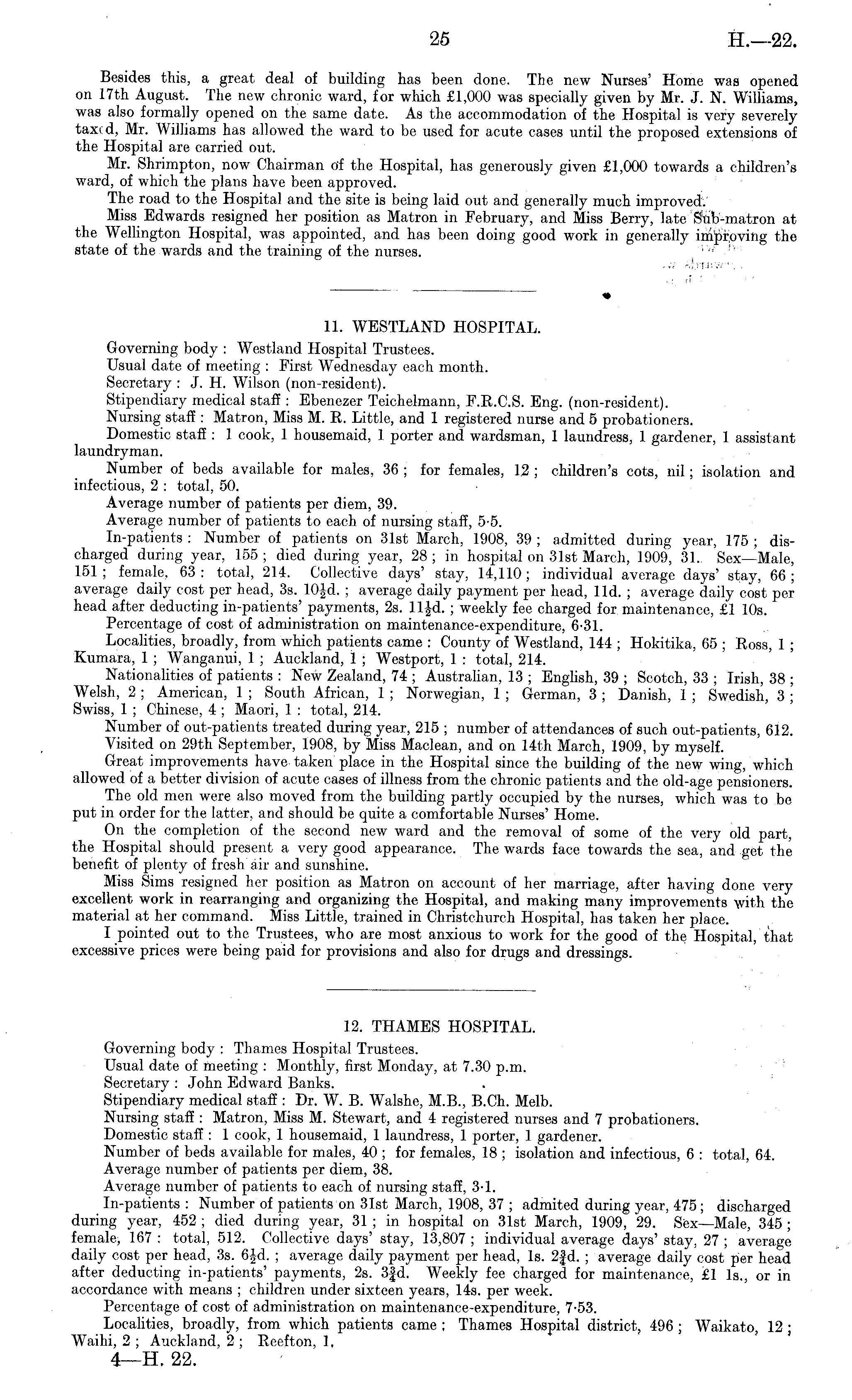 Besides this, a great deal of building has been done. The new Nurses' Home was opened on 17th August. The new chronic ward, for which £1,000 was specially given by Mr. J. N. Williams, was also formally opened on the same date. As the accommodation of the Hospital is very severely taxtd, Mr. Williams has allowed the ward to be used for acute cases until the proposed extensions of the Hospital are carried out. Mr. Shrimpton, now Chairman of the Hospital, has generously given £1,000 towards a children's ward, of which the plans have been approved. The road to the Hospital and the site is being laid out and generally much improved. Miss Edwards resigned her position as Matron in February, and Miss Berry, late Sub-matron at the Wellington Hospital, was appointed, and has been doing good work in generally improving the state of the wards and the training of the nurses. 11. WESTLAND HOSPITAL. Governing body : Westland Hospital Trustees. Usual date of meeting : First Wednesday each month. Secretary : J. H. Wilson (non-resident). Stipendiary medical staff : Ebenezer Teichelmann, F.R.C.S. Eng. (non-resident). Nursing staff : Matron, Miss M. R. Little, and 1 registered nurse and 5 probationers. Domestic staff : 1 cook, 1 housemaid, 1 porter and wardsman, 1 laundress, 1 gardener, 1 assistant laundryman. Number of beds available for males, 36 ; for females, 12 ; children's cots, nil; isolation and infectious, 2 : total, 50. Average number of patients per diem, 39. Average number of patients to each of nursing staff, 5-5. In-patients : Number of patients on 31st March, 1908, 39 ; admitted during year, 175 ; discharged during year, 155 ; died during year, 28 ; in hospital on 31st March, 1909, 31. Sex—Male, 151; female, 63: total, 214. Collective days' stay, 14,110; individual average days' stay, 66; average daily cost per head, 3s. 10|d. ; average daily payment per head, lid. ; average daily cost per head after deducting in-patients' payments, 2s. ll|d. ; weekly fee charged for maintenance, £1 10s. Percentage of cost of administration on maintenance-expenditure, 6-31. Localities, broadly, from which patients came : County of Westland, 144 ; Hokitika, 65 ; Ross, 1 ; Kumara, 1 ; Wanganui, 1 ; Auckland, 1 ; Westport, 1 : total, 214. Nationalities of patients : New Zealand, 74 ; Australian, 13 ; English, 39 ; Scotch, 33 ; Irish, 38 ; Welsh, 2 ; American, 1 ; South African, 1 ; Norwegian, 1 ; German, 3 ; Danish, 1 ; Swedish, 3 ; Swiss, 1 ; Chinese, 4 ; Maori, 1 : total, 214. Number of out-patients treated during year, 215 ; number of attendances of such out-patients, 612. Visited on 29th September, 1908, by Miss Maclean, and on 14th March, 1909, by myself. Great improvements have taken place in the Hospital since the building of the new wing, which allowed of a better division of acute cases of illness from the chronic patients and the old-age pensioners. The old men were also moved from the building partly occupied by the nurses, which was to be put in order for the latter, and should be quite a comfortable Nurses' Home. On the completion of the second new ward and the removal of some of the very old part, the Hospital should present a very good appearance. The wards face towards the sea, and get the benefit of plenty of fresh air and sunshine. Miss Sims resigned her position as Matron on account of her marriage, after having done very excellent work in rearranging and organizing the Hospital, and making many improvements with the material at her command. Miss Little, trained in Christchurch Hospital, has taken her place. I pointed out to the Trustees, who are most anxious to work for the good of the Hospital, that excessive prices were being paid for provisions and also for drugs and dressings.
