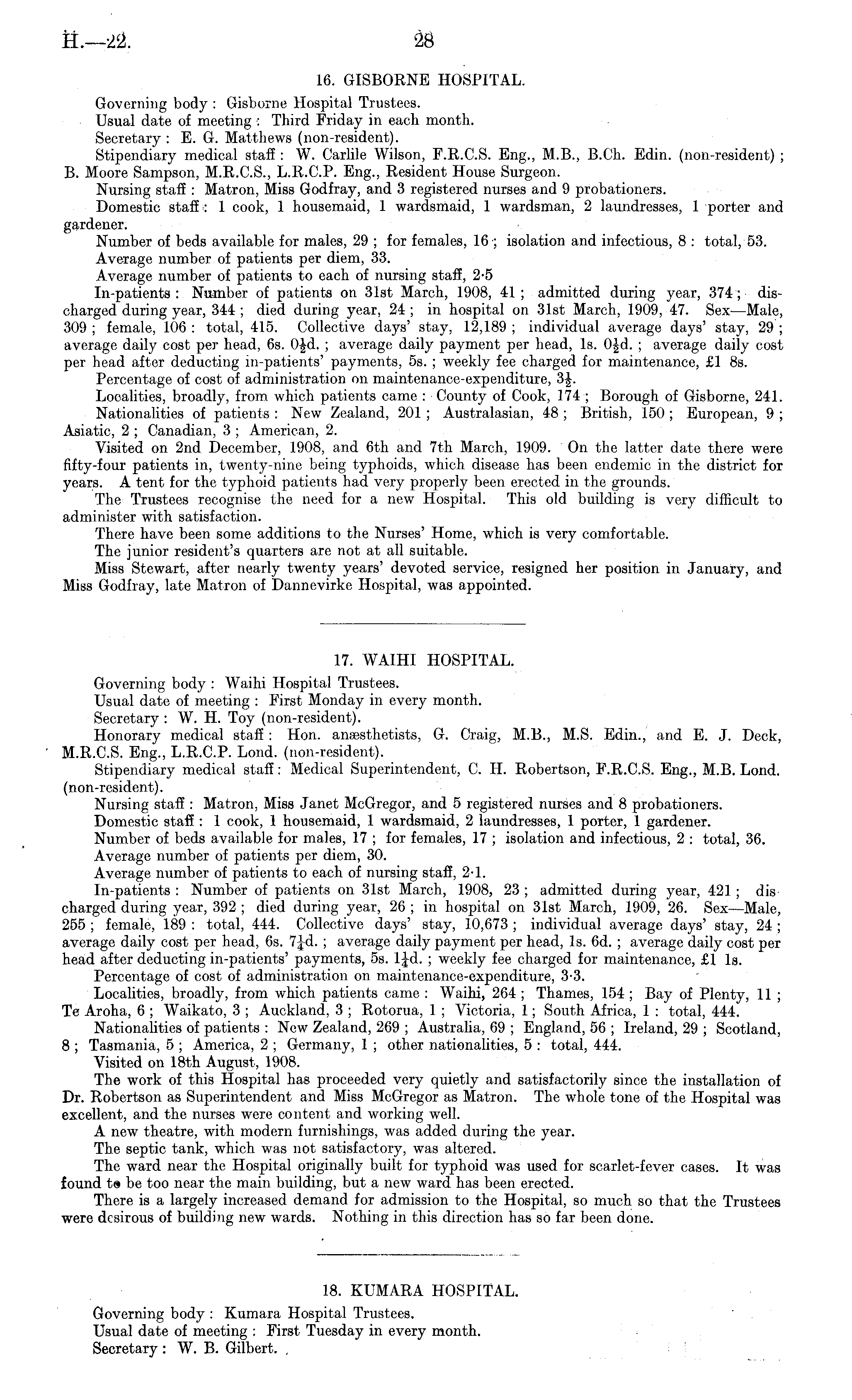 16. GISBORNE HOSPITAL. Governing body : Gisborne Hospital Trustees. Usual date of meeting : Third Friday in each month. Secretary : E. G. Matthews (non-resident). Stipendiary medical staff : W. Carlile Wilson, F.R.C.S. Eng., M.8., B.Ch. Edin. (non-resident) ; B. Moore Sampson, M.R.C.S., L.R.C.P. Eng., Resident House Surgeon. Nursing staff : Matron, Miss Godfray, and 3 registered nurses and 9 probationers. Domestic staff : 1 cook, 1 housemaid, 1 wardsmaid, 1 wardsman, 2 laundresses, 1 porter and gardener. Number of beds available for males, 29 ; for females, 16 ; isolation and infectious, 8 : total, 53. Average number of patients per diem, 33. Average number of patients to each of nursing staff, 2-5 In-patients : Number of patients on 31st March, 1908, 41 ; admitted during year, 374; discharged during year, 344 ; died during year, 24 ;in hospital on 31st March, 1909, 47. Sex—Male, 309 ; female, 106 : total, 415. Collective days' stay, 12,189 ; individual average days' stay, 29 ; average daily cost per head, 6s. OJd. ; average daily payment per head, Is. ; average daily cost per head after deducting in-patients' payments, ss. ; weekly fee charged for maintenance, £1 Bs. Percentage of cost of administration on maintenance-expenditure, 3J. Localities, broadly, from which patients came : County of Cook, 174 ; Borough of Gisborne, 241. Nationalities of patients : New Zealand, 201 ; Australasian, 48 ; British, 150 ; European, 9 ; Asiatic, 2 ; Canadian, 3 ; American, 2. Visited on 2nd December, 1908, and 6th and 7th March, 1909. On the latter date there were fifty-four patients in, twenty-nine being typhoids, which disease has been endemic in the district for years. A tent for the typhoid patients had very properly been erected in the grounds. The Trustees recognise the need for a new Hospital. This old building is very difficult to administer with satisfaction. There have been some additions to the Nurses' Home, which is very comfortable. The junior resident's quarters are not at all suitable. Miss Stewart, after nearly twenty years' devoted service, resigned her position in January, and Miss Godfray, late Matron of Dannevirke Hospital, was appointed.