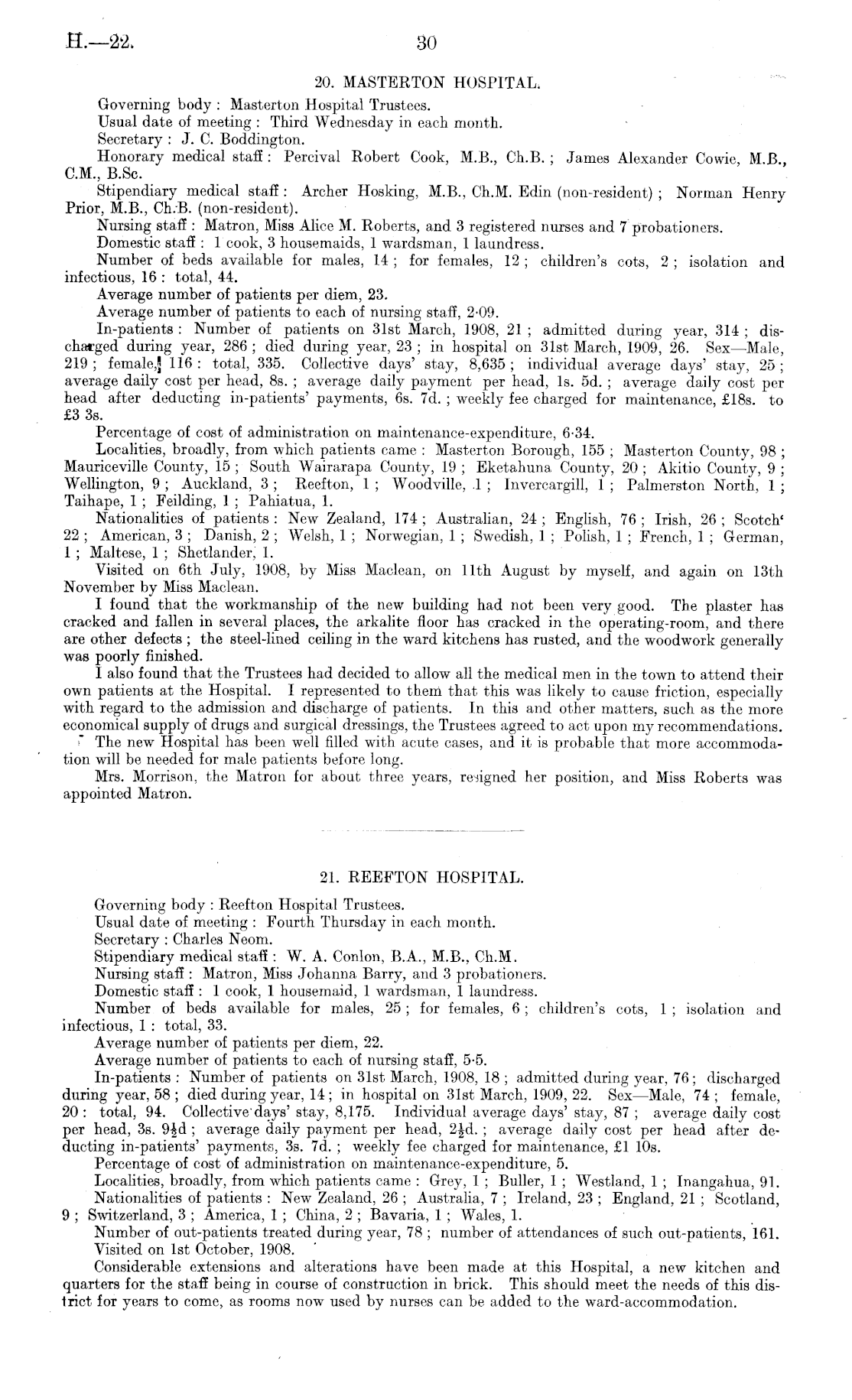 20. MASTERTON HOSPITAL. Governing body : Masterton Hospital Trustees. Usual date of meeting : Third Wednesday in each month. Secretary : J. C Boddington. Honorary medical staff : Percival Robert Cook, M.8., Ch.B. ; James Alexander Cowie, M.8., CM., B.Sc. Stipendiary medical staff : Archer Hosking, M.8., Ch.M. Edin (non-resident) ; Norman Henry Prior, M.8., Ch.B. (non-resident). Nursing staff : Matron, Miss Alice M. Roberts, and 3 registered nurses and 7 probationers. Domestic staff : 1 cook, 3 housemaids, 1 wardsman, 1 laundress. Number of beds available for males, 14; for females, 12 ; children's cots, 2 ; isolation and infectious, 16 : total, 44. Average number of patients per diem, 23. Average number of patients to each of nursing staff, 2-09. In-patients : Number of patients on 31st March, 1908, 21 ; admitted during year, 314 ; discharged during year, 286 ; died during year, 23 ; in hospital on 31st March, 1909, 26. Sex—Male, 219 ; female,] 116 : total, 335. Collective days' stay, 8,635 ; individual average days' stay, 25 ; average daily cost per head, Bs. ; average daily payment per head, Is. sd. ; average daily cost per head after deducting in-patients' payments, 6s. 7d. ; weekly fee charged for maintenance, £18s. to £3 3s. Percentage of cost of administration on maintenance-expenditure, 6-34. Localities, broadly, from which patients came : Masterton Borough, 155 ; Masterton County, 98 ; Mauriceville County, 15 ; South Wairarapa County, 19 ; Eketahuna County, 20 ; Akitio County, 9 ; Wellington, 9 ; Auckland, 3 ; Reefton, 1 ; Woodville, .1 ; Invercargill, 1 ; Palmerston North, 1 ; Taihape, 1 ; Feilding, 1 ; Pahiatua, 1. Nationalities of patients : New Zealand, 174 ; Australian, 24 ; English, 76 ; Irish, 26 ; Scotch' 22 ; American, 3 ; Danish, 2 ; Welsh, 1 ; Norwegian, 1 ; Swedish, 1 ; Polish, 1 ; French, 1 ; German, 1 ; Maltese, 1 ; Shetlander, 1. Visited on 6th July, 1908, by Miss Maclean, on 11th August by myself, and again on 13th November by Miss Maclean. I found that the workmanship of the new building had not been very good. The plaster has cracked and fallen in several places, the arkalite floor has cracked in the operating-room, and there are other defects ; the steel-lined ceiling in the ward kitchens has rusted, and the woodwork generally was poorly finished. I also found that the Trustees had decided to allow all the medical men in the town to attend their own patients at the Hospital. I represented to them that this was likely to cause friction, especially with regard to the admission and discharge of patients. In this and other matters, such as the more economical supply of drugs and surgical dressings, the Trustees agreed to act upon my recommendations. The new Hospital has been well filled with acute cases, and it is probable that more accommodation will be needed for male patients before long. Mrs. Morrison, the Matron for about three years, resigned her position, and Miss Roberts was appointed Matron.