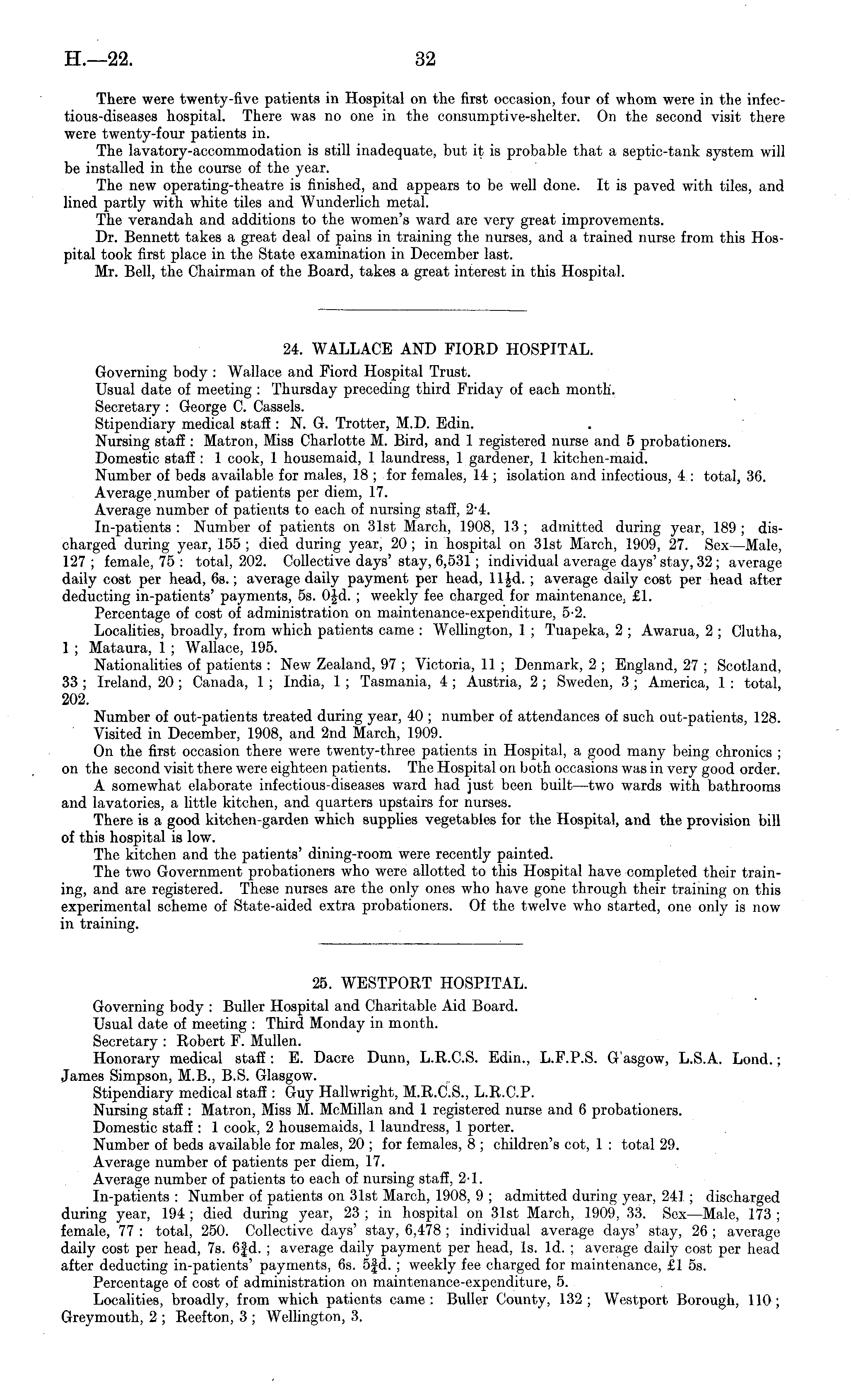 24. WALLACE AND FIORD HOSPITAL. Governing body : Wallace and Fiord Hospital Trust. Usual date of meeting : Thursday preceding third Friday of each month. Secretary : George C. Cassels. Stipendiary medical staff : N. G. Trotter, M.D. Edin. Nursing staff : Matron, Miss Charlotte M. Bird, and 1 registered nurse and 5 probationers. Domestic staff : 1 cook, 1 housemaid, 1 laundress, 1 gardener, 1 kitchen-maid. Number of beds available for males, 18 ; for females, 14 ; isolation and infectious, 4 : total, 36. Average .number of patients per diem, 17. Average number of patients to each of nursing staff, 2 - 4. In-patients : Number of patients on 31st March, 1908, 13 ; admitted during year, 189 ; discharged during year, 155 ; died during year, 20 ; in hospital on 31st March, 1909, 27. Sex—Male, 127 ; female, 75 : total, 202. Collective days' stay, 6,531; individual average days' stay, 32 ; average daily cost per head, 65.; average daily payment per head, lljd. ; average daily cost per head after deducting in-patients' payments, ss. o|d. ; weekly fee charged for maintenance, £1. Percentage of cost of administration on maintenance-expenditure, 5-2. Localities, broadly, from which patients came : Wellington, 1 ; Tuapeka, 2 ; Awarua, 2 ; Clutha, 1 ; Mataura, 1 ; Wallace, 195. Nationalities of patients : New Zealand, 97 ; Victoria, 11 ; Denmark, 2 ; England, 27 ; Scotland, 33 ; Ireland, 20 ; Canada, 1 ; India, 1 ; Tasmania, 4 ; Austria, 2 ; Sweden, 3 ; America, 1 : total, 202. Number of out-patients treated during year, 40 ; number of attendances of such out-patients, 128. ' Visited in December, 1908, and 2nd March, 1909. On the first occasion there were twenty-three patients in Hospital, a good many being chronics ; on the second visit there were eighteen patients. The Hospital on both occasions was in very good order. A somewhat elaborate infectious-diseases ward had just been built—two wards with bathrooms and lavatories, a little kitchen, and quarters upstairs for nurses. There is a good kitchen-garden which supplies vegetables for the Hospital, and the provision bill of this hospital is low. The kitchen and the patients' dining-room were recently painted. The two Government probationers who were allotted to this Hospital have completed their training, and are registered. These nurses are the only ones who have gone through their training on this experimental scheme of State-aided extra probationers. Of the twelve who started, one only is now in training. 25. WESTPORT HOSPITAL. Governing body : Buller Hospital and Charitable Aid Board. Usual date of meeting : Third Monday in month. Secretary : Robert F. Mullen. Honorary medical staff: E. Dacre Dunn, L.R.C.S. Edin., L.F.P.S. G'asgow, L.S.A. Lond.; James Simpson, M.8., B.S. Glasgow. Stipendiary medical staff : Guy Hallwright, M.R.C.S., L.R.C.P. Nursing staff : Matron, Miss M. McMillan and 1 registered nurse and 6 probationers. Domestic staff : 1 cook, 2 housemaids, 1 laundress, 1 porter. Number of beds available for males, 20 ; for females, 8 ; children's cot, 1 : total 29. Average number of patients per diem, 17. Average number of patients to each of nursing staff, 2-1. In-patients : Number of patients on 31st March, 1908, 9 ; admitted during year, 241 ; discharged during year, 194 ; died during year, 23 ; in hospital on 31st March, 1909, 33. Sox —Male, 173 ; female, 77 : total, 250. Collective days' stay, 6,478 ; individual average days' stay, 26 ; average daily cost per head, 7s. 6|d. ; average daily payment per head, Is. Id. ; average daily cost per head after deducting in-patients' payments, 6s. s|d. ; weekly fee charged for maintenance, £1 ss. Percentage of cost of administration on maintenance-expenditure, 5. Localities, broadly, from which patients came : Buller County, 132 ; Westport Borough, 110 ; Greymouth, 2 ; Reefton, 3 ; Wellington, 3.