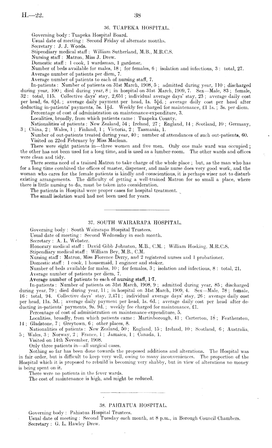 38. PAHIATUA HOSPITAL. Governing body : Pahiatua Hospital Trustees. Usual date of meeting : Second Tuesday each month, at 8 p.m., in Borough Council Chambers. Secretary : G. L. Hawley Drew.