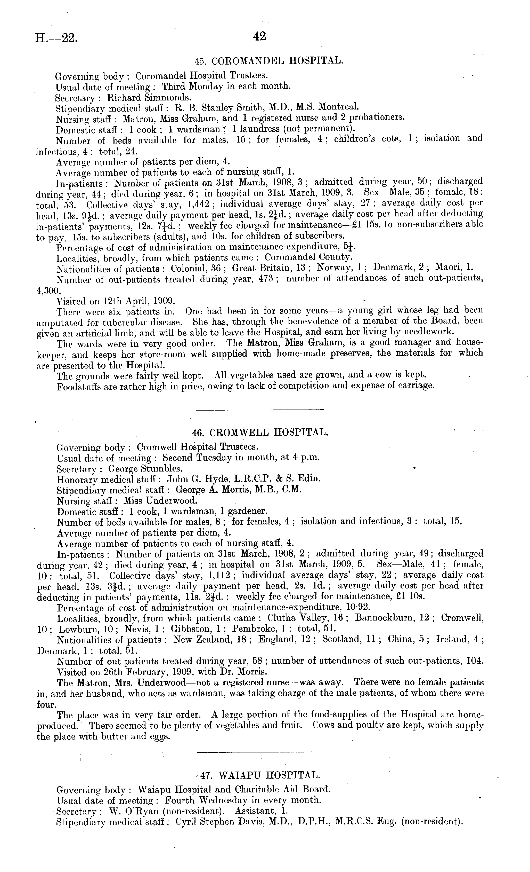 46. CROMWELL HOSPITAL. ' ' ' ' Governing body : Cromwell Hospital Trustees. Usual date of meeting : Second Tuesday in month, at 4 p.m. Secretary : George Stumbles. Honorary medical staff : John G. Hyde, L.R.C.P. & S. Edin. Stipendiary medical staff : George A. Morris, M.8., CM. Nursing staff : Miss Underwood. Domestic staff : 1 cook, 1 wardsman, 1 gardener. Number of beds available for males, 8 ; for females, 4 ; isolation and infectious, 3 : total, 15. Average number of patients per diem, 4. Average number of patients to each of nursing staff, 4. In-patients : Number of patients on 31st March, 1908, 2 ; admitted during year, 49; discharged during year, 42 ; died during year, 4 ; in hospital on 31st March, 1909, 5. Sex—Male, 41 ; female, 10: total, 51. Collective days' stay, 1,112; individual average days' stay, 22; average daily cost per head, 13s. 3|d. ; average daily payment per head, 2s. Id. ; average daily cost per head after deducting in-patients' payments, lis. 2Jd. ; weekly fee charged for maintenance, £1 10s. Percentage of cost of administration on maintenance-expenditure, 10-92. Localities, broadly, from which patients came : Clutha Valley, 16 ; Bannockburn, 12 ; Cromwell, 10 ; Lowburn, 10 ; Nevis, 1 ; Gibbston, 1 ; Pembroke, 1 : total, 51. Nationalities of patients : New Zealand, 18 ; England, 12 ; Scotland, 11 ; China, 5 ; Ireland, 4 ; Denmark, 1 : total, 51. Number of out-patients treated during year, 58 ; number of attendances of such out-patients, 104. Visited on 26th February, 1909, with Dr. Morris. The Matron, Mrs. Underwood—not a registered nurse—was away. There were no female patients in, and her husband, who acts as wardsman, was taking charge of the male patients, of whom there were four. The place was in very fair order. A large portion of the food-supplies of the Hospital are homeproduced. There seemed to be plenty of vegetables and fruit. Cows and poulty are kept, which supply the place with butter and eggs. • 47. WAIAPU HOSPITAL. Governing body : Waiapu Hospital and Charitable Aid Board. Usual date of meeting : Fourth Wednesday in every month. Secretary: W. O'Ryan (non-resident). Assistant,!, Stipendiary medical staff: Cyril Stephen Davis, M.D., D.P.H., M.R.C.S. Eng. (non-resident).