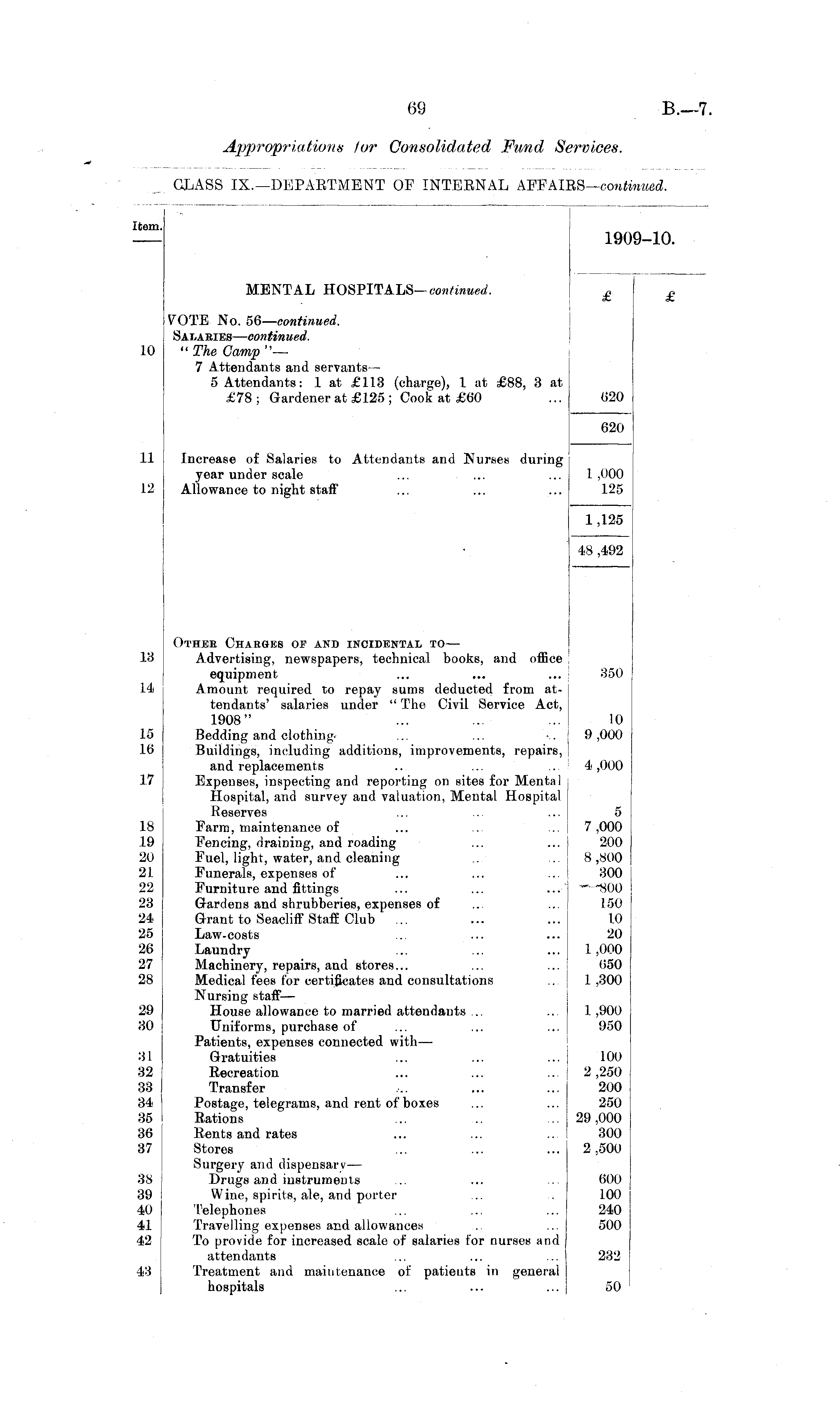 item. 190' 1-10. MENTAL HOSPITALS- continued. 10 VOTE No. 56— continued. Salaries — continued. " The Camp " — 7 Attendants and servants— 5 Attendants: 1 at £113 (charge), 1 at £88, 3 at £78 ; Gardener at £125 ; Cook at £60 620 620 11 12 Increase of Salaries to Attendants and Nurses during year under scale Allowance to night staff 1,000 125 1,125 48 ,492 18 19 20 21 22 23 24 25 26 27 28 13 14 15 16 17 Other Charges op and incidental to — Advertising, newspapers, technical books, and office equipment Amount required to repay sums deducted from attendants' salaries under " The Civil Service Act, 1908" Bedding and clothingBuildings, including additions, improvements, repairs, and replacements Expenses, inspecting and reporting on sites for Mental Hospital, and survey and valuation, Mental Hospital Reserves Farm, maintenance of Fencing, draining, and roading Fuel, light, water, and cleaning Funerals, expenses of Furniture and fittings ... ... ... | Gardens and shrubberies, expenses of Grant to Seacliff Staff Club Law-costs Laundry Machinery, repairs, and stores... ... ... Medical fees for certificates and consultations Nursing staff— House allowance to married attendants ... Uniforms, purchase of Patients, expenses connected with— Gratuities Recreation Transfer Postage, telegrams, and rent of boxes Rations Rents and rates Stores Surgery and dispensary— Drugs and instruments Wine, spirits, ale, and porter Telephones Travelling expenses and allowances To provide for increased scale of salaries for nurses and attendants Treatment and maintenance of patients in general hospitals 350 10 9,000 4,000 5 7,000 200 8 ,800 300 800 150 10 20 1,000 650 1 ,300 29 30 1,900 950 31 32 33 34 35 36 37 100 2 ,250 200 250 29 ,000 300 2,500 38 39 40 41 42 600 100 240 500 232 43 50