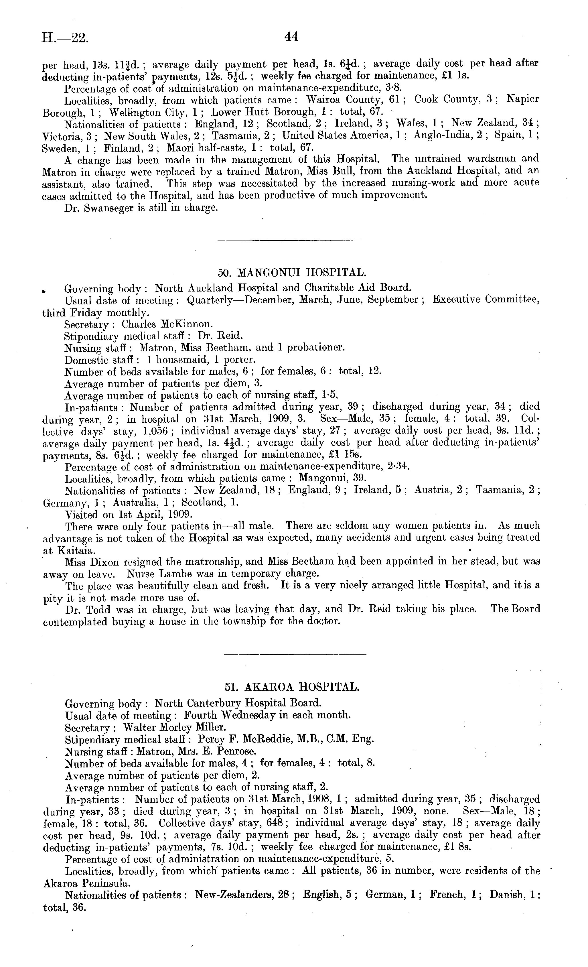 50. MANGONUI HOSPITAL. . Governing body : North Auckland Hospital and Charitable Aid Board. Usual date of meeting : Quarterly—December, March, June, September ; Executive Committee, third Friday monthly. Secretary : Charles McKinnon. Stipendiary medical staff : Dr. Reid. Nursing staff : Matron, Miss Beetham, and 1 probationer. Domestic staff : 1 housemaid, 1 porter. Number of beds available for males, 6 ; for females, 6 : total, 12. Average number of patients per diem, 3. Average number of patients to each of nursing staff, T5. In-patients : Number of patients admitted during year, 39 ; discharged during year, 34 ; died during year, 2; in hospital on 31st March, 1909, 3. Sex—Male, 35 ; female, 4 : total, 39. Collective days' stay, 1,056 ; individual average days' stay, 27 ; average daily cost per head, 9s. lid. ; average daily payment per head, Is. 4|d. ; average daily cost per head after deducting in-patients' payments, Bs. 6Jd. ; weekly fee charged for maintenance, £1 15s. Percentage of cost of administration on maintenance-expenditure, 2-34. Localities, broadly, from which patients came : Mangonui, 39. Nationalities of patients : New Zealand, 18 ; England, 9 ; Ireland, 5 ; Austria, 2 ; Tasmania, 2 ; Germany, 1 ; Australia, 1 ; Scotland, 1. Visited on Ist April, 1909. There were only four patients in—all male. There are seldom any women patients in. As much advantage is not taken of the Hospital as was expected, many accidents and urgent cases being treated at Kaitaia. Miss Dixon resigned the matronship, and Miss Beetham had been appointed in her stead, but was away on leave. Nurse Lambe was in temporary charge. The place was beautifully clean and fresh. It is a very nicely arranged little Hospital, and it is a pity it is not made more use of. Dr. Todd was in charge, but was leaving that day, and Dr. Reid taking his place. The Board contemplated buying a house in the township for the doctor.