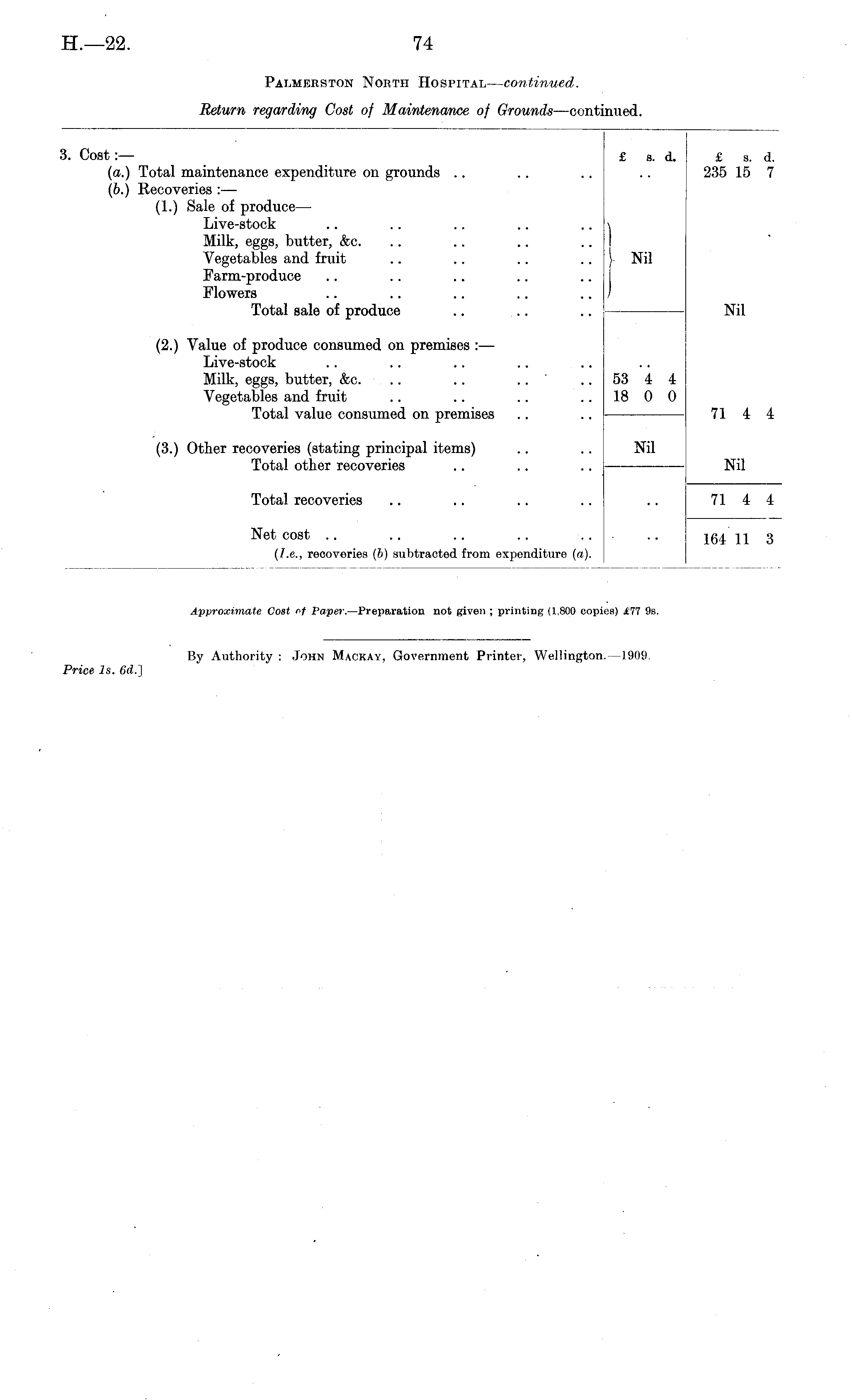 I. Cost :— (a.) Total maintenance expenditure on grounds .. (b.) Recoveries :— (1.) Sale of produce— Live-stock Milk, eggs, butter, &c. Vegetables and fruit Farm-produce Flowers Total sale of produce £ s. d. ) £ s. d. 235 15 7 \ Nil J Nil (2.) Value of produce consumed on premises : — Live-stock Milk, eggs, butter, &c. .. .. Vegetables and fruit Total value consumed on premises 53 4 4 18 0 0 71 4 4 (3.) Other recoveries (stating principal items) Total other recoveries Nil Nil Total recoveries 71 4 4 Net cost 164 11 3 (I.e., recoveries (b) subtracted from expenditure (a).