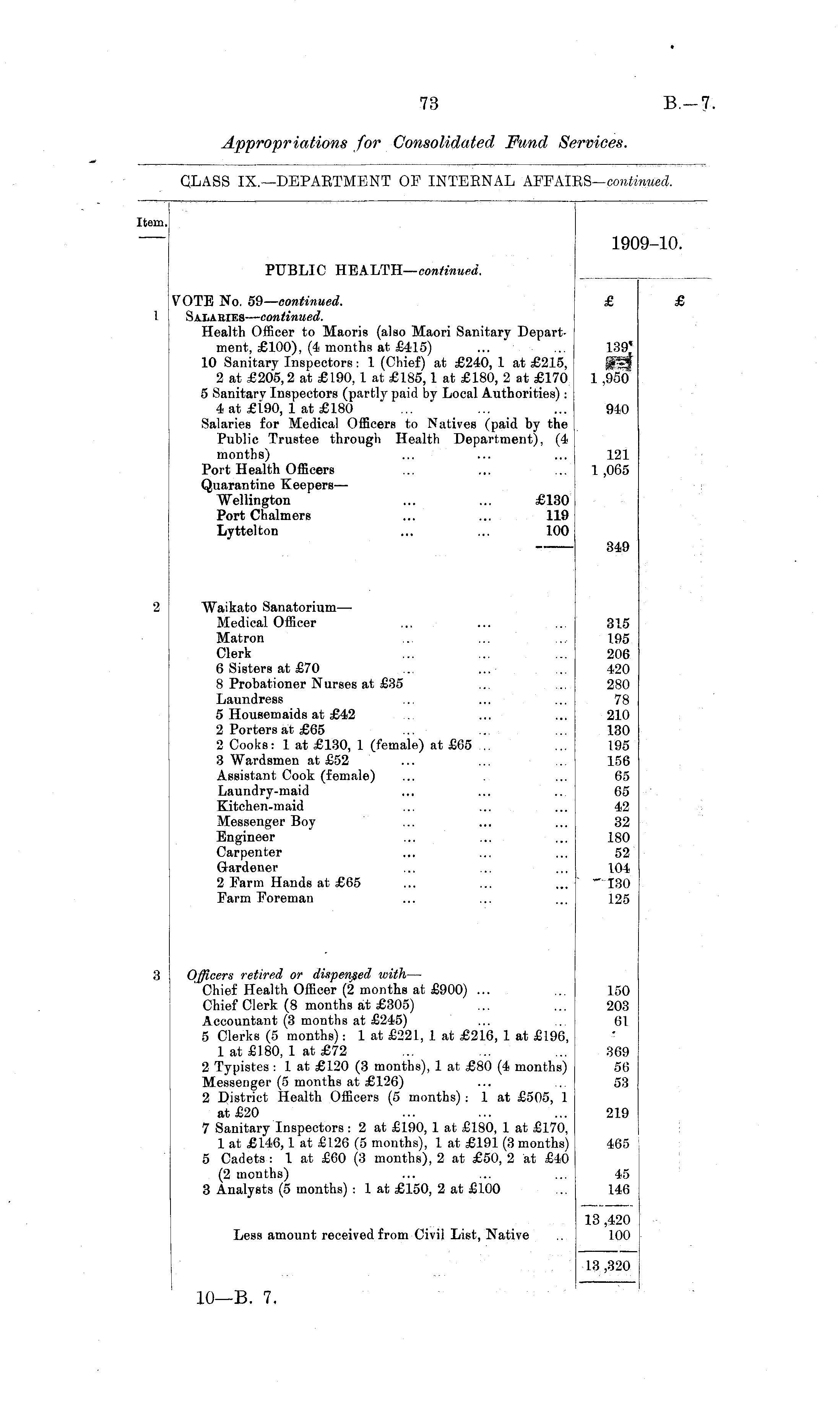 Item. 1909-10. PUBLIC HEALTH— continued. VOTE No. 59— continued. Salaries — continued. Health Officer to Maoris (also Maori Sanitary Department, £100), (4 months at £415) 10 Sanitary Inspectors: 1 (Chief) at £240, 1 at £215, 2 at £205,2 at £190,1 at £185,1 at £180, 2 at £170 5 Sanitary Inspectors (partly paid by Local Authorities): 4 at £190, 1 at £180 Salaries for Medical Officers to Natives (paid by the Public Trustee through Health Department), (4 months) Port Health Officers Quarantine Keepers — Wellington ... ... £130 Port Chalmers ... ... 119 Lyttelton ... ... 100 £ £ 139* m 1,950 940 121 1,065 349 Waikato Sanatorium— Medical Officer ... ... ... Matron Clerk 6 Sisters at £70 8 Probationer Nurses at £35 Laundress 5 Housemaids at £42 2 Porters at £65 2 Cooks: 1 at £130, 1 (female) at £65 ... 3 Wardsmen at £52 Assistant Cook (female) Laundry-maid Kitchen-maid Messenger Boy Engineer Carpenter Gardener 2 Farm Hands at £65 Farm Foreman 315 195 206 420 280 78 210 130 195 156 65 65 42 32 180 52 104 -~-_30 125 Officers retired or dispensed with — Chief Health Officer (2 months at £900) ... Chief Clerk (8 months at £305) Accountant (3 months at £245) 5 Clerks (5 months): 1 at £221, 1 at £216, 1 at £196, 1 at £180, 1 at £72 2 Typistes : 1 at £120 (3 months), 1 at £80 (4 months) Messenger (5 months at £126) 2 District Health Officers (5 months) : 1 at £505, 1 at £20 7 Sanitary Inspectors : 2 at £190, 1 at £180, 1 at £170, 1 at £146,1 at £126 (5 months), 1 at £191 (3 months) 5 Cadets : 1 at £60 (3 months), 2 at £50, 2 at £40 (2 months) 3 Analysts (5 months) : 1 at £150, 2 at £100 150 203 61 369 56 53 219 465 j 45 146 Less amount received from Civil List, Native 13 ,420 100 13 ,320