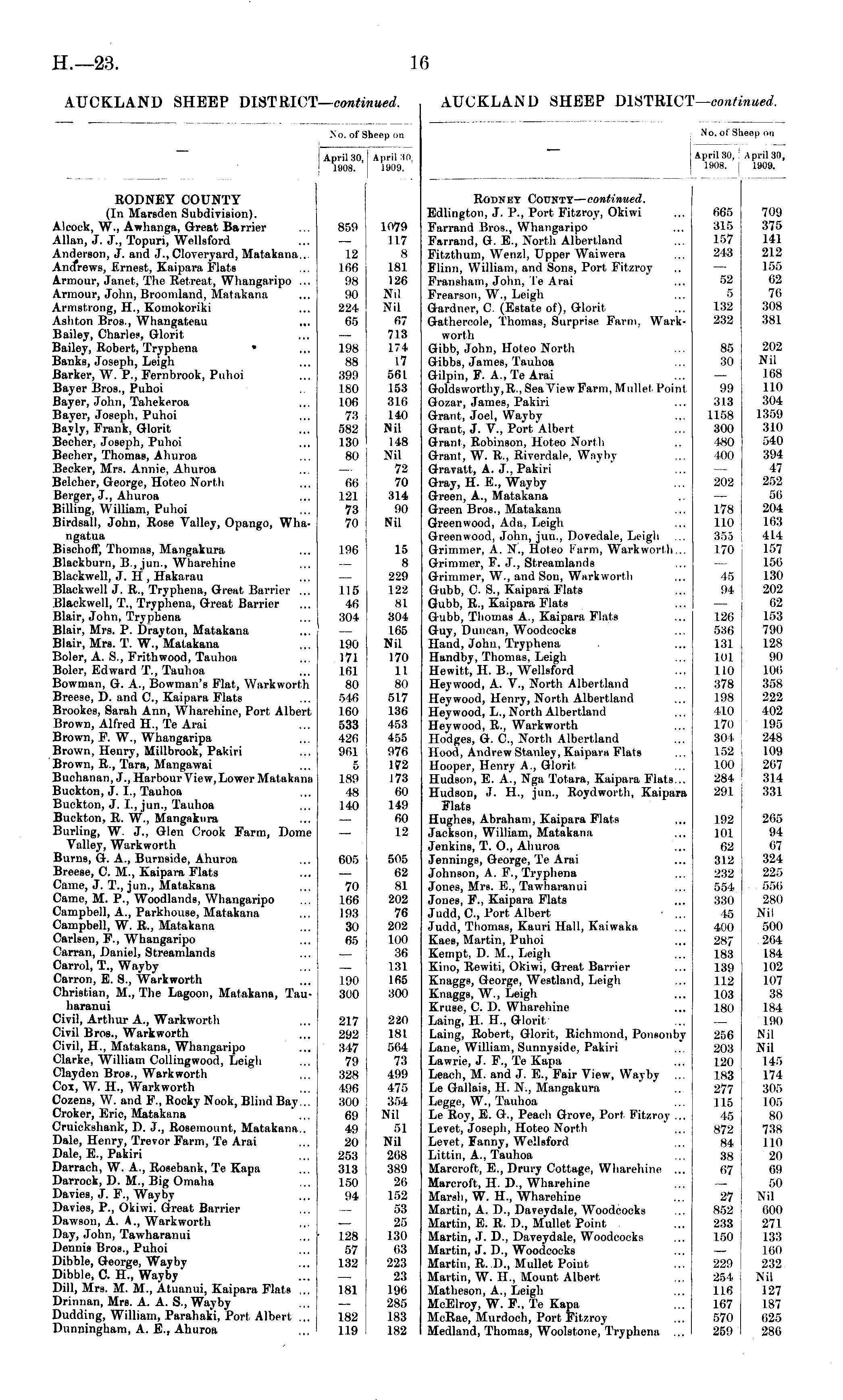 No. of Sheep on April 30, April 30, 1908. J 1909. Rodney County— continued. Edlington, J. P., Port Fiteroy, Okiwi Farrand Bros., Whangaripo Farrand, G. E., North Albertland Fitzthum, Wenzl, Upper Waiwera Flinn, William, and Sons, Port Fitzroy Franahani, Jolin, Te Aral Frearson, W., Leigh Gardner, C. (Estate of), GHorit Gathercole, Thomas, Surprise Farm, Warkworth Gibb, John, Hoteo North Gibbs, James, Tauhoa Gilpin, F. A., Te Arai Goldsworthy,R., Sea View Farm, Mullet Point Gozar, James, Pakiri Grant, Joel, Wayby Grant, J. V., Port Albert Grant, Robinson, Hoteo North Grant, W. R., Riverdale, Weyby GraTatt, A. J., Pakiri Gray, H. E., Wayby Green, A., Matakana Green Bros., Matakana Greenwood, Ada, Leigh Greenwood, John, jun., Dovedale, Leigh Grimmer, A. N., Hoteo Farm, Wark worth... Grimmer, F. J., Streamlands Grimmer, W., and Son, Warkworth Gubb, 0. S., Kaipara Flats Gubb, R., Kaipara Flats Gubb, Thomas A., Kaipara Flats Guy, Duncan, Woodcocks Hand, John, Tryphena Handby, Thomas, Leigh Hewitt, H. B., Wellsford Hey wood, A. V., North Albertland Heywood, Henry, North Albertland Hey wood, L., North Albertland Heywood, R., Warkworth Hodges, G. C, North Albertland Hood, Andrew Stanley, Kaipara Flats Hooper, Henry A., Glorit Hudson, E. A., Nga Totara, Kaipara Flats... Hudson, J. H., jun., Roydwoith, Kaipara Flats Hughes, Abraham, Kaipara Flats Jackson, William, Matakana Jenkins, T. O., Ahuroa Jennings, George, Te Arai Johnson, A. F., Tryphena Jones, Mrs. E., Tawharanui Jones, F., Kaipara Flats Judd, 0., Port Albert ■ ... Judd, Thomas, Kauri Hall, Kaiwaka Kaes, Martin, Puhoi Kempt, D. M., Leigh Kino, Rewiti, Okiwi, Great Barrier Knaggs, George, Westland, Leigh Knaggs, W., Leigh Kruse, C. D. Wharehine Laing, H. II., Glorit Laing, Robert, Glorit, Richmond, Ponsonby Lane, William, Sunnyside, Pakiri Lawrie, J. F., Te Kapa Leach, M. and J. E., Fair View, Wayby ... Le Gallais, H. N., Mangakura Legge, W., Tauhoa Le Roy, E. G., Peach Grove, Port Fitzroy ... Levet, Joseph, Hoteo North Levet, Fanny, Wellsford Littin, A., Tauhoa Marcroft, E., Drury Cottage, Wharehine ... Marcroft, II. D., Wharehine Maveh, W. H., Wharehine Martin, A. D., Daveydale, Woodcocks Martin, E. R. D., Mullet Point Martin, J. D., Daveydale, Woodcocks Martin, J. D., Woodcocks Martin, R. D., Mullet Point Martin, W. H., Mount Albert Matheson, A., Leigh McElroy, W. F., Te Kapa McRae, Murdoch, Port Fitzroy Medland, Thomas, Woolstone, Tryphena ... 665 709 315 375 157 141 243 212 155 52 02 5 7(i 132 308 232 381 85 202 30 Nil — 108 99 HO 313 304 1158 1359 300 310 480 540 4.00 394 — 47 202 252 — 50 178 204 110 103 355 414 170 157 150 45 130 94 202 — , 02 126 ; 153 536 j 790 131 I 128 101 , 9(1 110 100 378 358 198 222 410 402 170 J 195 304 248 152 109 100 i 207 284 314 291 :s:si 192 i 2(i5 101 94 i a 07 312 324 232 I 225 554 550 330 280 45 Nil 400 500 287 264 183 184 139 102 112 107 103 38 180 184 — L90 256 Nil 203 Nil 120 145 183 174 277 305 115 105 45 80 872 73H 84 110 38 I 20 67 I 09 — 50 27 Nil 852 600 233 271 150 133 — 100 229 ! 232 254 i Nil 116 127 167 187 570 025 259 280