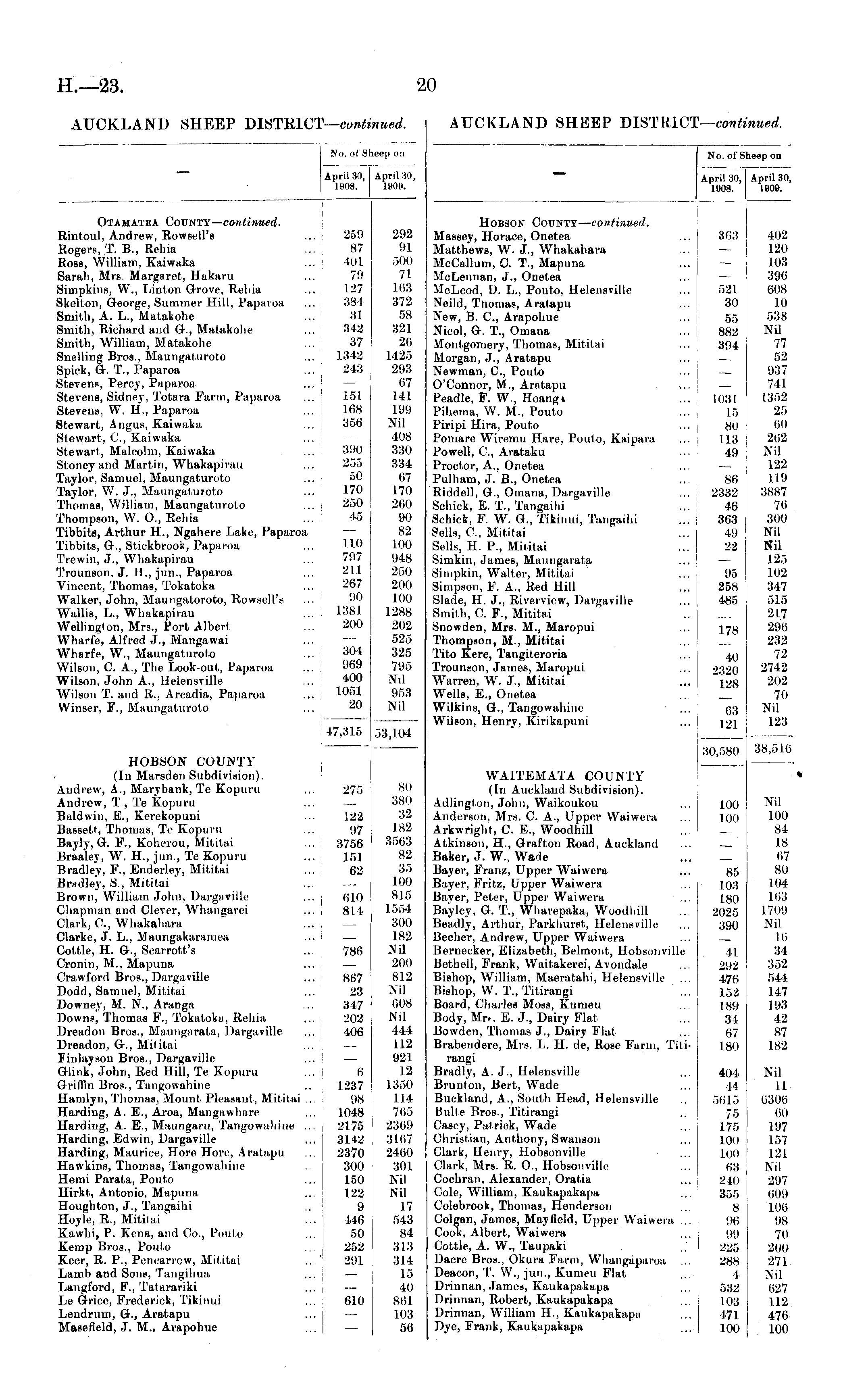 No. of Sheep on April 30, April 30, 1908. 1909. Hobson County— continued. Massey, Horace, Onetea ... 363 Matthews, W. J., Whakabara ... — McCallum, 0. T., Mapuna ... — McLennan, J., Onetea ... j — MeLeod, D. L., Pouto, Helenefille ... j 521 Neild, Thomas, Aratapu ... 30 New, B. C, Arapohue ... r>5 Nicol, G. T., Omana ... 882 Montgomery, Tbomas, Mitilui ... 304 Morgan, J., Aratapu ... — Newman, 0., Pouto ... | — O'Connor, M., Aratapu ... — Peadle, F. W., Hoangt ... 108] Pihema, W. M., Pouto ... 15 Piripi Hira, Pouto ... 80 Pomare Wiremu Hare, Poulo, Kaipara ... ll:j Powell, C, Arataku ... 4'.) Proctor, A., Onetea ... — Pulham, J. B., Onetea ... 86 Riddell, G., Omana, Dargaville ...I 2332 Scliick, E. I., Tangailii ... 46 Schick, F. W. G., Tikinui, Tangaihi ... 363 Sells, C, Mititni ... 49 Sells, H. P., Mititai ... 22 Simkin, James, Maungarata ... — Simpkin, Walter, Mititai ... 05 Simpson, F. A., Red Hill ... 258 Slade, H. J., Riverview, Dargaville ... 485 Smith, C. F., Mititai .. j Snowden, Mrs. M., Maropui ... 178 Thompson, M., Mititai Tito Kere, Tangiteroria ... 40 Trounson, James, Maropui ... 2320 Warren, W. J., Mititai ... jyg Wells, E., Onetea Wilkins, G., Tangowahine ... j (;;{ Wilson, Henry, Kirikapuni ... ]21 402 120 103 390 608 10 538 Nil 77 52 937 741 1352 25 (ill 202 Nil 122 119 3887 70 300 Nil Nil 125 102 347 515 217 290 232 72 2742 202 70 Nil 123 30,580 38,510 WAITEMATA COUNTY (In Auckland Subdivision). Adlington, Jolin, Waikoukou ... 100 Anderson, Mrs. C. A., Upper Waiwera ... KM) Arkwright, C. E., Woodhill Atkineoii, H., Grafton Road, Auckland ... Baker, J. W., Wade ... _ Bayer, Franz, Upper Waiwera ... 85 Bayer, Fritz, Upper Waiwera ... 103 Bayer, Peter, Upper Waiwera ... 180 Bayley, G. T., Wharepaka, Woodhill ,. 2025 Beadly, Arthur, Parkhurst, Helensville ... 390 Becher, Andrew, Upper Waiwera ... — Bernecker, Elizabeth, Belmont, Hobaonville M Bethell, Frank, Waitakerei, Avondale ... 292 Bishop, William, Maeratahi, Helensville ... 476 Bishop, W. T., Titirangi ... 152 Board, Charles Moss, Kurneu ... 18!» Body, Mr>. E. J., Dairy Flat ... .j | Bowden, Tbomas J., Dairy Flat ... (57 Brabendere, Mrs. L. H. de, Rose Farm, Titi- 180 rangi Bradly, A. J., Helensville ... 404 Brunlon, Bert, Wade ... 44 Buckland, A., South Head, Helensville .. 5616 Bulle Bros., Titirangi .. 75 Casey, Patrick, Wade ... 175 Christian, Anthony, Swanson ... 10O Clark, Henry, Hobsonvillu ... UK) Clark, Mrs. R. 0., Hobson villi- 68 Cocbran, Alexander, Oratia ... 240 Cole, William, Kaukapakapa ... 355 Colebrook, Thomas, Henderson ... 8 Colgan, James, Mayfield, Upper Waiwera ... j !)(i Cook, Albert, Waiwera ... 1 \\\t Cottle, A. W., Taupaki .. 225 Dacre Bros., Okura Farm, Whangaparoii ... 288 Deacon,'!'. W., jun., Kuim-u Flat .. 4. Drinnan, James, Kaukapakapa ... 532 Drinnan, Robert, Kaukapakapa ... 103 Drinnan, William H., Kaukapakapa ... 471 Dye, Frank, Kaukapakapa ... 100 Nil 100 84 18 07 80 104 103 1709 Nil 10 34 352 544 147 193 42 87 182 Nil 11 0300 00 197 157 121 Nil 297 609 106 98 70 200 271 Nil 027 112 476 100