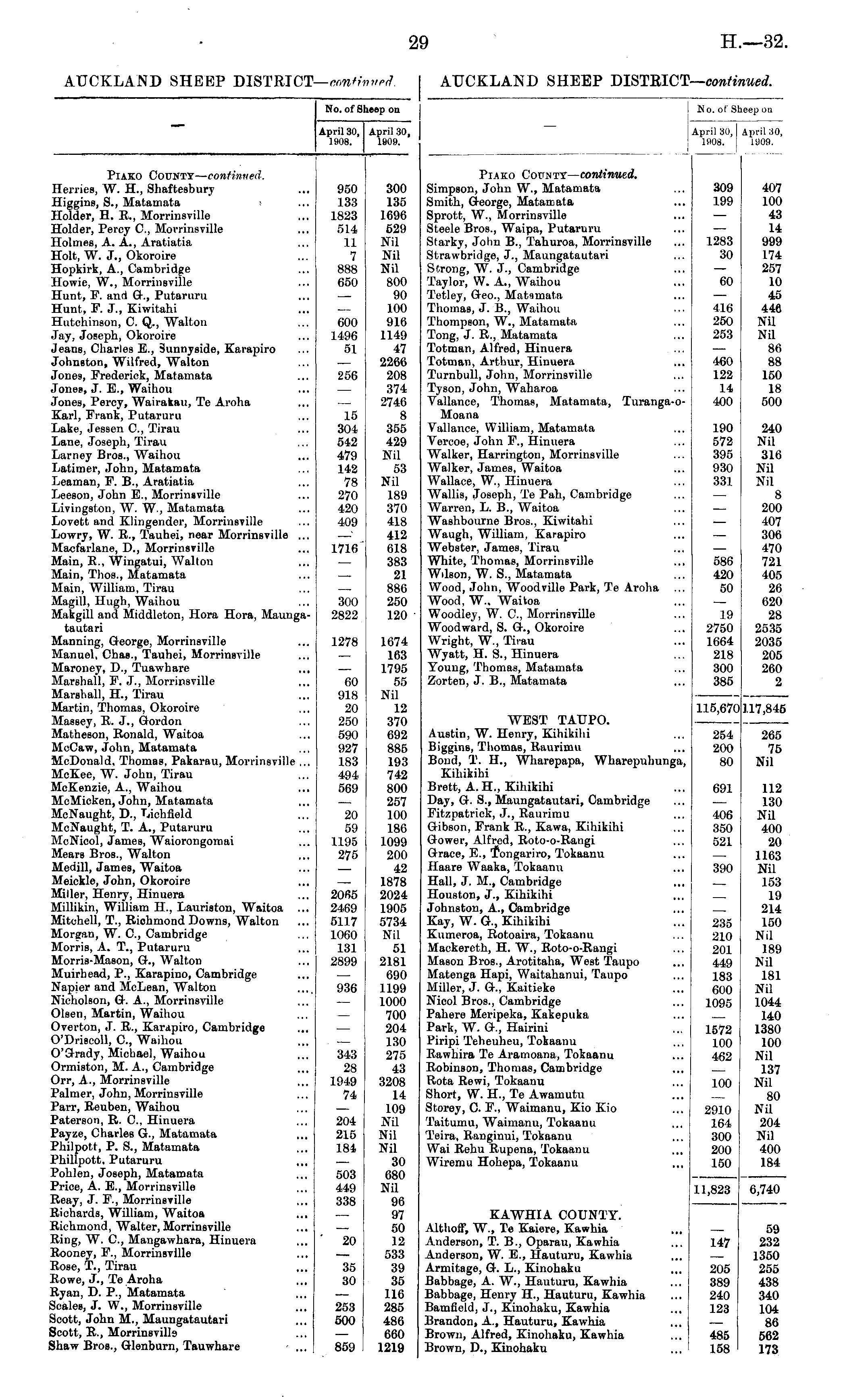 No. of Sheep on April 30, April 30, 1908. 1909. PlAKO CouNTX — continued. Herries, W. H., Shaftesbury Higgins, S., Matamata Holder, H. R., Morrinsville Holder, Percy C, Morrinsville Holmes, A. A., Aratiatia Holt, W. J., Okoroire Hopkirk, A., Cambridge Howie, W., Morrinsville Hunt, F. and G., Putaruru Hunt, F. J., Kiwitahi Hutchinson, C. Q., Walton Jay, Joseph, Okoroire Jeans, Charles E., 3unnyside, Karapiro Johnston, Wilfred, Walton Jones, Frederick, Matamata Jones, J. E., Waihou Jones, Percy, Wairakau, Te Aroha Karl, Frank, Putaruru Lake, Jeseen C, Tirau Lane, Joseph, Tirau Larney Bros., Waihou Latimer, John, Matamata Leaman, F. B., Aratiatia Leeson, John E., Morrinsville Livingston, W. W., Matamata Lovett and Klingender, MorrinsTille Lowry, W. R., Tauhei, near Morrinsville ... Macfarlane, D., Morrinsville Main, R., Wingatui, Walton Main, Thos., Matamata Main, William, Tirau Magill, Hugh, Waihou Makgill and Middleton, Hora Hora, Maungatautari Manning, George, Morrinsville Manuel, Chas., Tauhei, Morrinsville Maroney, D., Tuawhare Marshall, F. J., Morrinsville Marshall, H., Tirau Martin, Thomas, Okoroire Massey, R. J., Gordon Matheson, Ronald, Waitoa McCaw, John, Matamata McDonald, Thomas, Pakarau, Morrinsville ... McKee, W. John, Tirau McKenzie, A., Waihou McMicken, John, Matamata McNaught, D., Tjichfield McNaught, T. A., Putaruru McNieol, James, Waiorongomai Mears Bros., Walton Medill, James, Waitoa Meickle, John, Okoroire Miller, Henry, Hinuera Millikin, William H., Lauriston, Waitoa Mitchell, T., Richmond Downs, Walton Morgan, W. C, Cambridge Morris, A. T., Putaruru Morris-Mason, G., Walton Muirhead, P., Karapino, Cambridge Napier and McLean, Walton ... Nicholson, G. A., Morrinsville Oleen, Martin, Waihou Overton, J. R., Karapiro, Cambridge O'Driscoll, C, Waihou O'3-rady, Michael, Waihou Ormiston, M. A., Cambridge Orr, A., Morrinsville Palmer, John, Morrinsville Parr, Reuben, Waihou Paterson, R. C, Hinuera Payze, Charles G., Matamata Philpott, P. S., Matamata Phillpott, Putaruru ,,, Pohlen, Joseph, Matamata Price, A. E., Morrinsville Reay, J. F., Morrinsville Richards, William, Waitoa ... Richmond, Walter, Morrinsville Ring, W. C, Mangawhara, Hinuera Rooney, F., Morrinsville Rose, T., Tirau Rowe, J., Te Aroha Ryan, D. P., Matamata Scales, J. W., Morrinsville Scott, John M., Maungatautari Scott, R., Morrinsvills Shaw Bros., Glenburn, Tauwhare 950 133 1823 514 11 7 888 650 600 1496 51 256 15 304 542 479 142 78 270 420 409 1716^ 300 2822 1278 60 918 20 250 590 927 183 494 569 300 135 1696 529 Nil Nil Nil 800 90 100 916 1149 47 2266 208 374 2746 8 355 429 Nil 53 Nil 189 370 418 412 618 383 21 886 250 120 1674 163 1795 55 Nil 12 370 692 885 193 742 800 257 100 186 1099 200 42 1878 2024 1905 5734 Nil 51 2181 690 1199 1000 700 204 130 275 43 3208 14 109 Nil Nil Nil 30 680 Nil 96 97 50 12 533 39 35 116 285 486 660 1219 20 59 1195 275 20R5 2469 5117 1060 131 2899 936 343 28 1949 74 204 215 181 503 449 338 ' 20 35 30 253 500 859