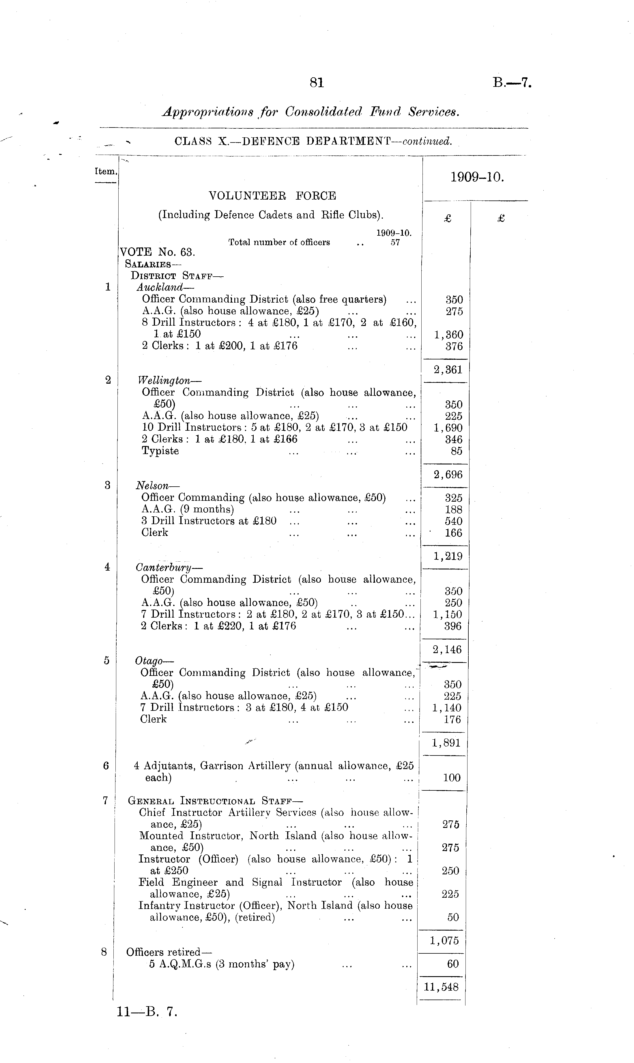 :tem. 1909-10. VOLUNTEER FORCE (Including Defence Cadets and Rifle Clubs). € 1909-10. Total number of officers .. 57 VOTE No. 63. Salaries— Disteict Staff— Auckland — Officer Commanding District (also free quarters) A.A.G. (also house allowance, £25) 8 Drill Instructors : 4 at £180, 1 at £170, 2 at £160, 1 at £150 2 Clerks : 1 at £200, 1 at £176 350 275 1,360 376 Wellington — Officer Commanding District (also house allowance, £50) A.A.G. (also house allowance, £25) 10 Drill Instructors: 5 at £180, 2 at £170, 3 at £150 2 Clerks : 1 at £180. 1 at £166 Typiste 2,361 350 225 1,690 346 85 Nelson — Officer Commanding (also house allowance, £50) A.A.G. (9 months) 3 Drill Instructors at £180 ... Clerk 2,696 325 188 540 ■ 166 Canterbury — Officer Commanding District (also house allowance, £50) A.A.G. (also house allowance, £50) .. ... ! 7 Drill Instructors: 2 at £180, 2 at £170, 3 at £150... 2 Clerks: 1 at £220, 1 at £176 1,219 350 250 1,150 396 Otago — Officer Commanding District (also house allowance/ £50) A.A.G. (also house allowance, £25) 7 Drill Instructors : 3 at £180, 4 at £150 Clerk 2,146 350 225 1,140 176 1,891 4 Adjutants, Garrison Artillery (annual allowance, £25 I each) . ... ... ... 100 General Insteuctional Staff— Chief Instructor Artillery Services (also house allowance, £25) ... ... ... Mounted Instructor, North Island (also house allowance, £50) ... ... ... Instructor (Officer) (also house allowance, £50) : 1 at £250 Field Engineer and Signal Instructor (also house allowance, £25) ... ... ... Infantry Instructor (Officer), North Island (also house allowance, £50), (retired) 275 275 250 225 50 Officers retired — 5 A.Q.M.G.s (3 months' pay) 1,075 60 11,548
