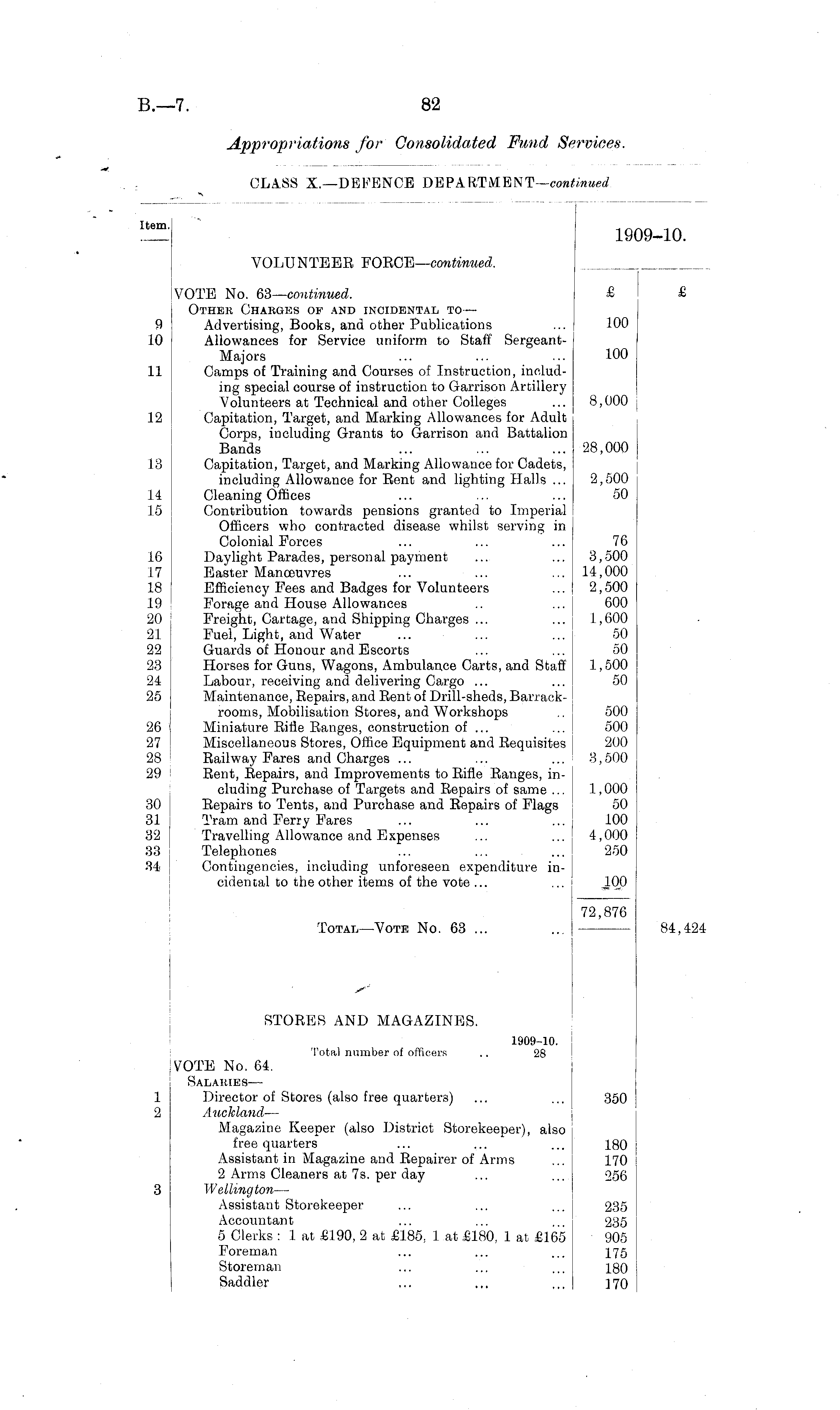 Item. VOLUNTEER FORCE— continued. 19 19-10. VOTE No. 63— continued. Other Charges of and incidental to — Advertising, Books, and other Publications Allowances for Service uniform to Staff SergeantMajors Camps of Training and Courses of Instruction, including special course of instruction to Garrison Artillery Volunteers at Technical and other Colleges Capitation, Target, and Marking Allowances for Adult Corps, including Grants to Garrison and Battalion Bands Capitation, Target, and Marking Allowance for Cadets, including Allowance for Rent and lighting Halls ... Cleaning Offices Contribution towards pensions granted to Imperial Officers who contracted disease whilst serving in Colonial Forces Daylight Parades, personal payment Easter Manoeuvres Efficiency Fees and Badges for Volunteers Forage and House Allowances Freight, Cartage, and Shipping Charges ... Fuel, Light, and Water Guards of Honour and Escorts Horses for Guns, Wagons, Ambulance Carts, and Staff Labour, receiving and delivering Cargo ... Maintenance, Repairs, and Rent of Drill-sheds, Barrackrooms, Mobilisation Stores, and Workshops Miniature Rifle Ranges, construction of ... Miscellaneous Stores, Office Equipment and Requisites Railway Fares and Charges ... Rent, Repairs, and Improvements to Rifle Ranges, including Purchase of Targets and Repairs of same ... Repairs to Tents, and Purchase and Repairs of Flags Tram and Ferry Fares Travelling Allowance and Expenses Telephones Contingencies, including unforeseen expenditure incidental to the other items of the vote ... £ £ 9 10 100 11 100 12 8,000 13 28,000 14 15 2,500 50 16 17 18 19 20 21 22 23 24 25 76 3,500 14,000 2,500 600 1,600 50 50 1,500 50 26 27 28 29 500 500 200 3,500 30 31 32 33 34 1,000 50 100 4,000 250 100 Total —Vote No. 63 ... 72,876 84,424 * STORMS AND MAGAZINES. 1909-10. Total number of officei-R .. 28 1 2 VOTE No, 64. Salaries — Director of Stores (also free quarters) Auckland — Magazine Keeper (also District Storekeeper), also free quarters Assistant in Magazine and Repairer of Arms 2 Arms Cleaners at 7s. per day Wellington — Assistant Storekeeper Accountant 5 Clerks : 1 at £190, 2 at £185, 1 at £180, 1 at £165 Foreman Storeman Saddler 350 180 170 256 235 235 905 175 180 170