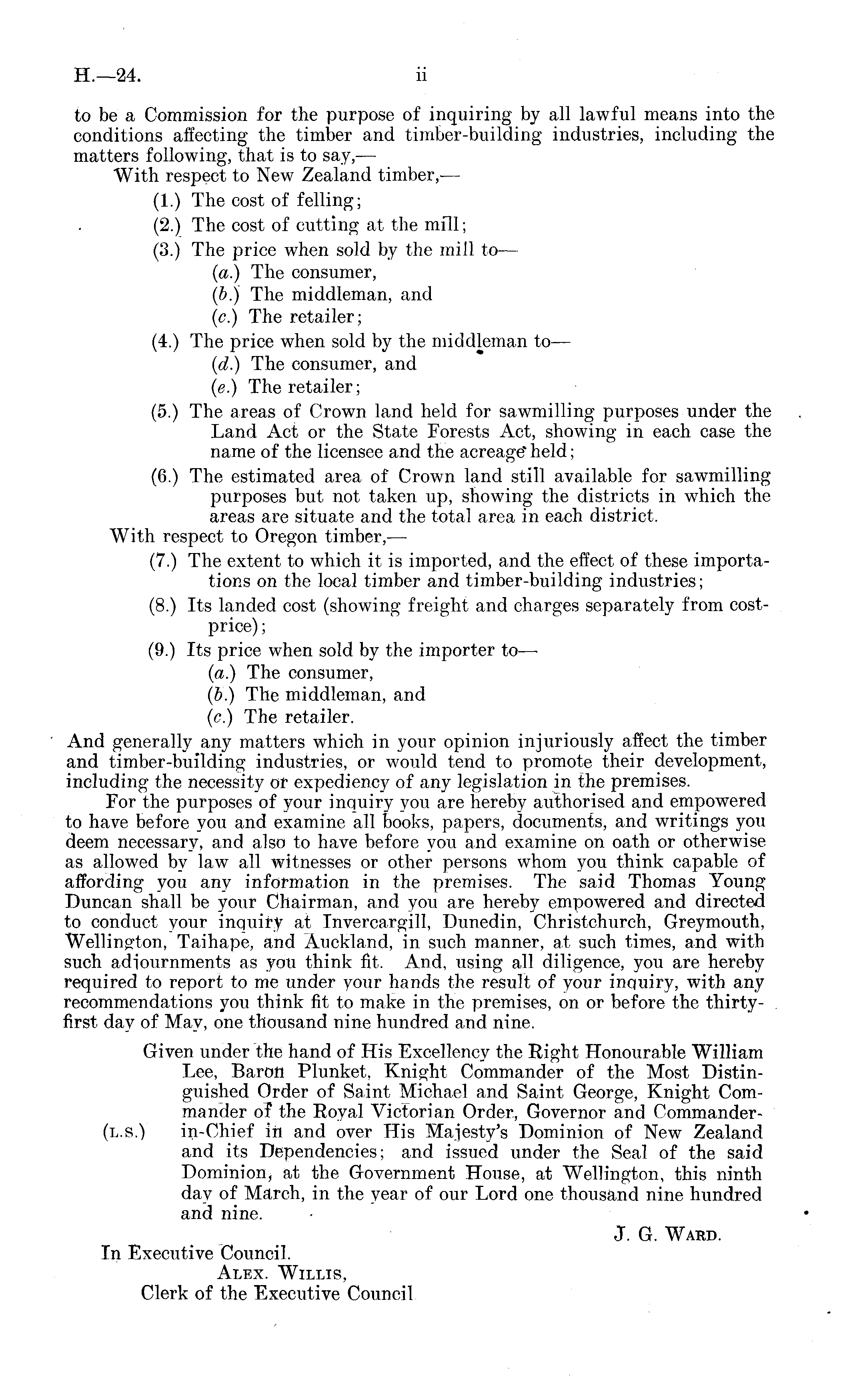 to be a Commission for the purpose of inquiring by all lawful means into the conditions affecting the timber and timber-building industries, including the matters following, that is to say,— With respect to New Zealand timber, — (1.) The cost of felling; (2.) The cost of cutting at the mill; (3.) The price when sold by the mill to — (a.) The consumer, (b.) The middleman, and (c.) The retailer; (4.) The price when sold by the middleman to — (d.) The consumer, and (c.) The retailer; (5.) The areas of Crown land held for sawmilling purposes under the Land Act or the State Forests Act, showing in each case the name of the licensee and the acreage" held; (6.) The estimated area of Crown land still available for sawmilling purposes but not taken up, showing the districts in which the areas are situate and the total area in each district. With respect to Oregon timber, — (7.) The extent to which it is imported, and the effect of these importations on the local timber and timber-building industries; (8.) Its landed cost (showing freight and charges separately from costprice) ; (9.) Its price when sold by the importer to— (a.) The consumer, (b.) The middleman, and (c.) The retailer. And generally any matters which in your opinion injuriously affect the timber and timber-building industries, or would tend to promote their development, including the necessity or expediency of any legislation in the premises. For the purposes of your inquiry you are hereby aivthorised and empowered to have before you and examine all books, papers, documents, and writings you deem necessary, and also to have before you and examine on oath or otherwise as allowed by law all witnesses or other persons whom you think capable of affording you any information in the premises. The said Thomas Young Duncan shall be your Chairman, and you are hereby empowered and directed to conduct your inquiry at Invercargill, Dunedin, Christchurch, Greymouth, Wellington, Taihape, and Auckland, in such manner, at such times, and with such adiournments as you think fit. And, using all diligence, you are hereby required to report to me under your hands the result of your inquiry, with any recommendations you think fit to make in the premises, on or before the thirtyfirst day of May, one thousand nine hundred and nine. Given under the hand of His Excellency the Right Honourable William Lee, Baron Plunket, Knight Commander of the Most Distinguished Order of Saint Michael and Saint George, Knight Commander of the Royal Victorian Order, Governor and Commander - (1.5.) in-Chief in and over His Majesty's Dominion of New Zealand and its Dependencies; and issued under the Seal of the said Dominion, at the Government House, at Wellington, this ninth day of March, in the year of our Lord one thousand nine hundred and nine. J. G. Waed. In Executive Council. Alex. Willis, Clerk of the Executive Council