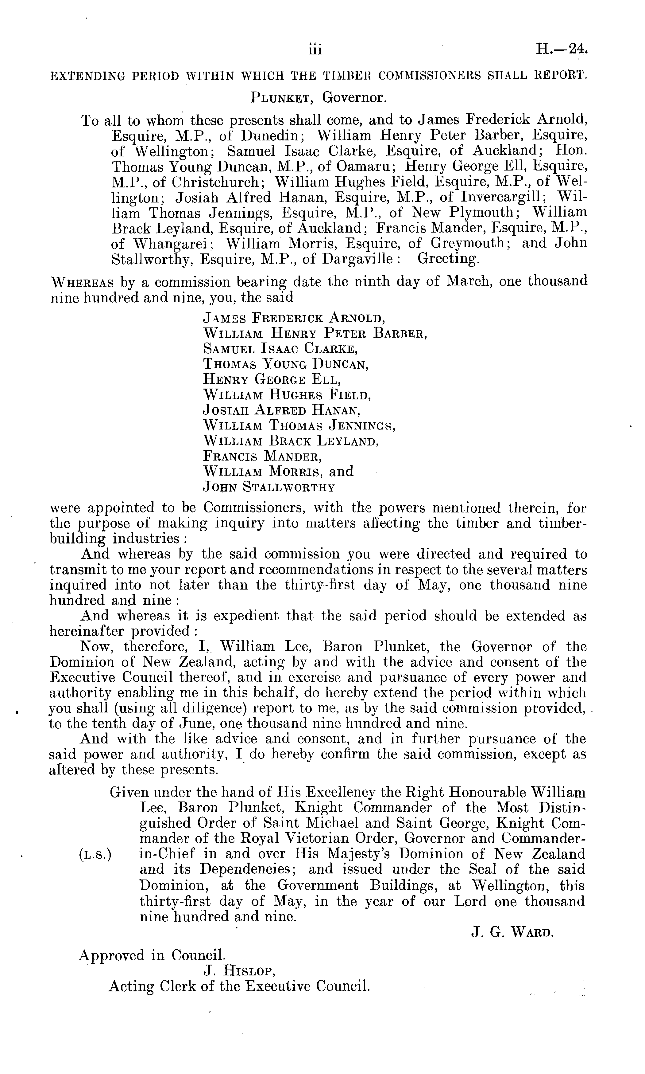 EXTENDING PERIOD WITHIN WHICH THE TIMBER COMMISSIONERS SHALL REPORT. Plunket, Governor. To all to whom these presents shall come, and to James Frederick Arnold, Esquire, M.P., of Dunedin; William Henry Peter Barber, Esquire, of Wellington; Samuel Isaac Clarke, Esquire, of Auckland; Hon. Thomas Young Duncan, M.P., of Oamaru; Henry George Ell, Esquire, M.P., of Christchurch; William Hughes Field, Esquire, M.P., of Wellington; Josiah Alfred Hanan, Esquire, M.P., of Invercargill; William Thomas Jennings, Esquire, M.P., of New Plymouth; William Brack Leyiand, Esquire, of Auckland; Francis Mander, Esquire, M.P., of Whangarei; William Morris, Esquire, of Greymouth; and John Stallworthy, Esquire, M.P., of Dargaville : Greeting. Whereas by a commission bearing date the ninth day of March, one thousand nine hundred and nine, you, the said James Frederick Arnold, William Henry Peter Barber, Samuel Isaac Clarke, Thomas Young Duncan, Henry George Ell, William Hughes Field, Josiah Alfred Hanan, William Thomas Jennings, William Brack Leyland, Francis Mander, William Morris, and John Stallworthy were appointed to be Commissioners, with the powers mentioned therein, for the purpose of making inquiry into matters affecting the timber and timberbuilding industries : And whereas by the said commission you were directed and required to transmit to me your report and recommendations in respect to the several matters inquired into not later than the thirty-first day of May, one thousand nine hundred and nine : And whereas it is expedient that the said period should be extended as hereinafter provided : Now, therefore, I, William Lee, Baron Plunket, the Governor of the Dominion of New Zealand, acting by and with the advice and consent of the Executive Council thereof, and in exercise and pursuance of every power and authority enabling me in this behalf, do hereby extend the period within which you shall (using all diligence) report to me, as by the said commission provided, to the tenth day of June, one thousand nine hundred and nine. And with the like advice and consent, and in further pursuance of the said power and authority, I do hereby confirm the said commission, except as altered by these presents. Given under the hand of His Excellency the Right Honourable William Lee, Baron Plunket, Knight Commander of the Most Distinguished Order of Saint Michael and Saint George, Knight Commander of the Royal Victorian Order, Governor and Commander(l.s.) in-Chief in and over His Majesty's Dominion of New Zealand and its Dependencies; and issued under the Seal of the said Dominion, at the Government Buildings, at Wellington, this thirty-first day of May, in the year of our Lord one thousand nine hundred and nine. J. G. Ward. Approved in Council. J. HISLOP, Acting Clerk of the Executive Council.