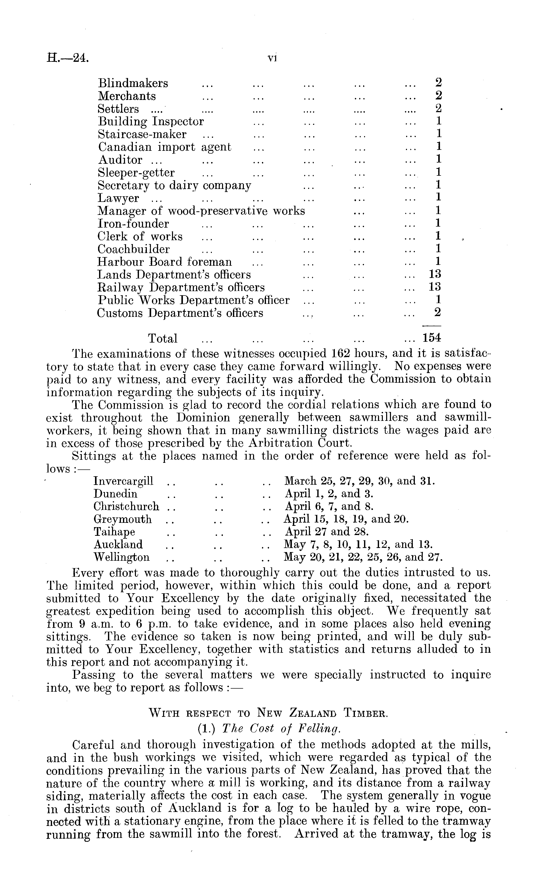 Blindmakers ... ... ... ... ... 2 Merchants ... ... ... ... ... 2 Settlers .... .... .... .... .... .... 2 Building Inspector ... ... ... ... 1 Staircase-maker ... ... ... ... ... 1 Canadian import agent ... ... ... ... 1 Auditor ... ... ... ... ... ... 1 Sleeper-getter ... ... ... ... ... 1 Secretary to dairy company ... ... ... 1 Lawyer ... ... ... ... ... • • • 1 Manager of wood-preservative works ... ... 1 Iron-founder ... ... ... ... ... 1 Clerk of works ... ... ... ... ... 1 Coachbuilder ... ... ... ... ... 1 Harbour Board foreman ... ... ... ... 1 Lands Department's officers ... ... ... 13 Railway Department's officers ... ... ... 13 Public Works Department's officer ... ... ... 1 Customs Department's officers ... ... ... 2 Total ... ... ... ... ... 154 The examinations of these witnesses occupied 162 hours, and it is satisfactory to state that in every case they came forward willingly. No expenses were paid to any witness, and every facility was afforded the Commission to obtain information regarding the subjects of its inquiry. The Commission is glad to record the cordial relations which are found to exist throughout the Dominion generally between sawmillers and sawmillworkers, it being shown that in many sawmilling districts the wages paid are in excess of those prescribed by the Arbitration Court. Sittings at the places named in the order of reference were held as follows :— Invercargill . . .. .. March 25, 27, 29, 30, and 31. Dunedin . . .. .. April 1, 2, and 3. Christchurch . . .. . . April 6, 7, and 8. Greymouth .. .. . . April 15, 18, 19, and 20. Taihape .. .. . . April 27 and 28. Auckland .. .. . . May 7, 8, 10, 11, 12, and 13. Wellington .. .. .. May 20, 21, 22, 25, 26, and 27. Every effort was made to thoroughly carry out the duties intrusted to us. The limited period, however, within which this could be done, and a report submitted to Your Excellency by the date originally fixed, necessitated the greatest expedition being used to accomplish this object. We frequently sat from 9 a.m. to 6 p.m. to take evidence, and in some places also held evening sittings. The evidence so taken is now being printed, and will be duly submitted to Your Excellency, together with statistics and returns alluded to in this report and not accompanying it. Passing to the several matters we were specially instructed to inquire into, we beg to report as follows : — With respect to New Zealand Timber. (1.) The Cost of Felling. Careful and thorough investigation of the methods adopted at the mills, and in the bush workings we visited, which were regarded as typical of the conditions prevailing in the various parts of New Zealand, has proved that the nature of the country where a mill is working, and its distance from a railway siding, materially affects the cost in each case. The system generally in vogue in districts south of Auckland is for a log to be hauled by a wire rope, connected with a stationary engine, from the place where it is felled to the tramway running from the sawmill into the forest. Arrived at the tramway, the log is