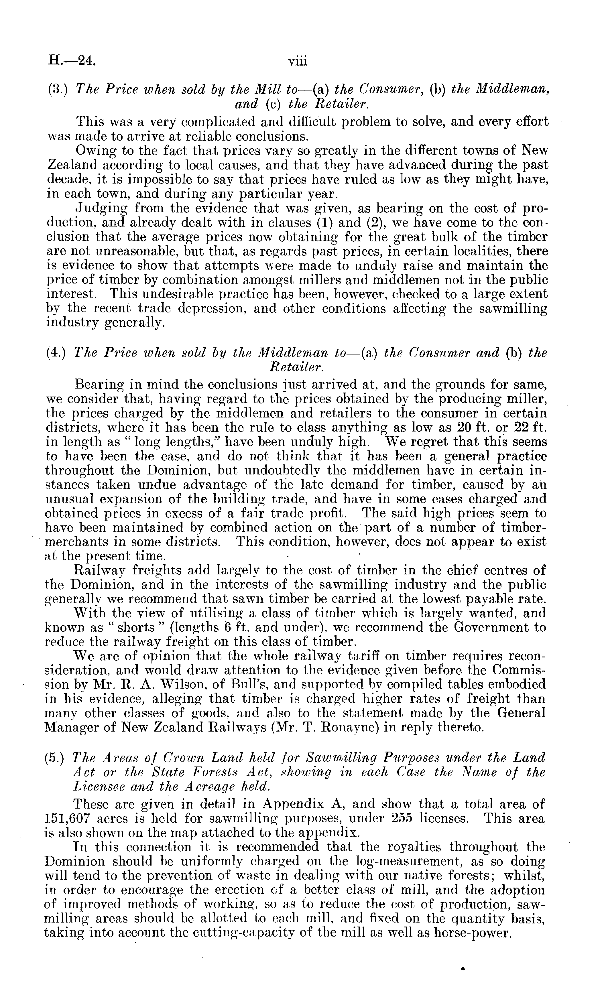 (3.) The Price when sold by the Mill to —(a) the Consumer, (b) the Middleman, and (c) the Retailer. This was a very complicated and difficult problem to solve, and every effort was made to arrive at reliable conclusions. Owing to the fact that prices vary so greatly in the different towns of New Zealand according to local causes, and that they have advanced during the past decade, it is impossible to say that prices have ruled as low as they might have, in each town, and during any particular year. Judging from the evidence that was given, as bearing on the cost of production, and already dealt with in clauses (1) and (2), we have come to the conclusion that the average prices now obtaining for the great bulk of the timber are not unreasonable, but that, as regards past prices, in certain localities, there is evidence to show that attempts were made to unduly raise and maintain the price of timber by combination amongst millers and middlemen not in the public interest. This undesirable practice has been, however, checked to a large extent by the recent trade depression, and other conditions affecting the sawmilling industry generally. (4.) The Price when sold by the Middleman to —(a) the Consumer and (b) the Retailer. Bearing in mind the conclusions just arrived at, and the grounds for same, we consider that, having regard to the prices obtained by the producing miller, the prices charged by the middlemen and retailers to the consumer in certain districts, where it has been the rule to class anything as low as 20 ft. or 22 ft. in length as " long lengths," have been unduly high. We regret that this seems to have been the case, and do not think that it has been a general practice throughout the Dominion, but undoubtedly the middlemen have in certain instances taken undue advantage of the late demand for timber, caused by an unusual expansion of the building trade, and have in some cases charged and obtained prices in excess of a fair trade profit. The said high prices seem to have been maintained by combined action on the part of a number of timbermerchants in some districts. This condition, however, does not appear to exist at the present time. Railway freights add largely to the cost of timber in the chief centres of the Dominion, and in the interests of the saw T milling industry and the public generally we recommend that sawn timber be carried at the lowest payable rate. With the view of utilising a class of timber which is largely wanted, and known as " shorts " (lengths 6 ft. and under), we recommend the Government to reduce the railway freight on this class of timber. We are of opinion that the whole railway tariff on timber requires reconsideration, and would draw attention to the evidence given before the Commission by Mr. R. A. Wilson, of Bull's, and supported by compiled tables embodied in his evidence, alleging that timber is charged higher rates of freight than many other classes of goods, and also to the statement made by the General Manager of New Zealand Railways (Mr. T. Ronayne) in reply thereto. (5.) The Areas of Crown Land held for Sawmilling Purposes under the Land Act or the State Forests Act, showing in each Case the Name of the Licensee and the Acreage held. These are given in detail in Appendix A, and show that a total area of 151,607 acres is held for sawmilling purposes, under 255 licenses. This area is also shown on the map attached to the appendix. In this connection it is recommended that the royalties throughout the Dominion should be uniformly charged on the log-measurement, as so doing will tend to the prevention of waste in dealing with our native forests; whilst, in order to encourage the erection of a better class of mill, and the adoption of improved methods of working, so as to reduce the cost of production, sawmilling areas should be allotted to each mill, and fixed on the quantity basis, taking into account the cutting-capacity of the mill as well as horse-power.