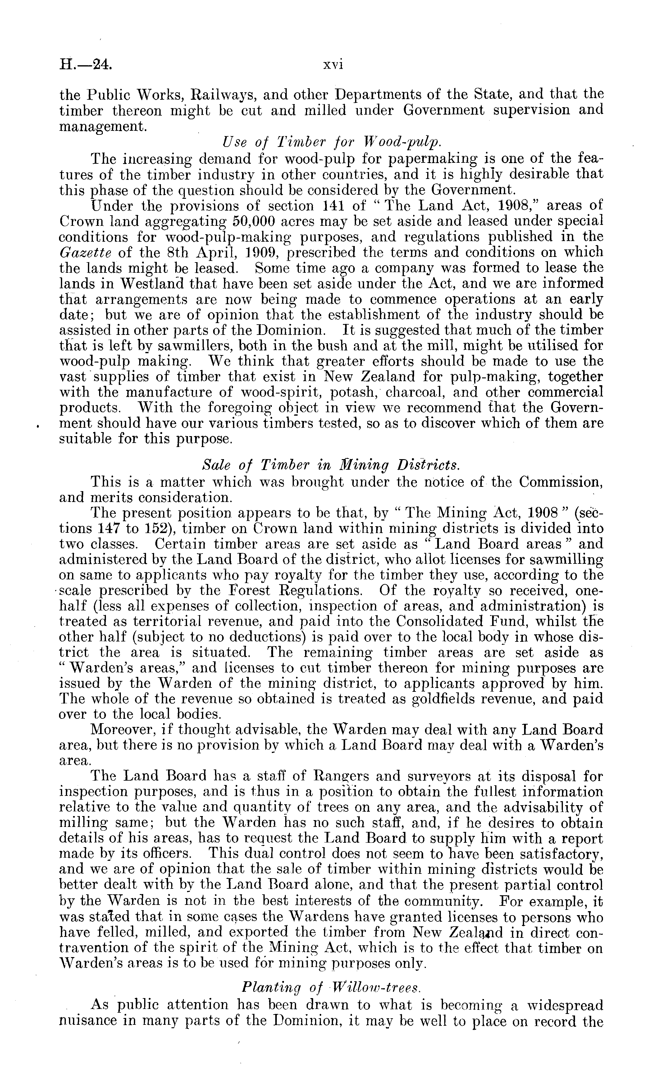 the Public Works, Railways, and other Departments of the State, and that the timber thereon might be cut and milled under Government supervision and management. Use of Timber for Wood-pulp. The increasing demand for wood-pulp for papermaking is one of the features of the timber industry in other countries, and it is highly desirable that this phase of the question should be considered by the Government. Under the provisions of section 141 of " The Land Act, 1908," areas of Crown land aggregating 50,000 acres may be set aside and leased under special conditions for wood-pulp-making purposes, and regulations published in the Gazette of the Bth April, 1909, prescribed the terms and conditions on which the lands might be leased. Some time ago a company was formed to lease the lands in Westland that have been set aside under the Act, and we are informed that arrangements are now being made to commence operations at an early date; but we are of opinion that the establishment of the industry should be assisted in other parts of the Dominion. It is suggested that much of the timber that is left by sawmillers, both in the bush and at the mill, might be utilised for wood-pulp making. We think that greater efforts should be made to use the vast supplies of timber that exist in New Zealand for pulp-making, together with the manufacture of wood-spirit, potash, charcoal, and other commercial products. With the foregoing object in view we recommend that the Government should have our various timbers tested, so as to discover which of them are suitable for this purpose. Sale of Timber in Mining Districts. This is a matter which was brought under the notice of the Commission, and merits consideration. The present position appears to be that, by " The Mining Act, 1908 " (sections 147 to 152), timber on Crown land within mining districts is divided into two classes. Certain timber areas are set aside as " Land Board areas " and administered by the Land Board of the district, who allot licenses for sawmilling on same to applicants who pay royalty for the timber they use, according to the scale prescribed by the Forest Regulations. Of the royalty so received, onehalf (less all expenses of collection, inspection of areas, and administration) is treated as territorial revenue, and paid into the Consolidated Fund, whilst the other half (subject to no deductions) is paid over to the local body in whose district the area is situated. The remaining timber areas are set aside as " Warden's areas," and licenses to cut timber thereon for mining purposes are issued by the Warden of the mining district, to applicants approved by him. The whole of the revenue so obtained is treated as goldfields revenue, and paid over to the local bodies. Moreover, if thought advisable, the Warden may deal with any Land Board area, but there is no provision by which a Land Board may deal with a Warden's area. The Land Board has a staff of Rangers and surveyors at its disposal for inspection purposes, and is thus in a position to obtain the fullest information relative to the value and quantity of trees on any area, and the advisability of milling same; but the Warden has no such staff, and, if he desires to obtain details of his areas, has to request the Land Board to supply him with a report made by its officers. This dual control does not seem to have been satisfactory, and we axe of opinion that the sale of timber within mining districts would be better dealt with by the Land Board alone, and that the present partial control by the Warden is not in the best interests of the community. For example, it was staled that in some cases the Wardens have granted licenses to persons who have felled, milled, and exported the timber from New Zealand in direct contravention of the spirit of the Mining Act, which is to the effect that timber on AVarden's areas is to be used for mining purposes only. Planting of Willow-trees. As public attention has been drawn to what is becoming a widespread nuisance in many parts of the Dominion, it may be well to place on record the
