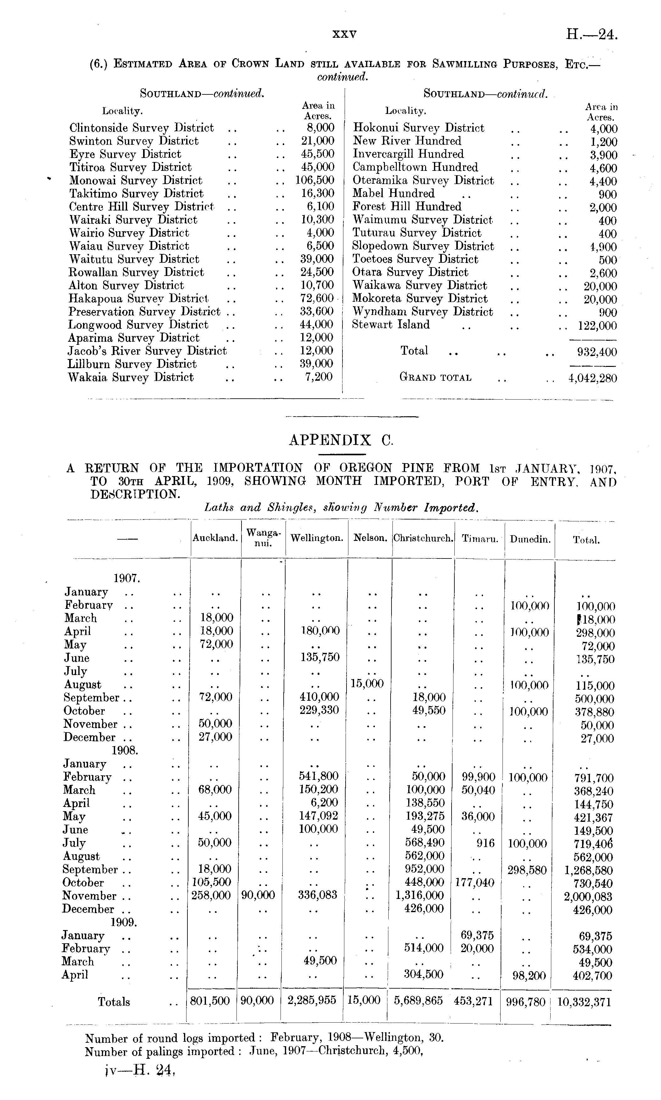 Number of round logs imported : February, 1908—Wellington, 30. Number of palings imported : June, 1907 —Christchurch, 4,500,