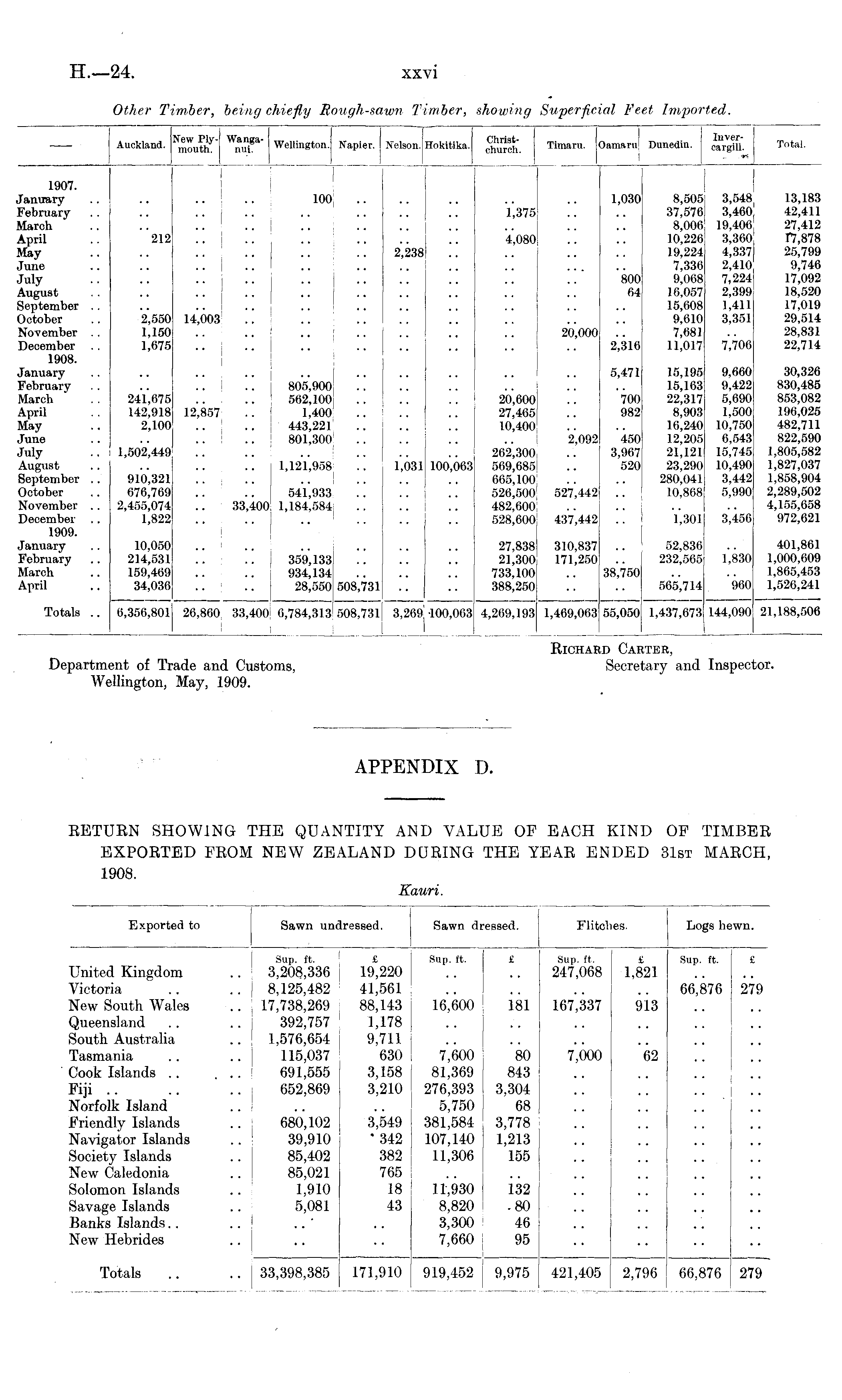 RETURN SHOWING THE QUANTITY AND VALUE OF EACH KIND OF TIMBER EXPORTED FROM NEW ZEALAND DURING THE YEAR ENDED 31st MARCH, 1908. Kauri.