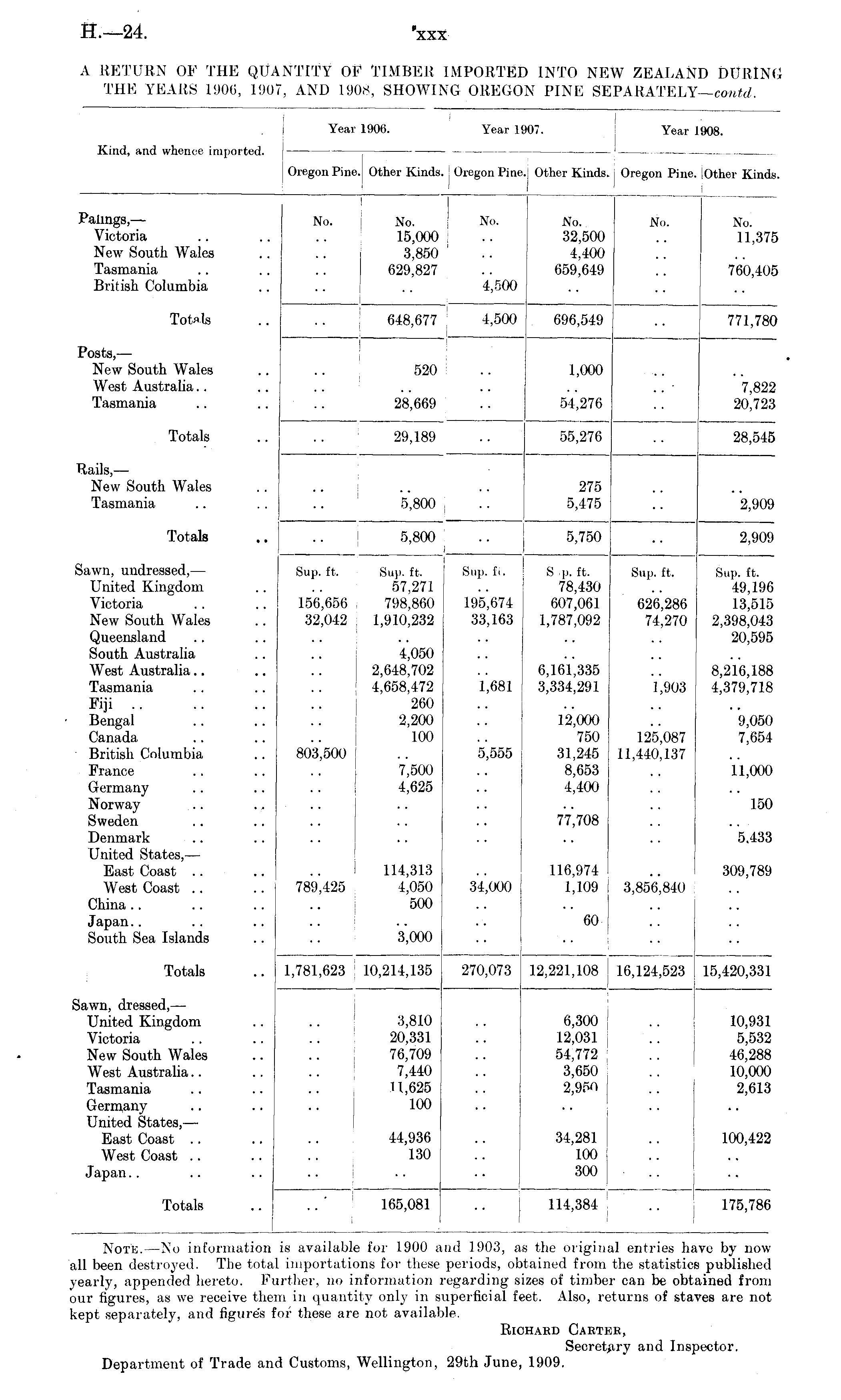 Note. —No information is available for 1900 and 1903, as the original entries have by nowall been destroyed. The total importations for these periods, obtained from the statistics published yearly, appended hereto. Further, no information regarding sizes of timber can be obtained from our figures, as we receive them in quantity only in superficial feet. Also, returns of staves are not kept separately, and figures for these are not available. Eichaed Carter, Secretary and Inspector. Department of Trade and Customs, Wellington, 29th June, 1909.