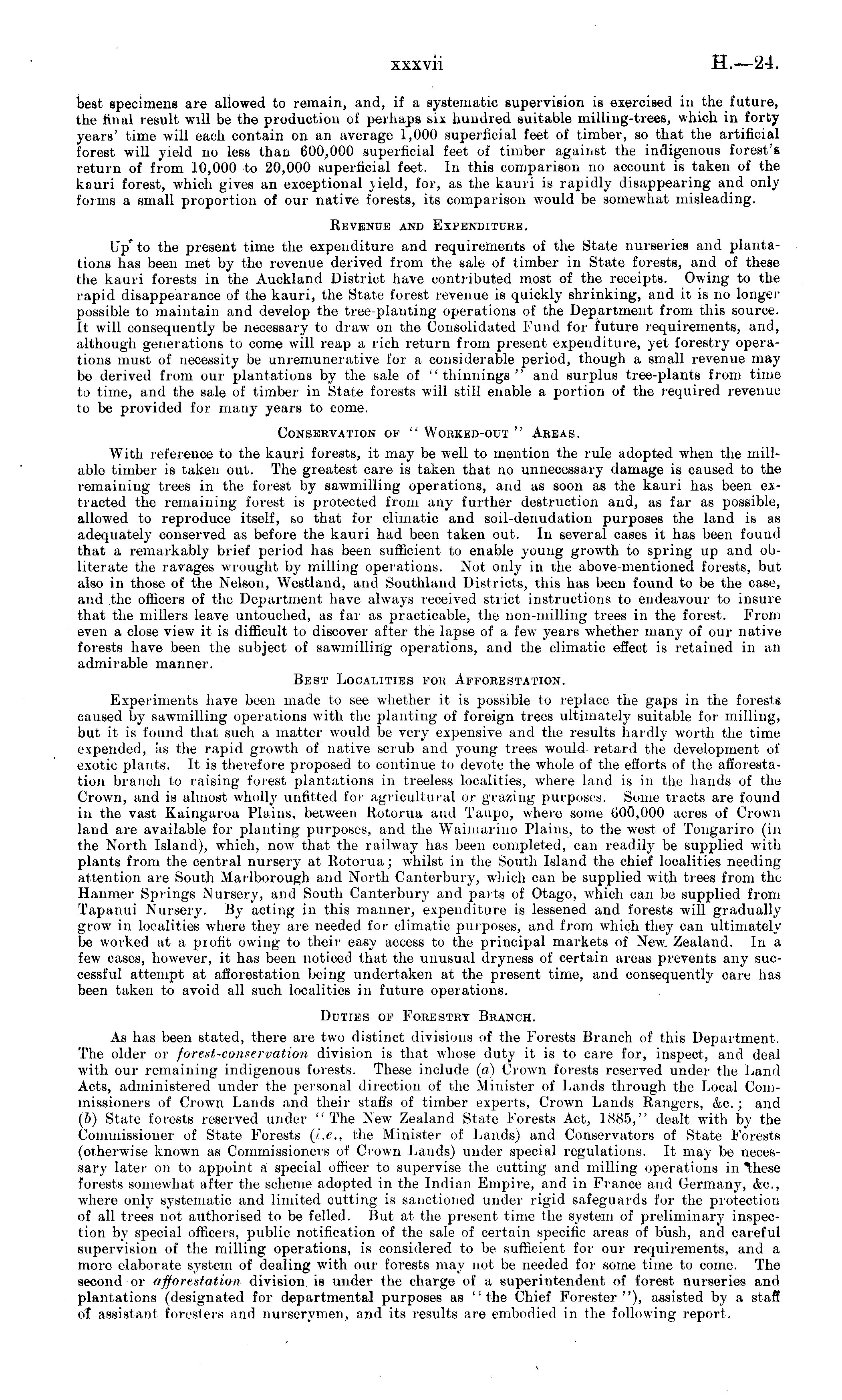 best specimens are allowed to remain, and, if a systematic supervision is exercised in the future, the final result will be the production of perhaps six hundred suitable milling-trees, which in forty years' time will each contain on an average 1,000 superficial feet of timber, so that the artificial forest will yield no less than 600,000 superficial feet of timber against the indigenous forest's return of from 10,000 to 20,000 superficial feet. In this comparison no account is taken of the kauri forest, which gives an exceptional }ield, for, as the kauri is rapidly disappearing and only forms a small proportion of our native forests, its comparison would be somewhat misleading. Revenue and Expenditure. Up to the present time the expenditure and requirements of the State nurseries and plantations has been met by the revenue derived from the sale of timber in State forests, and of these the kauri forests in the Auckland District have contributed most of the receipts. Owing to the rapid disappearance of the kauri, the State forest revenue is quickly shrinking, and it is no longer possible to maintain and develop the tree-planting operations of the Department from this source. it will consequently be necessary to draw on the Consolidated Fund for future requirements, and, although generations to come will reap a rich return from present expenditure, yet forestry operations must of necessity be unremunerative for a considerable period, though a small revenue maybe derived from our plantations by the sale of "thinnings " and surplus tree-plants from time to time, and the sale of timber in State forests will still enable a portion of the required revenue to be provided for many years to come. Conservation of '• Worked-out " Areas. With reference to the kauri forests, it may be well to mention the rule adopted when the millable timber is taken out. The greatest care is taken that no unnecessary damage is caused to the remaining trees in the forest by sawmilling operations, and as soon as the kauri has been extracted the remaining forest is protected from any further destruction and, as far as possible, allowed to reproduce itself, so that for climatic and soil-denudation purposes the land is as adequately conserved as before the kauri had been taken out. In several cases it has been found that a remarkably brief period lias been sufficient to enable young growth to spring up and obliterate the ravages wrought by milling operations. Not only in the above-mentioned forests, but also in those of the Nelson, Westland, and Southland Districts, this has been found to be the case, and the officers of the Department have always received strict instructions to endeavour to insure that the millers leave untouched, as far as practicable, the non-milling trees in the forest. From even a close view it is difficult to discover after the lapse of a few years whether many of our native forests have been the subject of sawmilling operations, and the climatic effect is retained in an admirable manner. Best Localities for Afforestation. Experiments have been made to see whether it is possible to replace the gaps in the forests caused by sawmilling operations with the planting of foreign trees ultimately suitable for milling, but it is found that such a matter would be very expensive and the results hardly worth the time expended, as the rapid growth of native scrub and young trees would retard the development of exotic plants. It is therefore proposed to continue to devote the whole of the efforts of the afforestation branch to raising forest plantations in treeless localities, where land is in the hands of the Crown, and is almost wholly unfitted for agricultural or grazing purposes. Some tracts are found in the vast Kaingaroa Plains, between Kotorua and Taupo, where some 000,000 acres of Crown land are available for planting purposes, and the Waimarino Plains, to the west of Tongariro (in the North Island), which, now that the railway has been completed, can readily be supplied with plants from the central nursery at Rotorua; whilst in the South Island the chief localities needing attention are South Marlborough and North Canterbury, which can be supplied with trees from the Hanmer Springs Nursery, and South Canterbury and parts of Otago, which can be supplied from Tapauui Nursery. By acting in this manner, expenditure is lessened and forests will gradually grow in localities where they are needed for climatic pur poses, and from which they can ultimately be worked at a profit owing to their easy access to the principal markets of New Zealand. In a few cases, however, it has been noticed that the unusual dryness of certain areas prevents any successful attempt at afforestation being undertaken at the present time, and consequently care has been taken to avoid all such localities in future operations. Duties of Forestry Branch. As has been stated, there are two distinct divisions of the Forests Branch of this Department. The older or forest-conservation division is that whose duty it is to care for, inspect, and dual with our remaining indigenous forests. These include (a) Crown forests reserved under the Land Acts, administered under the personal direction of the Minister of Lands through the Local Commissioners of Crown Lands and their staffs of timber experts, Crown Lands Rangers, &o. ; am) (6) State forests reserved under " The New Zealand State Forests Act, 1885," dealt with by the Commissioner of State Forests (i.e., the Minister of LandsJ and Conservators of State Forests (otherwise known as Commissioners of Crown Lands) under special regulations. It may be necessary later on to appoint a special officer to supervise the cutting and milling operations in T;hese forests somewhat after the scheme adopted in the Indian Empire, and in France and Germany, &c, where only systematic and limited cutting is sanctioned under rigid safeguards for the protection of all trees not authorised to be felled. But at the 
