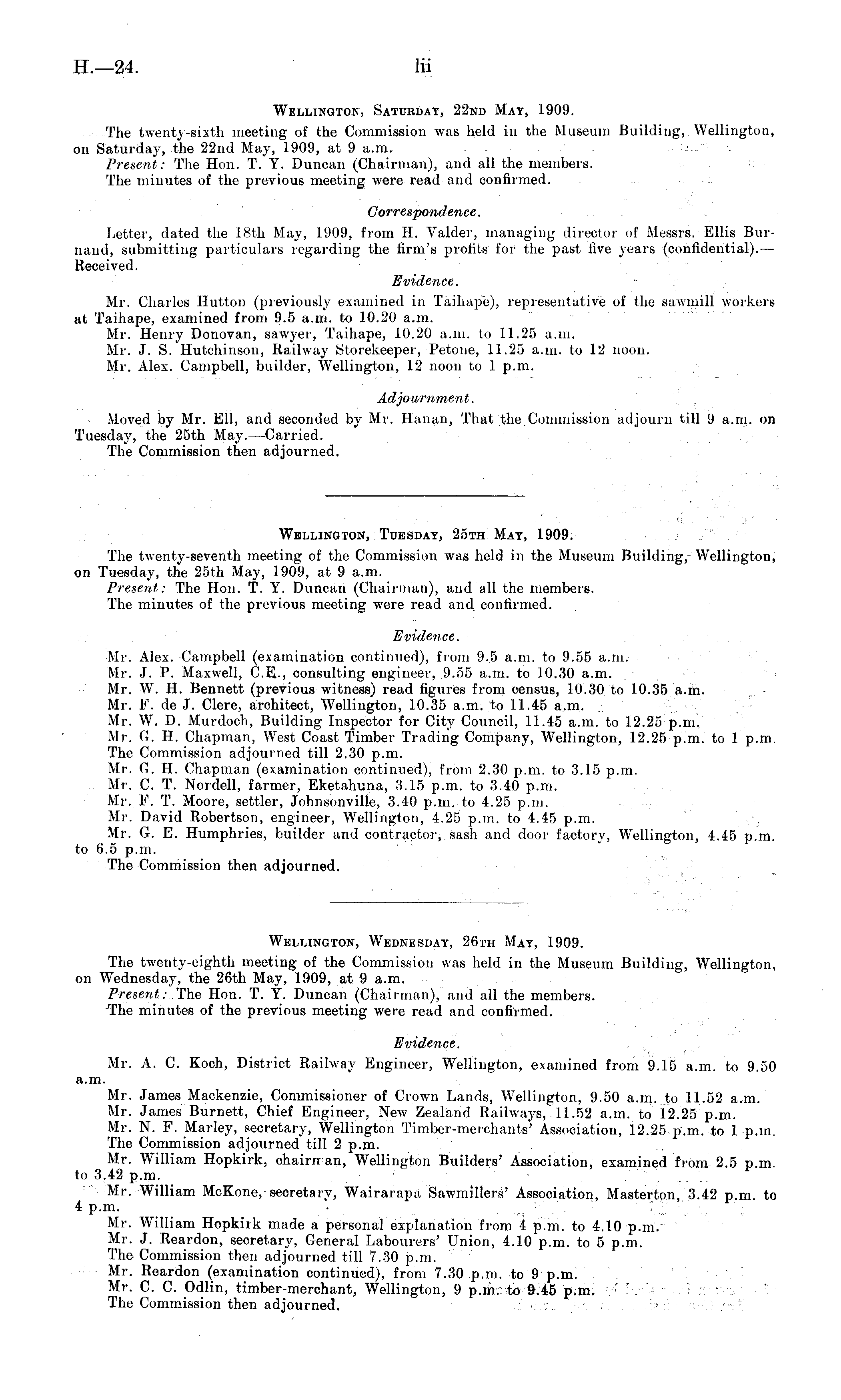 Wellington, Saturday, 22nd Mat, 1909. The twenty-sixth meeting of the Commission was held in the Museum Building, Wellington, on Saturday, the 22nd May, 1909, at 9 a.m. Present: The Hon. T. Y. Duncan (Chairman), and all the members. The minutes of the previous meeting were read and confirmed. Correspondence. Letter, dated the 18th May, 1909, from H. Valder, managing director of Messrs. Ellis Burnaud, submitting particulars regarding the firm's profits for the past five years (confidential). — Received. Evidence. Mr. Charles Hutton (previously examined in Taihape), representative of the sawmill workers at Taihape, examined from 9.5 a.m. to 10.20 a.m. Mr. Henry Donovan, sawyer, Taihape, 10.20 a.m. to 11.25 a.m. Mr. J. S. Hutchinson, Railway Storekeeper, Petone, 11.25 a.m. to 12 noon. Mr. Alex. Campbell, builder, Wellington, 12 noon to 1 p.m. Adjournment. Moved by Mr. Ell, and seconded by Mr. Hanan, That the Commission adjourn till 9 a.m. on Tuesday, the 25th May.—Carried. The Commission then adjourned.