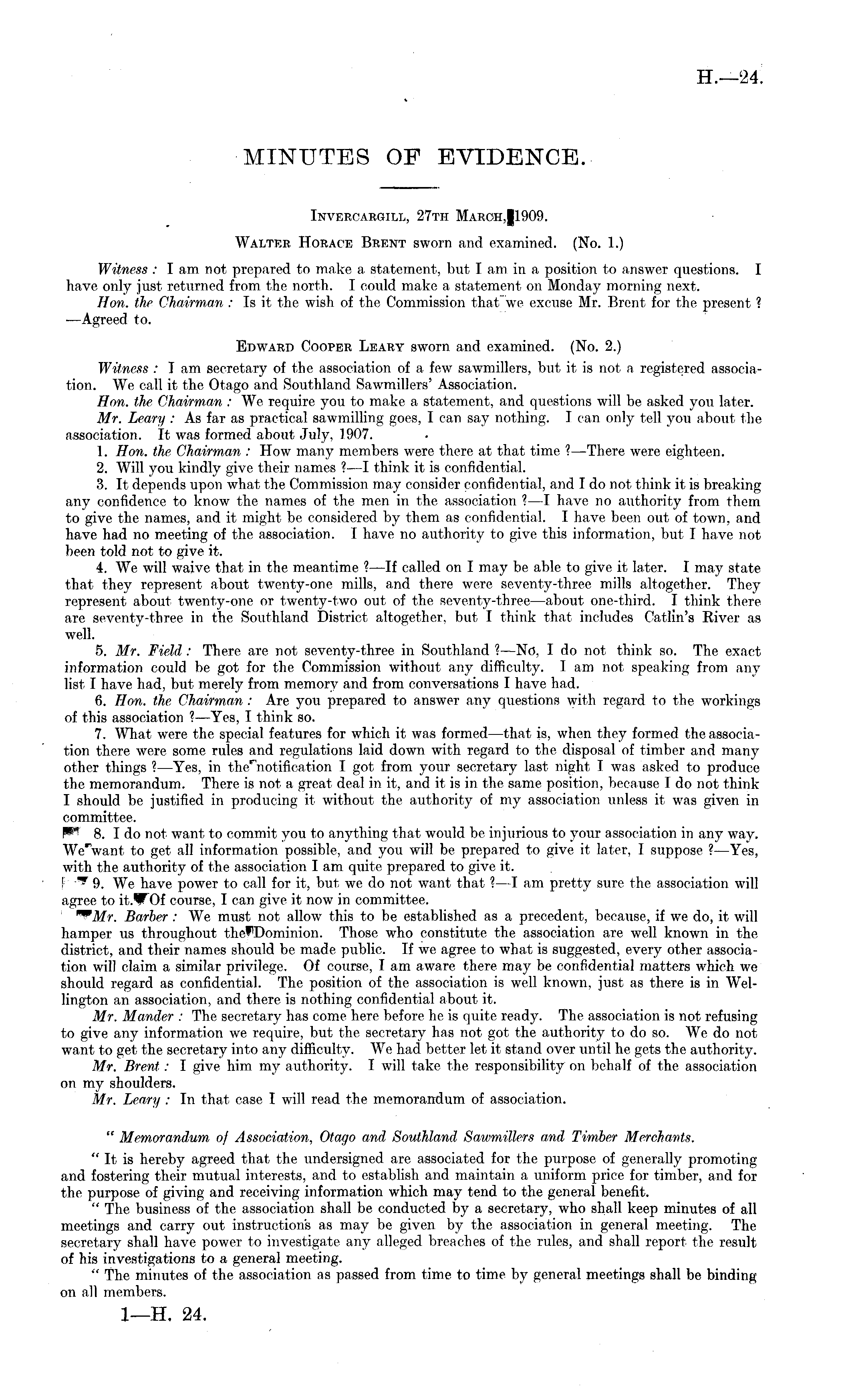 Invercargtll, 27th March,|l9o9. Walter Horace Brent sworn and examined. (No. 1.) Witness : lam not prepared to make a statement, but lamin a position to answer questions. I have only just returned from the north. I could make a statement on Monday morning next. Hon. the Chairman : Is it the wish of the Commission that we excuse Mr. Brent for the present ? —Agreed to. Edward Cooper Leary sworn and examined. (No. 2.) Witness : T am secretary of the association of a few sawmillers, but it is not a registered association. We call it the Otago and Southland Sawmillers' Association. Hon. the Chairman : We require you to make a statement, and questions will be asked you later. Mr. Leary : As far as practical sawmilling goes, I can say nothing. 1 can only tell you about the association. It was formed about July. 1907. 1. Hon. the. Chairman : How many members were there at that time ?—There were eighteen. 2. Will you kindly give their names ?—I think it is confidential. 3. It depends upon what the Commission may consider confidential, and I do not think it is breaking any confidence to know the names of the men in the association ?—I have no authority from them to give the names, and it might be considered by them as confidential. I have been out of town, and have had no meeting of the association. I have no authority to give this information, but I have not been told not to give it. 4. We will waive that in the meantime ?—lf called on I may be able to give it later. I may state that they represent about twenty-one mills, and there were seventy-three mills altogether. They represent about twenty-one or twenty-two out of the seventy-three —about one-third. I think there are seventy-three in the Southland District altogether, but I think that includes Catlin's River us well. 5. Mr. Field: There are not seventy-three in Southland ? —No, Ido not think so. The exact information could be got for the Commission without any difficulty. I am not speaking from any list T have had, but merely from memory and from conversations I have had. 6. Hon. the Chairman: Are you prepared to answer any questions with regard to the workings of this association ?—Yes, I think so. 7. What were the special features for which it was formed —that is, when they formed the association there were some rules and regulations laid down with regard to the disposal of timber and many other things ? —Yes, in the""notification I got from your secretary last night I was asked to produce the memorandum. There is not a great deal in it, and it is in the same position, because Ido not think I should be justified in producing it without the authority of my association unless it was given in committee. F* , 8. Ido not want to commit you to anything that would be injurious to your association in any way. We'Vant to get all information possible, and you will be prepared to give it later, I suppose ?—Yes, with the authority of the association I am quite prepared to give it. ! 9. We have power to call for it, but we do not want that ?—I am pretty sure the association will agree to it.VOf course, I can give it now in committee. " m Mr. Barber : We must not allow this to be established as a precedent, because, if we do, it will hamper us throughout Those who constitute the association arc well known in the district, and their names should be made public. If we agree to what is suggested, every other association will claim a similar privilege. Of course, lam aware there may be confidential matters which we should regard as confidential. The position of the association is well known, just as there is in Wellington an association, and there is nothing confidential about it. Mr. Mander : The secretary has come here before he is quite ready. The association is not refusing to give any information we require, but the secretary has not got the authority to do so. We do not want to get the secretary into any difficulty. We had better let it stand over until he gets the authority. Mr. Brent: I give him my authority. I will take the responsibility on behalf of the association on my shoulders. Mr. Leary : In that case T will read the memorandum of association. " Memorandum of Association, Otago and Southland Sawmillers and Timber Merchants. " It is hereby agreed that the undersigned are associated for the purpose of generally promoting and fostering their mutual interests, and to establish and maintain a uniform price for timber, and for the purpose of giving and receiving information which may tend to the general benefit. " The business of the association shall be conducted by a secretary, who shall keep minutes of all meetings and carry out instructions as may be given by the association in general meeting. The secretary shall have power to investigate any alleged breaches of the rules, and shall report the result of his investigations to a general meeting. " The minutes of the association as passed from time to time by general meetings shall be binding on all members.