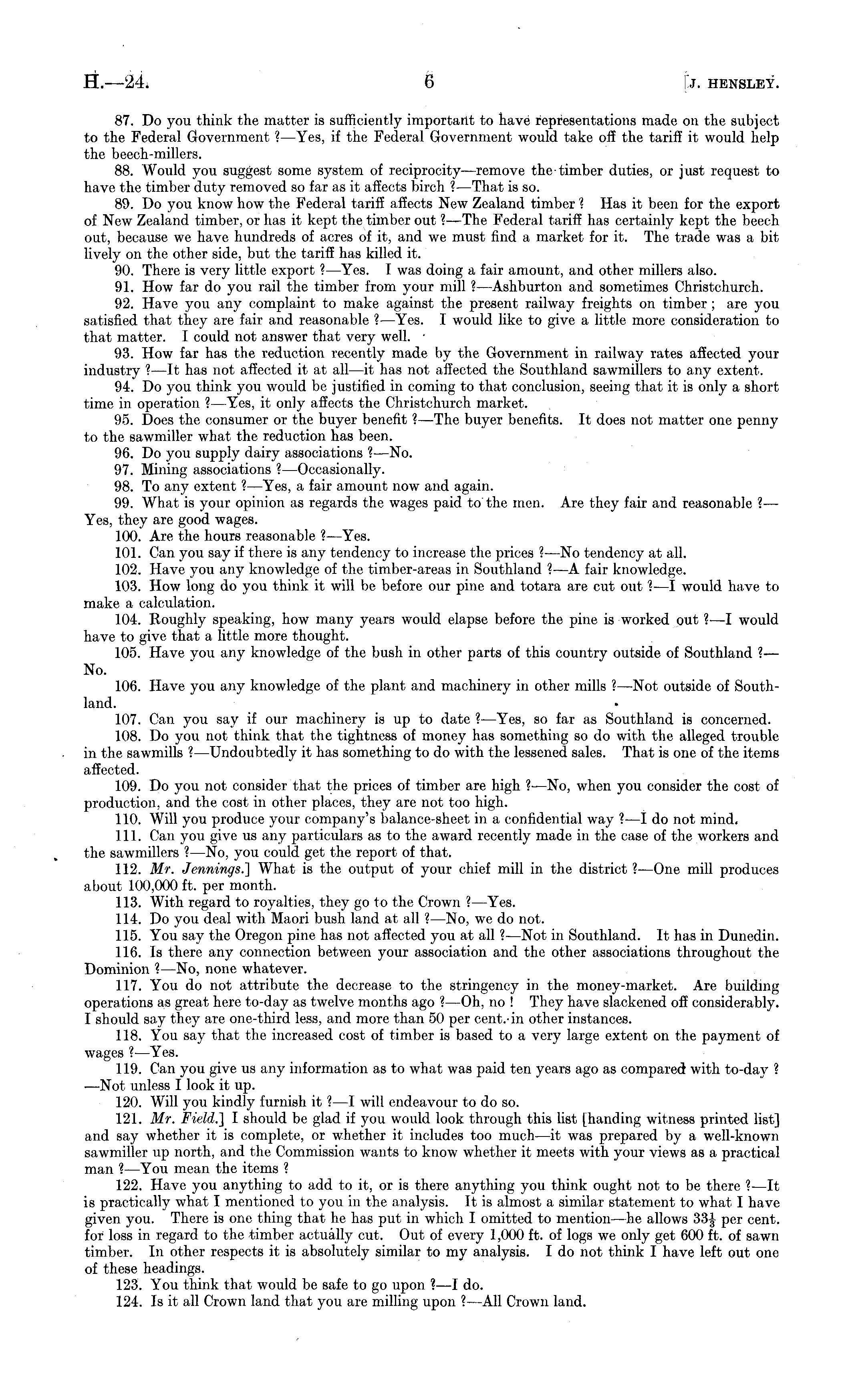 87. Do you think the matter is sufficiently important to have representations made on the subject to the Federal Government ? —Yes, if the Federal Government would take off the tariff it would help the beech-millers. 88. Would you suggest some system of reciprocity—remove the timber duties, or just request to have the timber duty removed so far as it affects birch ? —That is so. 89. Do you know how the Federal tariff affects New Zealand timber ? Has it been for the export of New Zealand timber, or has it kept the timber out ?—The Federal tariff has certainly kept the beech out, because we have hundreds of acres of it, and we must find a market for it. The trade was a bit lively on the other side, but the tariff has killed it. 90. There is very little export ?—Yes. I was doing a fair amount, and other millers also. 91. How far do you rail the timber from your mill ? —Ashburton and sometimes Christchurch. 92. Have you any complaint to make against the present railway freights on timber ; are you satisfied that they are fair and reasonable ?—Yes. I would like to give a little more consideration to that matter. I could not answer that very well. ■ 93. How far has the reduction recently made by the Government in railway rates affected your industry ? —lt has not affected it at all—it has not affected the Southland sawmillers to any extent. 94. Do you think you would be justified in coming to that conclusion, seeing that it is only a short time in operation ?—Yes, it only affects the Christchurch market. 95. Does the consumer or the buyer benefit ?—The buyer benefits. It does not matter one penny to the sawmiller what the reduction has been. 96. Do you supply dairy associations ?—No. 97. Mining associations ? —Occasionally. 98. To any extent ?—Yes, a fair amount now and again. 99. What is your opinion as regards the wages paid to the men. Are they fair and reasonable ? — Yes, they are good wages. 100. Are the hours reasonable ? —Yes. 101. Can you say if there is any tendency to increase the prices ?—No tendency at all. 102. Have you any knowledge of the timber-areas in Southland ? —A fair knowledge. 103. How long do you think it will be before our pine and totara are cut out ?—I would have to make a calculation. 104. Roughly speaking, how many years would elapse before the pine is worked out ?—I would have to give that a little more thought. 105. Have you any knowledge of the bush in other parts of this country outside of Southland ? — No. 106. Have you any knowledge of the plant and machinery in other mills ? —Not outside of Southland. 107. Can you say if our machinery is up to date ?—Yes, so far as Southland is concerned. 108. Do you not think that the tightness of money has something so do with the alleged trouble in the sawmills ? —Undoubtedly it has something to do with the lessened sales. That is one of the items affected. 109. Do you not consider that the prices of timber are high ?■ —No, when you consider the cost of production, and the cost in other places, they are not too high. 110. Will you produce your company's balance-sheet in a confidential way ?—I do not mind. 111. Can you give us any particulars as to the award recently made in the case of the workers and the sawmillers ? —No, you could get the report of that. 112. Mr. Jennings.] What is the output of your chief mill in the district ? —One mill produces about 100,000 ft. per month. 113. With regard to royalties, they go to the Crown ?—Yes. 114. Do you deal with Maori bush land at all ?—No, we do not. 115. You say the Oregon pine has not affected you at all ? —Not in Southland. It has in Dunedin. 116. Is there any connection between your association and the other associations throughout the Dominion ?—No, none whatever. 117. You do not attribute the decrease to the stringency in the money-market. Are building operations as great here to-day as twelve months ago ? —Oh, no ! They have slackened off considerably. I should say they are one-third less, and more than 50 per cent.-in other instances. 118. You say that the increased cost of timber is based to a very large extent on the payment of wages ? —Yes. 119. Can you give us any information as to what was paid ten years ago as compared with to-day ? —Not unless I look it up. 120. Will you kindly furnish it ?—I will endeavour to do so. 121. Mr. Field.] I should be glad if you would look through this list [handing witness printed list] and say whether it is complete, or whether it includes too much —it was prepared by a well-known sawmiller up north, and the Commission wants to know whether it meets with your views as a practical man ?—You mean the items ? 122. Have you anything to add to it, or is there anything you think ought not to be there ?—lt is practically what I mentioned to you in the analysis. It is almost a similar statement to what I have given you. There is one thing that he has put in which I omitted to mention —he allows per cent, for loss in regard to the timber actually cut. Out of every 1,000 ft. of logs we only get 600 ft. of sawn timber. In other respects it is absolutely similar to my analysis. Ido not think I have left out one of these headings. 123. You think that would be safe to go upon ?—I do. 124. Is it all Crown land that you are milling upon ?—All Crown land.