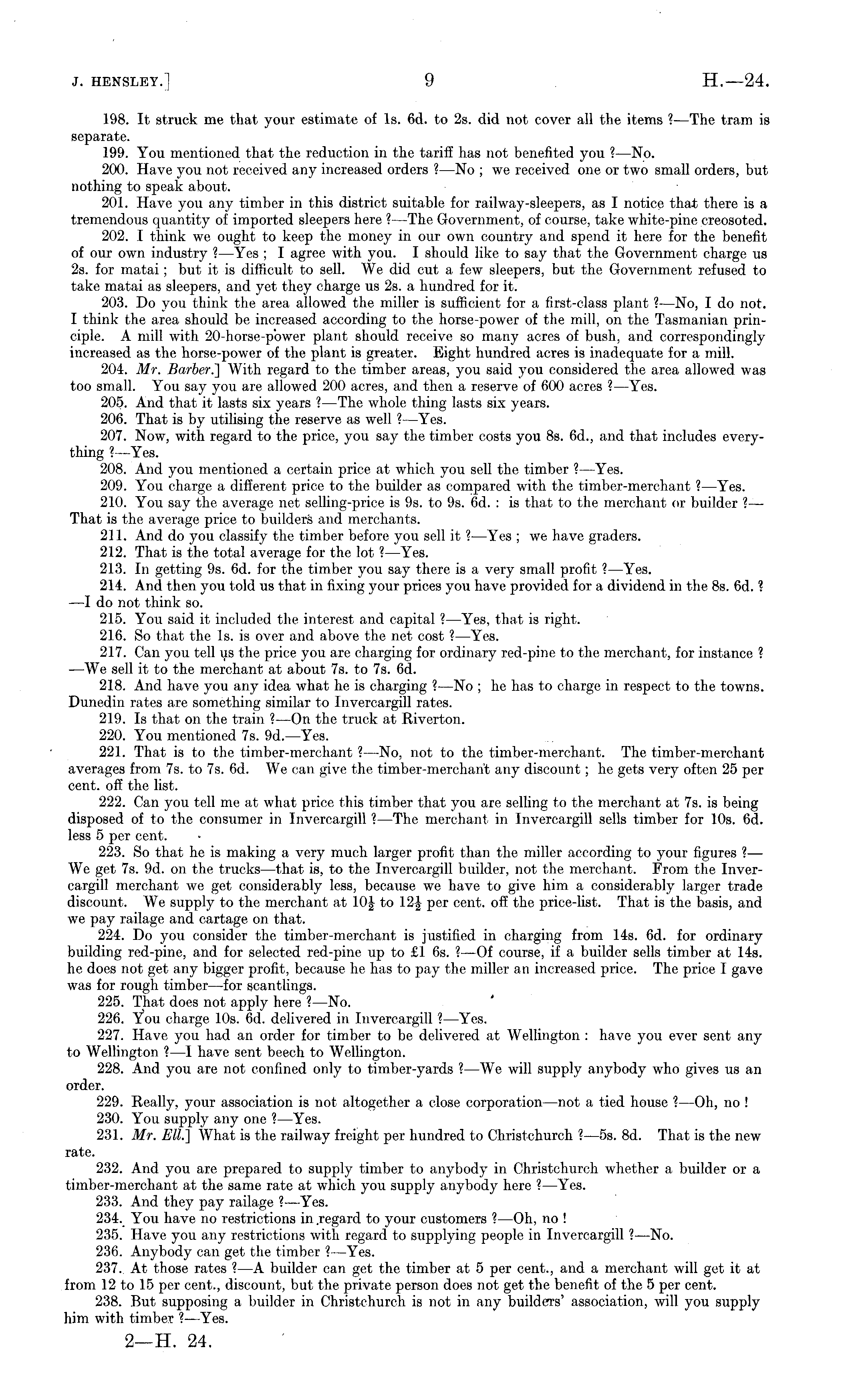 198. It struck me that your estimate of Is. 6d. to 2s. did not cover all the items ? —The tram is separate. 199. You mentioned that the reduction in the tariff has not benefited you ?—No. 200. Have you not received any increased orders ? —No ; we received one or two small orders, but nothing to speak about. 201. Have you any timber in this district suitable for railway-sleepers, as I notice that there is a tremendous quantity of imported sleepers here ? —The Government, of course, take, white-pine creosoted. 202. I think we ought to keep the money in our own country and spend it here for the benefit of our own industry ? —Yes ; I agree with you. I should like to say that the Government charge us 2s. for matai; but it is difficult to sell. We did cut a few sleepers, but the Government refused to take matai as sleepers, and yet they charge us 2s. a hundred for it. 203. Do you think the area allowed the miller is sufficient for a first-class plant ? —No, I do not. I think the area should be increased according to the horse-power of the mill, on the Tasmanian principle. A mill with 20-horse-p'ower plant should receive so many acres of bush, and correspondingly increased as the horse-power of the plant is greater. Eight hundred acres is inadequate for a mill. 204. Mr. Barber.] With regard to the timber areas, you said you considered the area allowed was too small. You say you are allowed 200 acres, and then a reserve of 600 acres ?—Yes. 205. And that it lasts six years ? —The whole thing lasts six years. 206. That is by utilising the reserve as well ?—Yes. 207. Now, with regard to the price, you say the timber costs you Bs. 6d., and that includes everything ?—Yes. 208. And you mentioned a certain price at which you sell the timber ?—Yes. 209. You charge a different price to the builder as compared with the timber-merchant ? —Yes. 210. You say the average net selling-price is 9s. to 9s. 6d. : is that to the merchant or builder ?— That is the average price to builders and merchants. 2] 1. And do you classify the timber before you sell it ?—Yes ; we have graders. 212. That is the total average for the lot ?—Yes. 213. In getting 9s. 6d. for the timber you say there is a very small profit ? —Yes. 214. And then you told us that in fixing your prices you have provided for a dividend in the Bs. 6d. ? —I do not think so. 215. You said it included the interest and capital ? —Yes, that is right. 216. So that the Is. is over and above the net cost ?—Yes. 217. Can you tell us the price you are charging for ordinary red-pine to the merchant, for instance ? —We sell it to the merchant at about 7s. to 7s. 6d. 218. And have you any idea what he is charging ?—No ; he has to charge in respect to the towns. Dunedin rates are something similar to Invercargill rates. 219. Is that on the train ? —On the truck at Riverton. 220. You mentioned 7s. 9d.— Yes. 221. That is to the timber-merchant ? —No, not to the timber-merchant. The timber-merchant averages from 7s. to 7s. 6d. We can give the timber-merchant any discount; he gets very often 25 per cent, off the list. 222. Can you tell me at what price this timber that you are selling to the merchant at 7s. is being disposed of to the consumer in Invercargill ?—The merchant in Invercargill sells timber for 10s. 6d. less 5 per cent. 223. So that he is making a very much larger profit than the miller according to your figures ?— We get 7s. 9d. on the trucks—that is, to the Invercargill builder, not the merchant. From the Invercargill merchant we get considerably less, because we have to give him a considerably larger trade discount. We supply to the merchant at 10J to 12| per cent, off the price-list. That is the basis, and we pay railage and cartage on that. 224. Do you consider the timber-merchant is justified in charging from 14s. 6d. for ordinary building red-pine, and for selected red-pine up to £1 6s. ?—Of course, if a builder sells timber at 14s. he does not get any bigger profit, because he has to pay the miller an increased price. The price I gave was for rough timber —for scantlings. 225. That does not apply here ?—No. 226. You charge 10s. 6d. delivered in Invercargill ? —Yes. 227. Have you had an order for timber to be delivered at Wellington : have you ever sent any to Wellington ? —I have sent beech to Wellington. 228. And you are not confined only to timber-yards ? —We will supply anybody who gives us an order. 229. Really, your association is not altogether a close corporation—not a tied house ? —Oh, no ! 230. You supply any one ? —Yes. 231. Mr. Ell.] What is the railway freight per hundred to Christchurch I —ss. Bd. That is the new rate. 232. And you are prepared to supply timber to anybody in Christchurch whether a builder or a timber-merchant at the same rate at which you supply anybody here ? —Yes. 233. And they pay railage ? —Yes. 234. You have no restrictions in .regard to your customers ?—Oh, no ! 235. Have you any restrictions with regard to supplying people in Invercargill ? —No. 236. Anybody can get the timber ? —Yes. 237.. At those rates ?—A builder can get the timber at 5 per cent., and a merchant will get it at from 12 to 15 per cent., discount, but the private person does not get the benefit of the 5 per cent. 238. But supposing a builder in Christchurch is not in any buildeTs' association, will you supply him with timber ? —Yes.