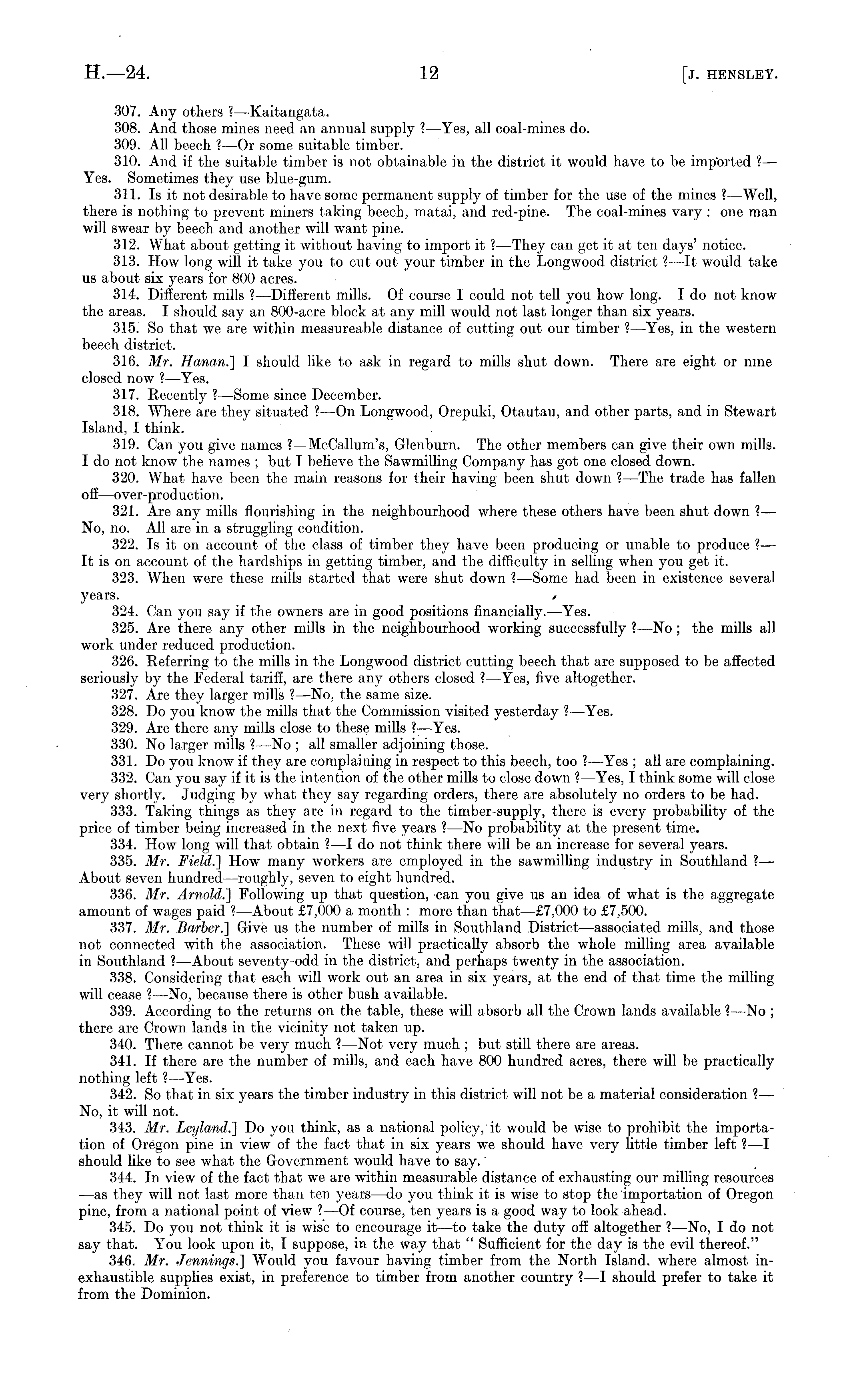 307. Any others ?—Kaitangata. 308. And those mines need an annual supply ? —Yes, all coal-mines do. 309. All beech ?—Or some suitable timber. 310. And if the suitable timber is not obtainable in the district it would have to be imported ? — Yes. Sometimes they use blue-gum. 311. Is it not desirable to have some permanent supply of timber for the use of the mines ?— Well, there is nothing to prevent miners taking beech, matai, and red-pine. The coal-mines vary : one man will swear by beech and another will want pine. 312. What about getting it without having to import it ?—They can get it at ten days' notice. 313. How long will it take you to cut out your timber in the Longwood district ?—lt would take us about six years for 800 acres. 314. Different mills ?—Different mills. Of course I could not tell you how long. Ido not know the areas. I should say an 800-acre block at any mill would not last longer than six years. 315. So that we are within measureable distance of cutting out our timber ?—Yes, in the western beech district. 316. Mr. Hanan.] I should like to ask in regard to mills shut down. There are eight or nine closed now ? —Yes. 317. Recently ? —Some since December. 318. Where are they situated ?—On Longwood, Orepuki, Otautau, and other parts, and in Stewart Island, I think. 319. Can you give names ? —McCallum's, Glenburn. The other members can give their own mills. I do not know the names ; but I believe the Sawmilling Company has got one closed down. 320. What have been the main reasons for their having been shut down ? —The trade has fallen off —over-production. 321. Are any mills flourishing in the neighbourhood where these others have been shut down ?— No, no. All are in a struggling condition. 322. Is it on account of the class of timber they have been producing or unable to produce ?— It is on account of the hardships in getting timber, and the difficulty in selling when you get it. 323. When were these mills started that were shut down ? —Some had been in existence several years. , 324. Can you say if the owners are in good positions financially.—Yes. 325. Are there any other mills in the neighbourhood working successfully ?—No ; the mills all work under reduced production. 326. Referring to the mills in the Longwood district cutting beech that are supposed to be affected seriously by the Federal tariff, are there any others closed ?—Yes, five altogether. 327. Are they larger mills ? —No, the same size. 328. Do you know the mills that the Commission visited yesterday ? —Yes. 329. Are there any mills close to these mills ?—Yes. 330. No larger mills ? —No ; all smaller adjoining those. 331. Do you know if they are complaining in respect to this beech, too ? —Yes ; all are complaining. 332. Can you say if it is the intention of the other mills to close down ? —Yes, I think some will close very shortly. Judging by what they say regarding orders, there are absolutely no orders to be had. 333. Taking things as they are in regard to the timber-supply, there is every probability of the price of timber being increased in the next five years ? —No probability at the present time. 334. How long will that obtain ? —I do not think there will be an increase for several years. 335. Mr. Field.] How many workers are employed in the sawmilling industry in Southland ? — About seven hundred —roughly, seven to eight hundred. 336. Mr. Arnold.] Following up that question, 'Can you give us an idea of what is the aggregate amount of wages paid ?—About £7,000 a month : more than that —£7,000 to £7,500. 337. Mr. Barber.] Give us the number of mills in Southland District —associated mills, and those not connected with the association. These will practically absorb the whole milling area available in Southland ?—About seventy-odd in the district, and perhaps twenty in the association. 338. Considering that each will work out an area in six years, at the end of that time the milling will cease ?—No, because there is other bush available. 339. According to the returns on the table, these will absorb all the Crown lands available ? —No ; there are Crown lands in the vicinity not taken up. 340. There cannot be very much ?—Not very much ; but still there are areas. 341. If there are the number of mills, and each have 800 hundred acres, there will be practically nothing left ?— Yes. 342. So that in six years the timber industry in this district will not be a material consideration ? — No, it will not. 343. Mr. Leyland.] Do you think, as a national policy, it would be wise to prohibit the importation of Oregon pine in view of the fact that in six years we should have very little timber left ? —I should like to see what the Government would have to say. 344. In view of the fact that we are within measurable distance of exhausting our milling resources —as they will not last more than ten years —do you think it is wise to stop the importation of Oregon pine, from a national point of view ? —Of course, ten years is a good way to look ahead. 345. Do you not think it is wise to encourage it —to take the duty off altogether ? —No, I do not say that. You look upon it, I suppose, in the way that " Sufficient for the day is the evil thereof." 346. Mr. Jennings.] Would you favour having timber from the North Island, where almost inexhaustible supplies exist, in preference to timber from another country ?—I should prefer to take it from the Dominion.