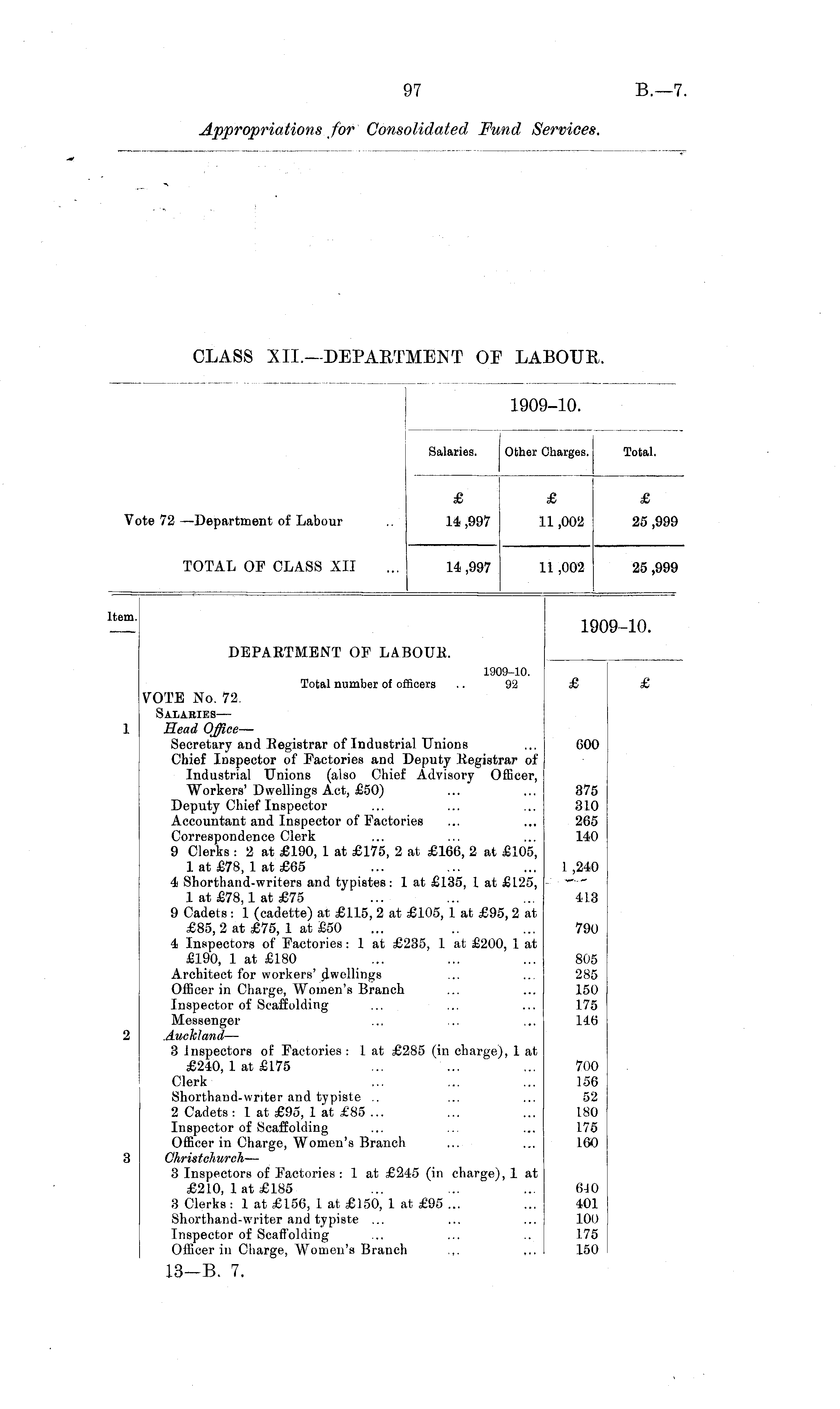 1909-10. Salaries. Other Charges. Total. £ £ £ Vote 72 —Department of Labour 14,997 1,002 25 ,999 TOTAL OF CLASS XII 14 ,997 1,002 25 ,999 Item. 109-10. DEPARTMENT OF LABOUR. 1909-10. Total number of offioers .. 92 £ £ VOTE No. 72. Salabies— Head Office — Secretary and Registrar of Industrial Unions Chief Inspector of Factories and Deputy Registrar of Industrial Unions (also Chief Advisory Officer, Workers' Dwellings Act, £50) Deputy Chief Inspector Accountant and Inspector of Factories Correspondence Clerk 9 Clerks : 2 at £190, 1 at £175, 2 at £166, 2 at £105, 1 at £78, 1 at £65 4 Shorthand-writers and typistes: 1 at £135, 1 at £125, 1 at £78,1 at £75 9 Cadets: 1 (cadette) at £115, 2 at £105, 1 at £95, 2 at £85, 2 at £75, 1 at £50 4 Inspectors of Factories: 1 at £235, 1 at £200, 1 at £190, 1 at £180 Architect for workers' dwellings Officer in Charge, Women's Branch Inspector of Scaffolding Messenger Auckland — 3 Inspectors of Factories : 1 at £285 (in charge), 1 at £240, 1 at £175 Clerk Shorthand-writer and typiste .. 2 Cadets : 1 at £95, 1 at £85 ... Inspector of Scaffolding Officer in Charge, Women's Branch Christchureh — 3 Inspectors of Factories : 1 at £245 (in charge), 1 at £210, 1 at £185 3 Clerks : 1 at £156, 1 at £150, 1 at £95 ... Shorthand-writer and typiste ... Inspector of Scaffolding Officer in Charge, Women's Branch 600 375 310 265 140 1,240 413 790 805 285 150 175 146 700 156 52 180 175 160 610 401 100 175 150