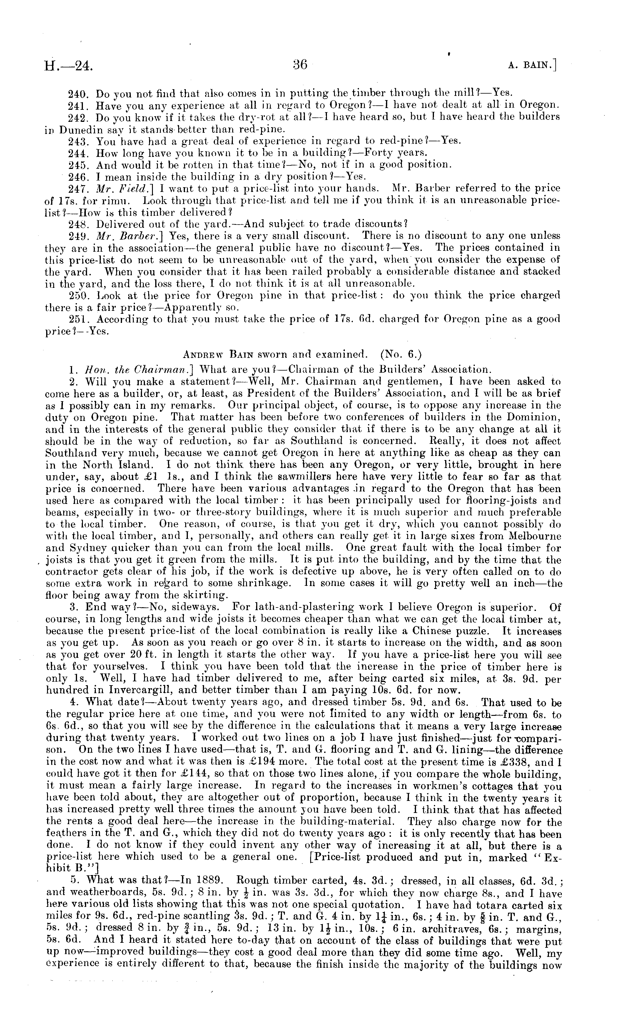 240. Do you not find that also conies in in putting the timber through the mill?— Yes. 241. Have you any experience at all in regard to Oregon?—l have not dealt at all in Oregon. 242. Do you know if it takes the dry-rot at all?- 1 have heard so, but I have heard the builders in Dunedin say it stands better than red-pine. 243. You have had a great deal of experience in regard io red-pine?—-Yes. 244. How long have you known it to be in a building?— Forty years. 24"). And would it be rotten in that time?—No, not if in a good position. 246. I mean inside the building in a dry position?— Yes. 247. Mr. Field.] 1 waul to put a price-list into your hands. Mr. Barber referred to the price of 17s. for rimu. Look through that price-list and tell me if you think it is an unreasonable pricelist?—How is this timber delivered? 248. Delivered out of the yard. —And subject to trade discounts? 249. Mr. Barber.] Yes, there is a very small discount. There is no discount to any one unless they are in the association —the general public have no discount?— Yes. The prices contained in this price-list do not seem to be unreasonable out of the yard, when you consider the expense of the yard. When you consider that it has been railed probably a considerable distance and stacked in the yard, and the loss there, 1 do not think it is at all unreasonable. 250. Look at the price for Oregon pine in that price-list : do you think the price charged there is a fair price?— Apparently so. 251. According to that you must take the price of 17s. fid. charged for Oregon pine as a good price?— -Yes. Andrew Bain sworn and examined. (No. 6.) 1. Hon. the Chairman.] What are you?— Chairman of the Builders' Association. 2. Will you make a statement? —Well, Mr. Chairman and gentlemen, 1 have been asked to come here as a builder, or, at least, as President of the Builders' Association, and I will be as brief as J possibly can in my remarks. Our principal object, of course, is to oppose any increase in the duty on Oregon pine. That matter has been before two conferences of builders in the Dominion, and in the interests of the general public they consider that if there is to be am , change at all it should be in the way of reduction, so far as Southland is concerned. Really, it does not affect Southland very much, because we cannot get Oregon in here at anything like as cheap as they can in the North Island. I do not think there has been any Oregon, or very little, brought in here under, say, about £1 Is., and I think the sawmillers here have very little to fear so far as that price is concerned. There have been various advantages Jn regard to the Oregon that has been used here as compared with the local timber : it has been principally used for flooring-joists and beams, especially in two- or three-story buildings, where it is much superior and much preferable to the local timber. One reason, of course, is that you get it dry, which you cannot possibly do with the local timber, and I, personally, and others can really get it in large sixes from Melbourne ami Sydney quicker than you can from the local mills. One great fault with the local timber for joists is that you get it green from the mills. It is put into the building, and by the time that the contractor gets clear of his job, if the work is defective up above, he is very often called on to do some extra work in regard to some shrinkage. In some cases it will go pretty well an inch—the floor being away from the skirting. 3. End wa} , ?—No, sideways. For lath-aiid-plastering work I believe Oregon is superior. Of course, in long lengths and wide joists it becomes cheaper than what we can get the local timber at, because the present price-list of the local combination is really like a Chinese puzzle. It increases as you get up. As soon as you reach or go over 8 in. it starts to increase on the width, and as soon as you get over 20 ft. in length it starts the other way. If you have a price-list here you will see that for yourselves. I think you have been told that the increase in the price of timber here is only Is. Well, I have had timber delivered to me, after being carted six miles, at 3s. 9d. per hundred in Invercargill, and better timber than I am paying 10s. 6d. for now. 4. What date? —About twenty years ago, and dressed timber ss. 9d. and 6s. That used to be the regular price here at one time, and you were not limited to any width or length —from 6s. to 6s. 6d., so that you will see by the difference in the calculations that it means a very large increase during that twenty years. I worked out two lines on a job I have just finished—just for-compari-son. On the two lines I have used —that is, T. and G. flooring and T. and G. lining—the difference in the cost now and what it was then is £194 more. The total cost at the present time is .£338, and I could have got it then for £144, so that on those two lines alone, if you compare the whole building, it must mean a fairly large increase. In regard to the increases in workmen* cottages that you have been told about, they are altogether out of proportion, because I think in the twenty years it has increased pretty well three times the amount you have been told. I think that that has affected the rents a good deal here—the increase in the building-material. They also charge now for the feathers in the T. and G., which they did not do twenty years ago : it is only recently that has been done. I do not know if they could invent any other way of increasing it at all, but there is a price-list here which used to be a general one. [Price-list produced and put in, marked " Exhibit B."] 5. What was that? —In 1889. Rough timber carted, 4s. 3d.; dressed, in all classes, 6d. 3d.; and weatherboards, ss. 9d. ; 8 in. by \ in. was 3s. 3d., for which they now charge Bs., and I have here various old lists showing that this was not one special quotation. I have had totara carted sixmiles for 9s. 6d., r