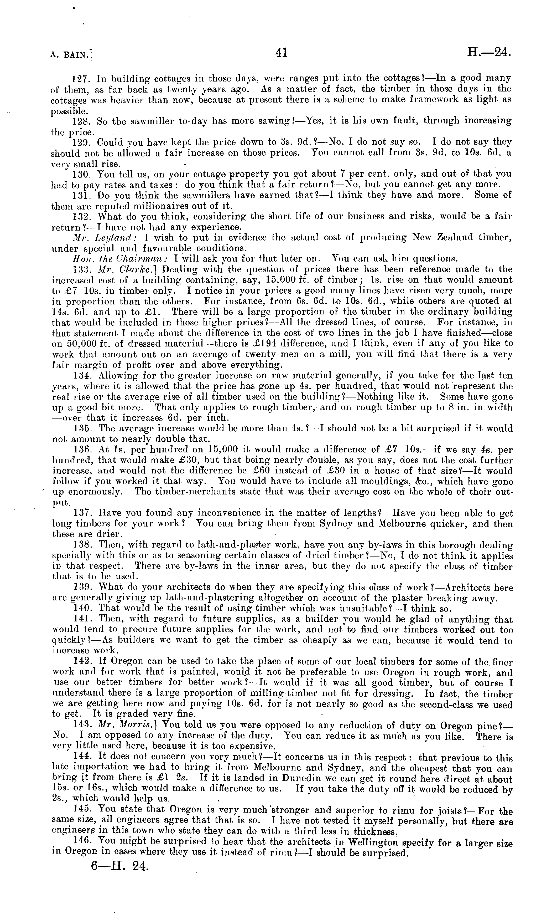 127. In building cottages in those days, were ranges put into the cottages?—ln a good many of them, as far back as twenty years ago. As a matter of fact, the timber in those days in the cottages was heavier than now, because at present there is a scheme to make framework as light as possible. 128. So the sawmiller to-day has more sawing?— Yes, it is his own fault, through increasing the price. 129. Could you have kept the price down to 3s. 9d. I —No, Ido not say so. Ido not say they should not be allowed a fair increase on those prices. You cannot call from 3s. 9d. to 10s. 6d. a very small rise. I'M). You tell us, on your cottage property you got about 7 per cent, only, and out of that you had to pay rates and taxes : do you think that a fair return?—No, but you cannot get any more. 131. Do you think the sawmillers have earned that? —I think they have and more. Some of them are reputed millionaires out of it. 132. What do you think, considering the short life of our business and risks, would be a fair return ? —I have not had any experience. Mr. Leyland: I wish to put in evidence the actual cost of producing New Zealand timber, under special and favourable conditions. llmi. the Chairman: I will ask you for that later on. You can ask him questions. 133. Mr. Clarke.] Dealing with the question of prices there has been reference made to the increased cost of a building containing, say, 15,000 ft. of timber; Is. rise on that would amount to £7 10s. in timber only. I notice in your prices a good many lines have risen very much, more in proportion than the others. For instance, from 6s. 6d. to 10s. 6d., while others are quoted at 14s. 6d. and up to £1. There will be a large proportion of the timber in the ordinary building that would be included in those higher prices?— All the dressed lines, of course. For instance, in that statement I made about the difference in the cost of two lines in the job I have finished —close on 50,000 ft. of dressed material—there is £194 difference, and I think, even if any of you like to work that amount out on an average of twenty men on a mill, you will find that there is a very fair margin of profit over and above everything. 134. Allowing for the greater increase on raw material generally, if you take for the last ten years, where it is allowed that the price has gone up 4s. per hundred, that would not represent the real rise or the average rise of all timber used on the building?— Nothing like it. Some have gone up a good bit more. That only applies to rough timber,-and on rough timber up to 8 in. in width —over that it increases 6d. per inch. 135. The average increase would be more than 4s. ?—I should not be a bit surprised if it would not amount to nearly double that. 136. At Is. per hundred on 15,000 it would make a difference of ,£7 10s. —if we say 4s. per hundred, that would make .£3O, but that being nearly double, as you say, does not the cost further increase, and would not the difference be .£6O instead of .£3O in a house of that size?—lt would follow if you worked it that way. You would have to include all mouldings, &c, which have gone up enormously. The timber-merchants state that was their average cost on the whole of their output. 137. Have you found any inconvenience in the matter of lengths? Have you been able to get long timbers for your work ?—You can bring them from Sydney and Melbourne quicker, and then these are drier. 138. Then, with regard to lath-and-plaster work, have you any by-laws in this borough dealing specially with this or as to seasoning certain classes of dried timber? —No, I do not think it applies in that respect. There are by-laws in the inner area, but they do not specify the class of timber that is to be used. 139. What do your architects do when they are specifying this class of work?— Architects here are generally giving up lath-and-plastering altogether on account of the plaster breaking away. 140. That would be the result of using timber which was unsuitable?—l think so. 141. Then, with regard to future supplies, as a builder you would be glad of anything that would tend to procure future supplies for the work, and not to find our timbers worked out too quickly?—As builders we want to get the timber as cheaply as wo can, because it would tend to increase work. 142. If Oregon can be used to take the place of some of our local timbers for some of the finer work and for work that is painted, would it not be preferable to use Oregon in rough work, and use our better timbers for better work?—lt would if it was all good timber, but of course I understand there is a large proportion of milling-timber not fit for dressing. In fact, the timber we are getting here now and paying 10s. 6d. for is not nearly so good as the second-class we used to get. It is graded very fine. 143. Mr. Morris.] You told us you were opposed to any reduction of duty on Oregon pine? No. lam opposed to any increase of the duty. You can reduce it as much as you like. There is very little used here, because it is too expensive. 144. It does not concern you very much?—lt concerns us in this respect: that previous to this late importation we had to bring it from Melbourne and Sydney, and the cheapest that you can bring it from there is £1 2s. If it is landed in Dunedin we can get it round here direct at about 15s. or 165., which would make a difference to us. If you take the duty off it would be reduced by 25., which would help us. 145. You state that Oregon is very much stronger and superior to rimu for joists?— For the same size, all engineers agree that that is so. I have not tested it myself personally, but there are engineers in this town who state they can do with a third less in thickness. 146. You might be surprised to hear that the architects in Wellington specify for a larger size in Oregon in cases where they use it instead of rimu? —I should be surprised.
